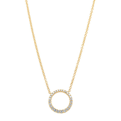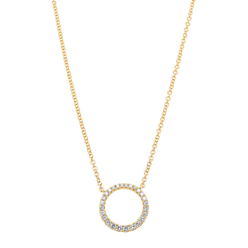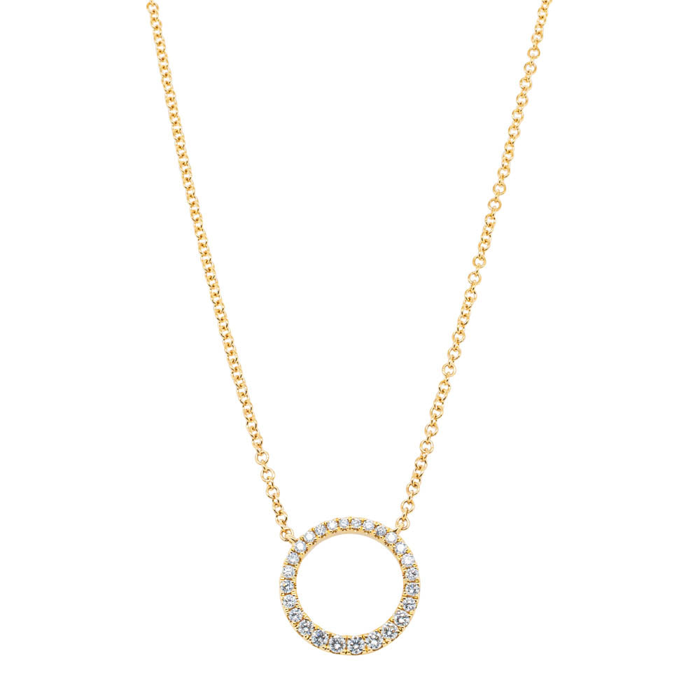 Aelia, her name of Latin origin meaning Sun. Representing the sun’s sphere of light, the endless curve of diamonds forms a perfect circle, suspended from a dainty cable chain.