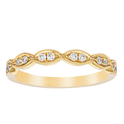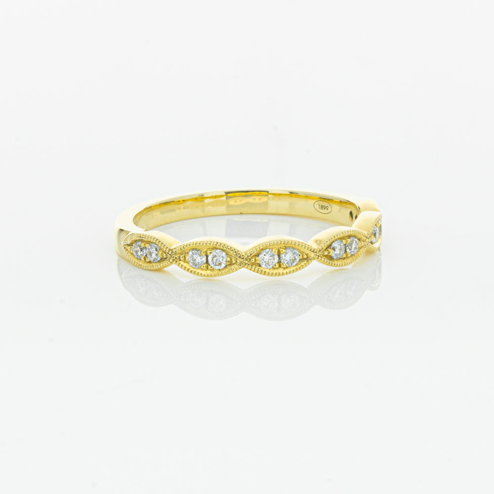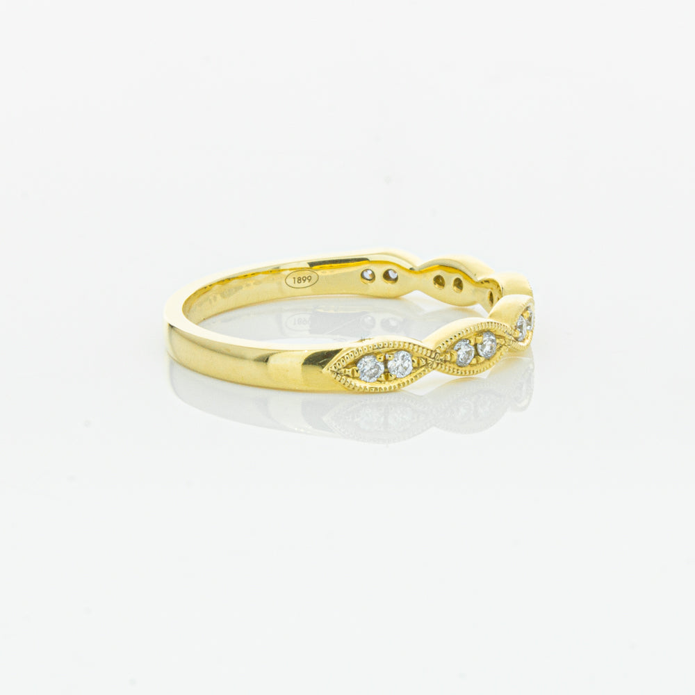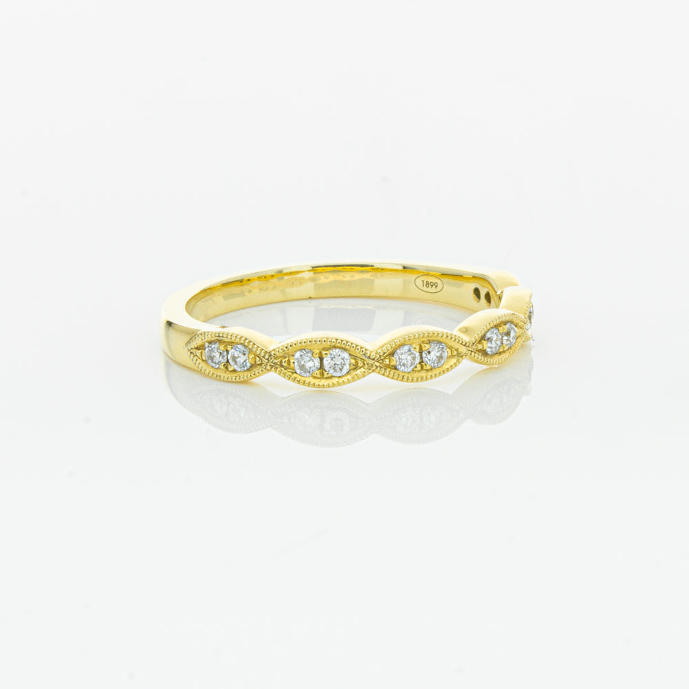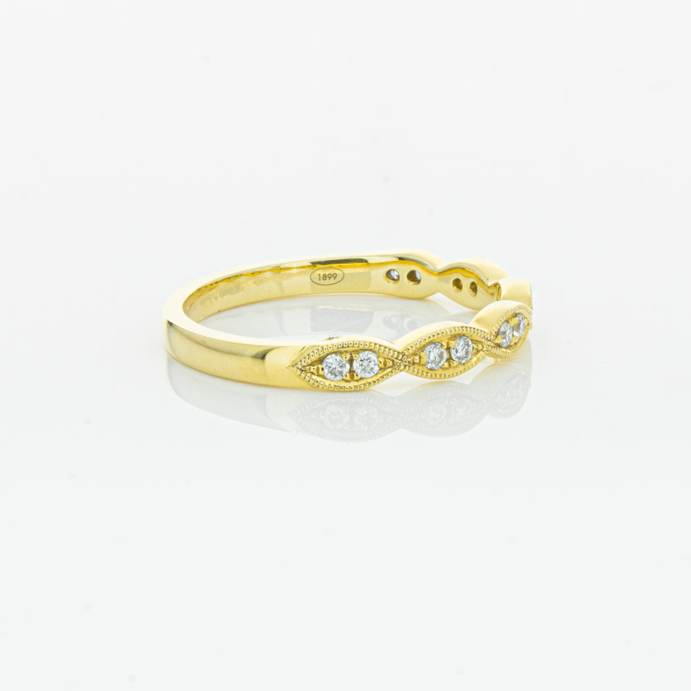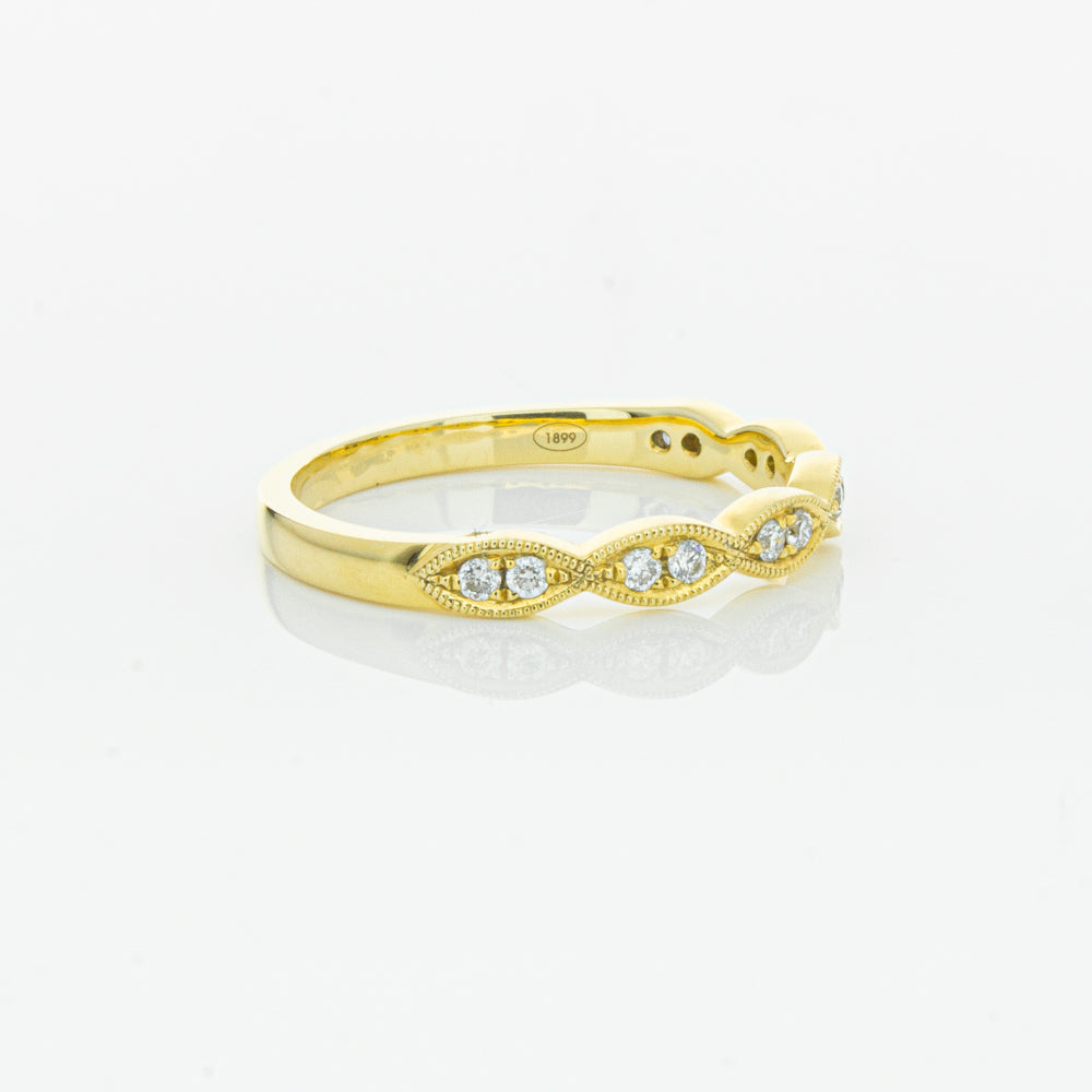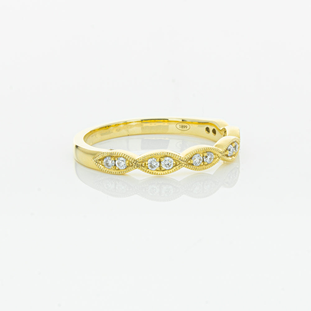 She will simply sparkle in this glittering 18ct yellow gold and diamond band. This elegant ring has been crafted with scalloped detailing, featuring twinkling round brilliant cut diamonds.