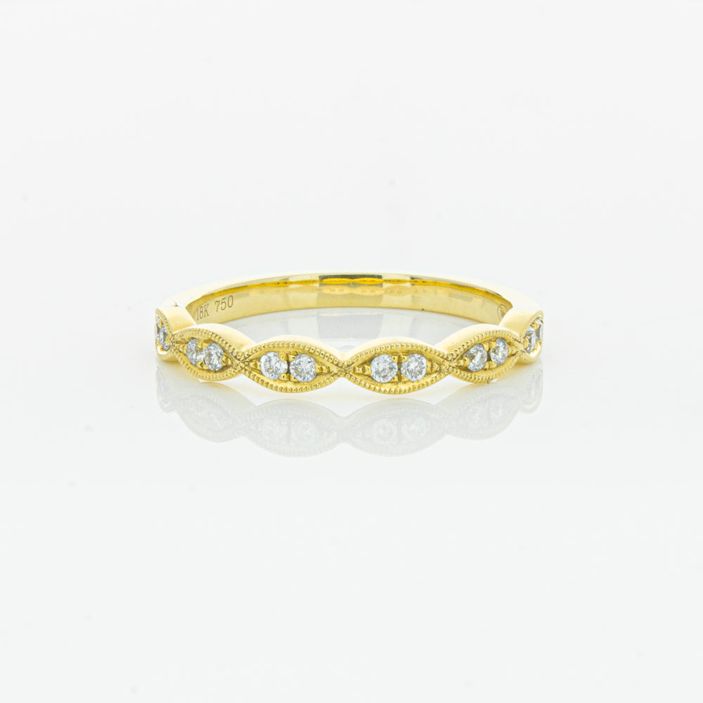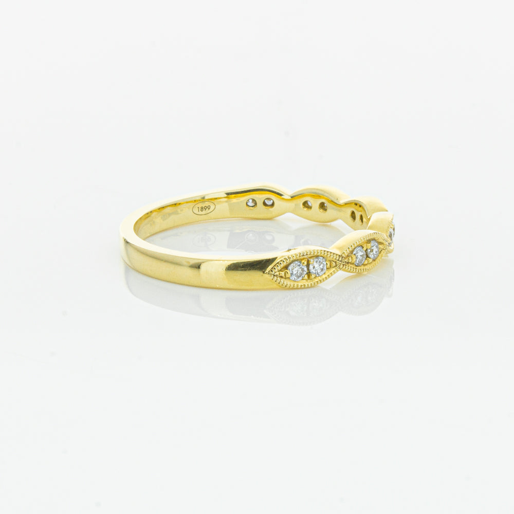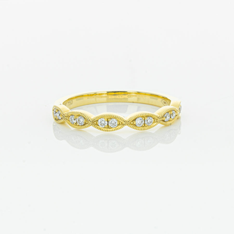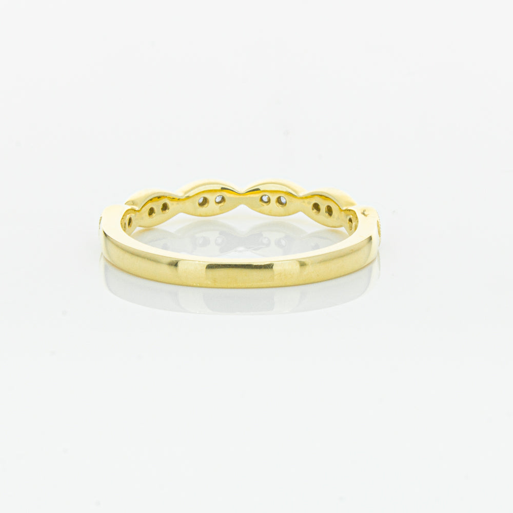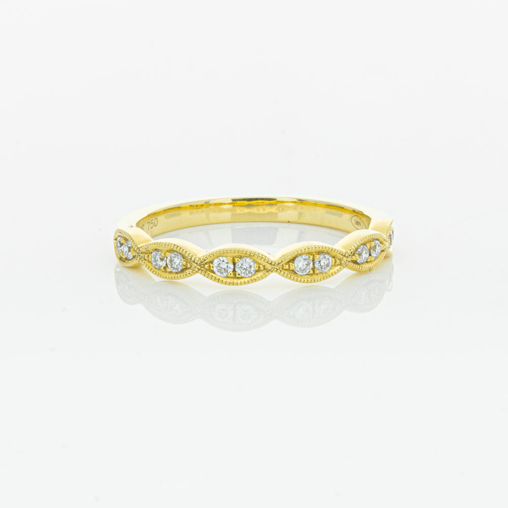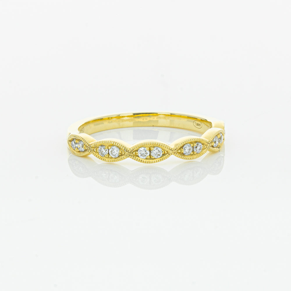 She will simply sparkle in this glittering 18ct yellow gold and diamond band. This elegant ring has been crafted with scalloped detailing, featuring twinkling round brilliant cut diamonds.