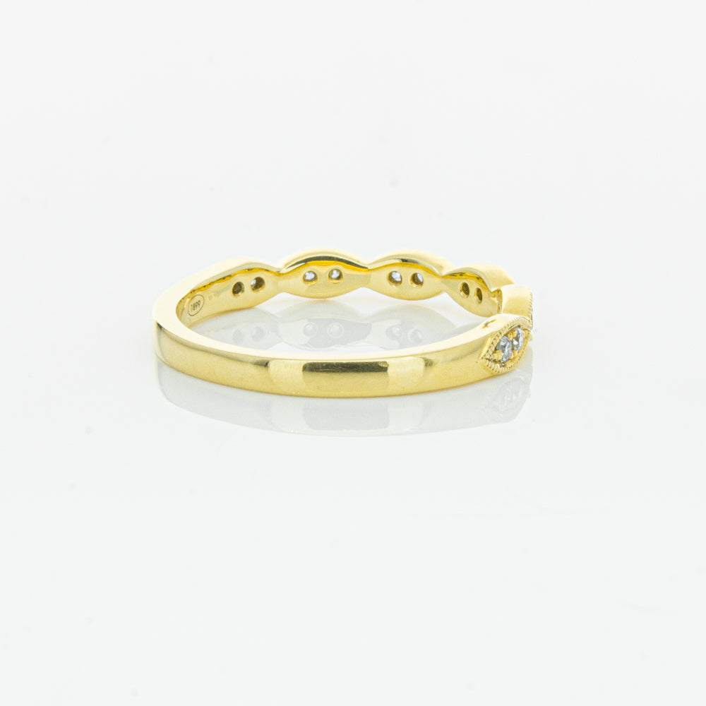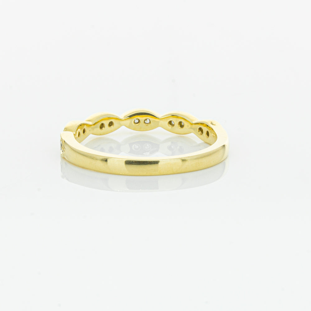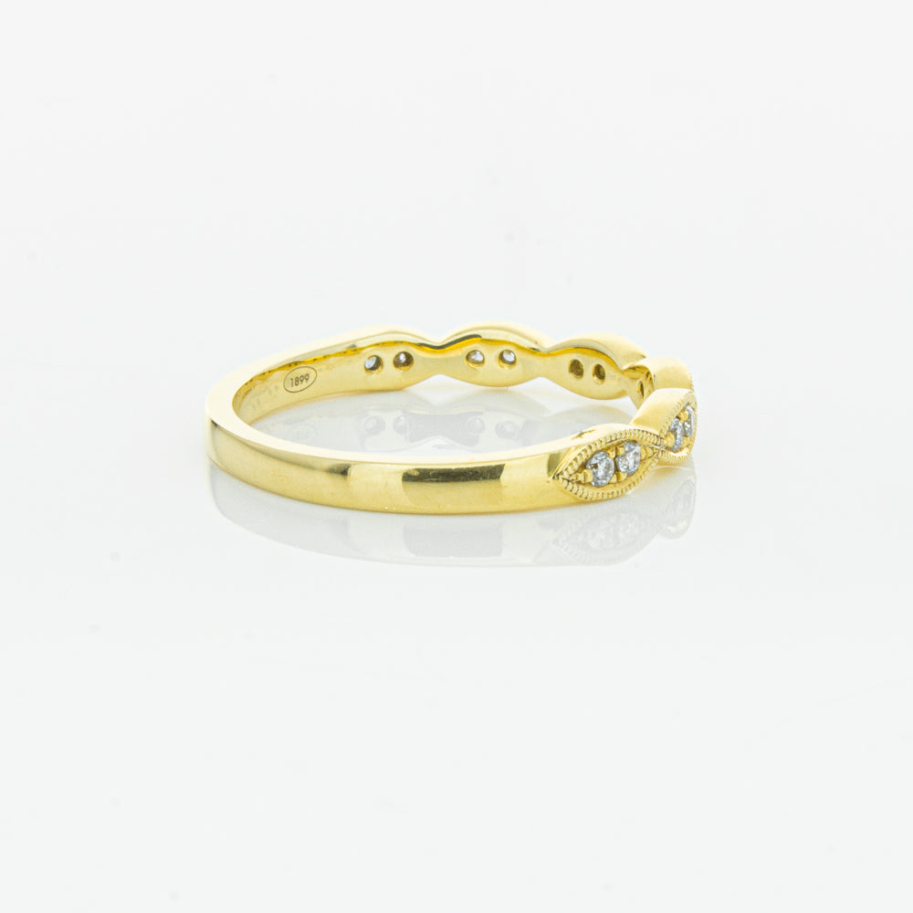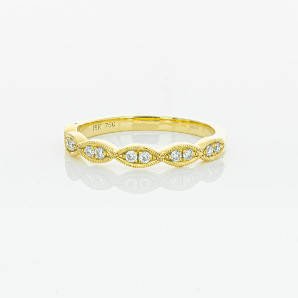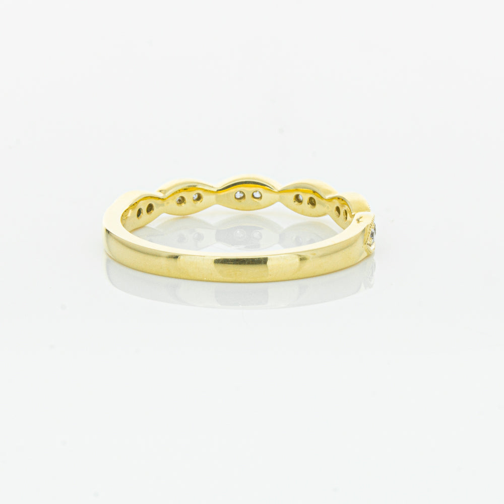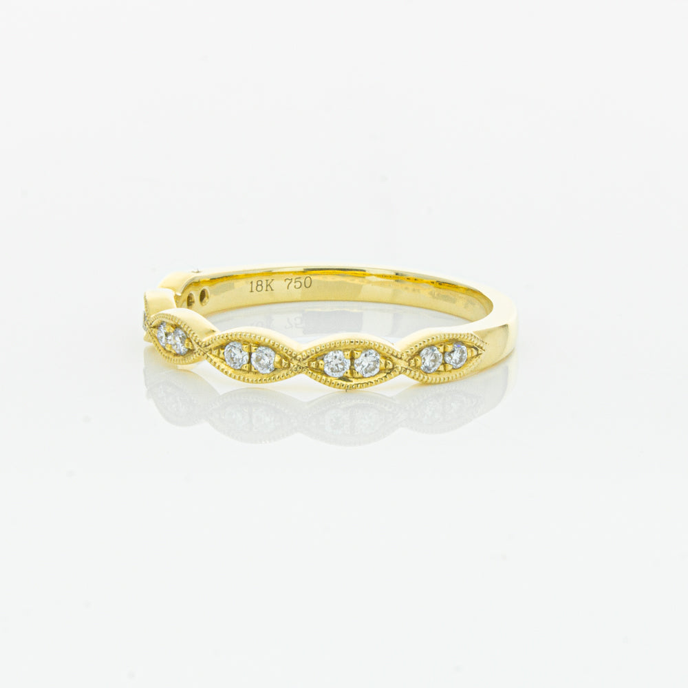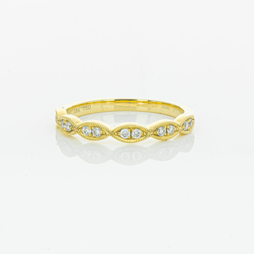 She will simply sparkle in this glittering 18ct yellow gold and diamond band. This elegant ring has been crafted with scalloped detailing, featuring twinkling round brilliant cut diamonds.