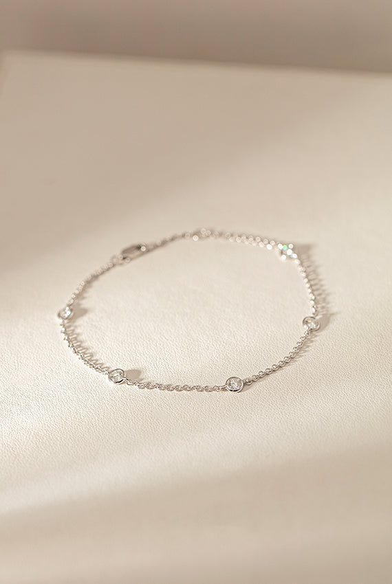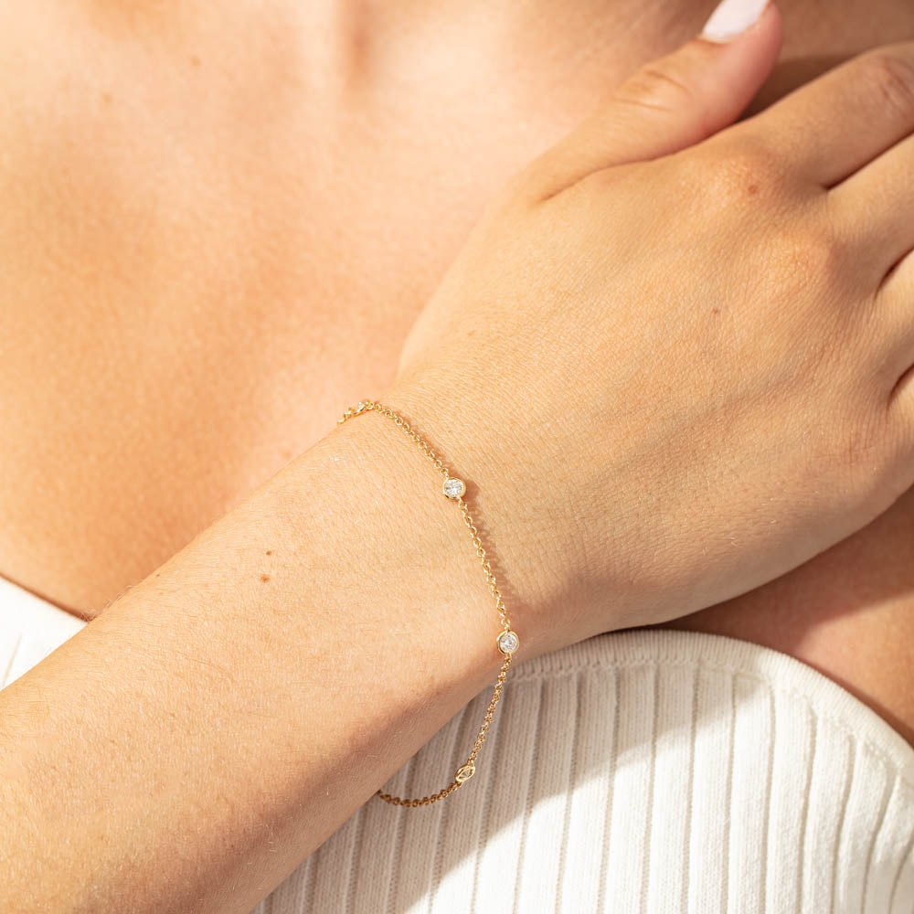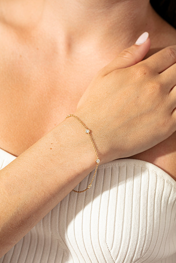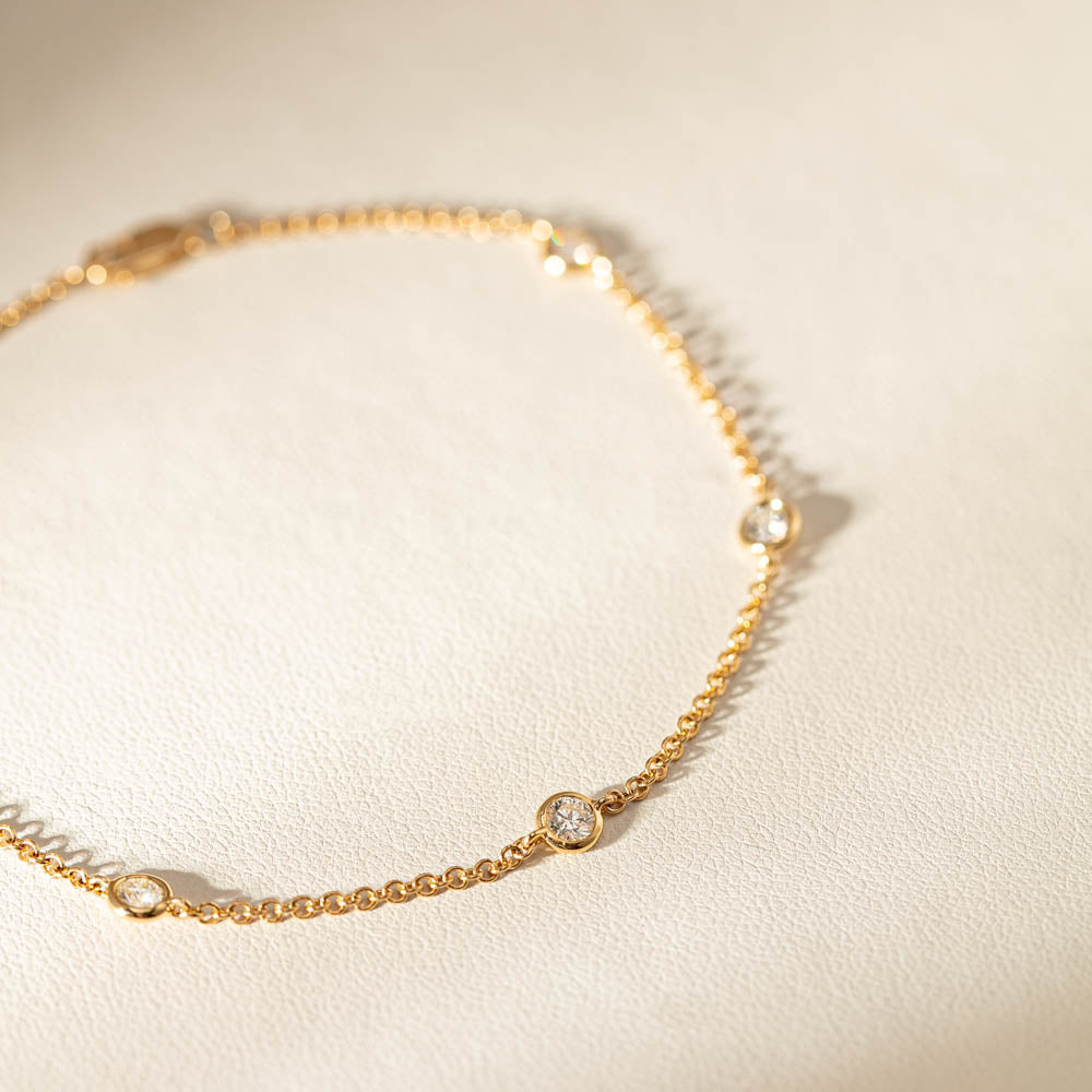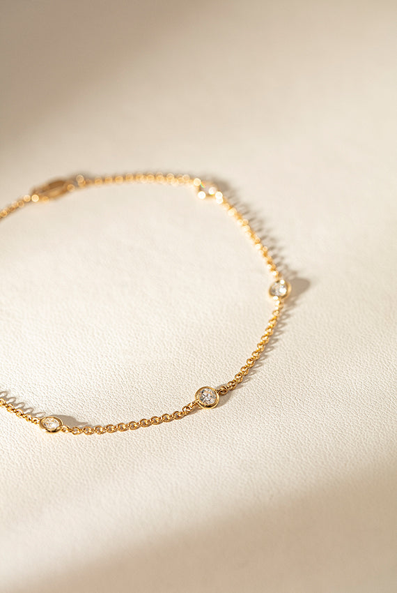 With its delicate and feminine setting the subtle bezel-set diamonds beautifully dance on a 18ct yellow gold chain, catching in the light symbolising a truly free spirit.