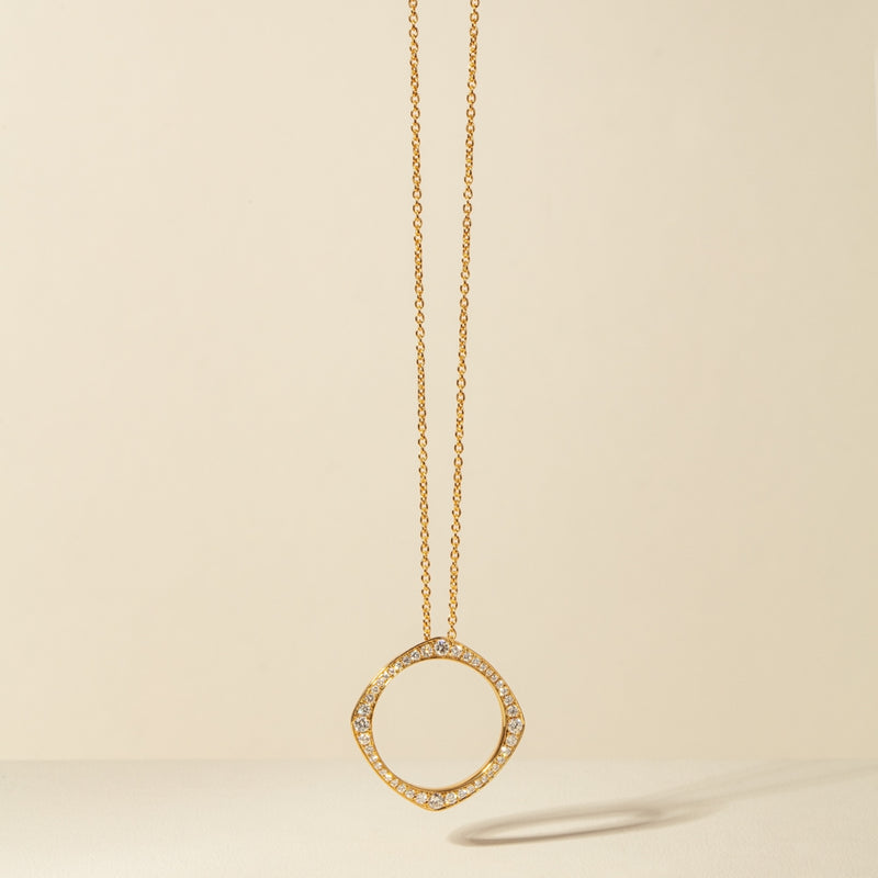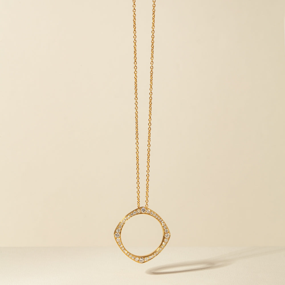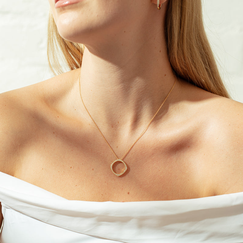Named after Eos, the Greek goddess of the dawn, this perfectly crafted 18ct yellow gold pendant signifies the start of a new journey. Celebrate the first step and initial leap of faith towards a brighter future with this stylish geometric pendant.