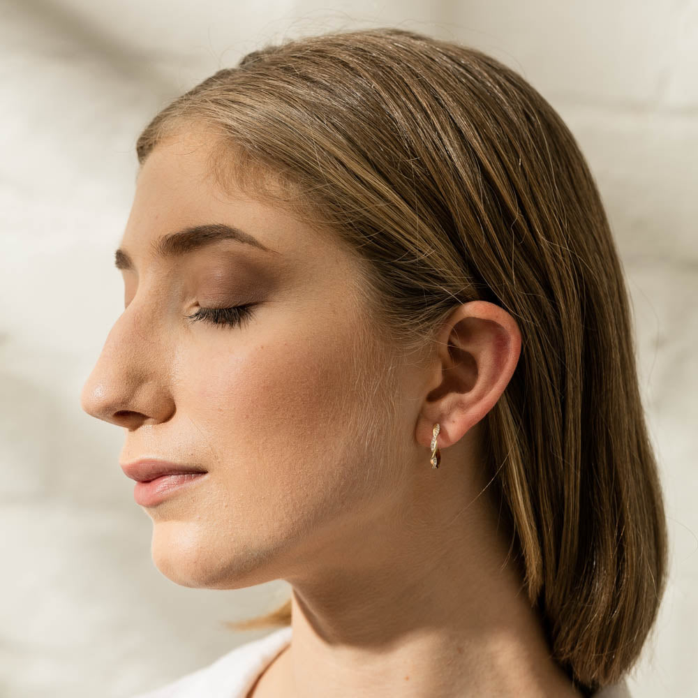 18ct yellow gold hoop earrings featuring thirty two round brilliant cut diamonds elegantly resting in a perfectly crafted twist.