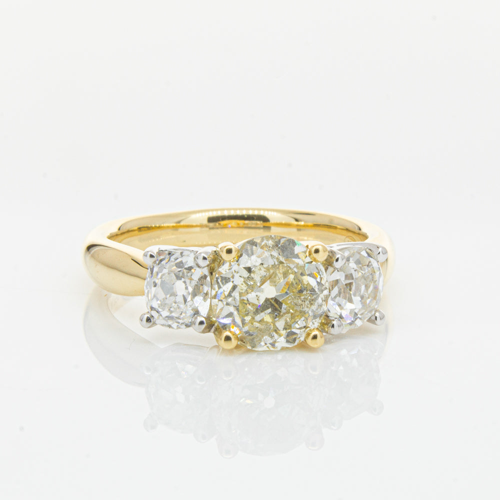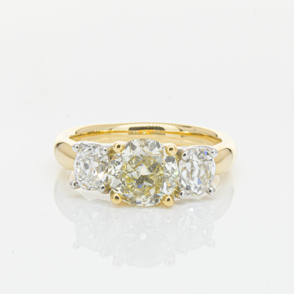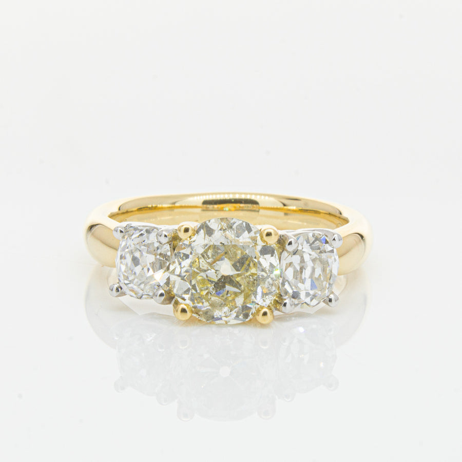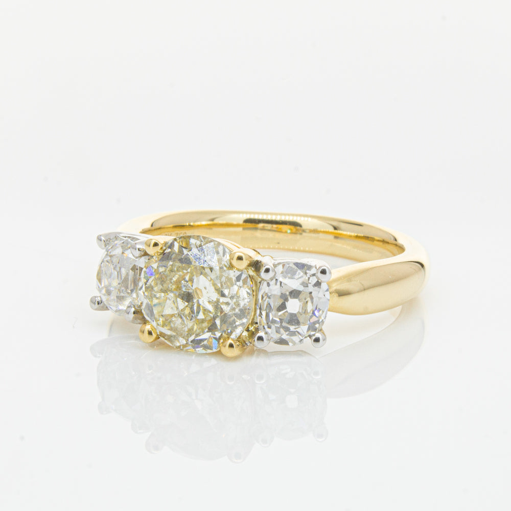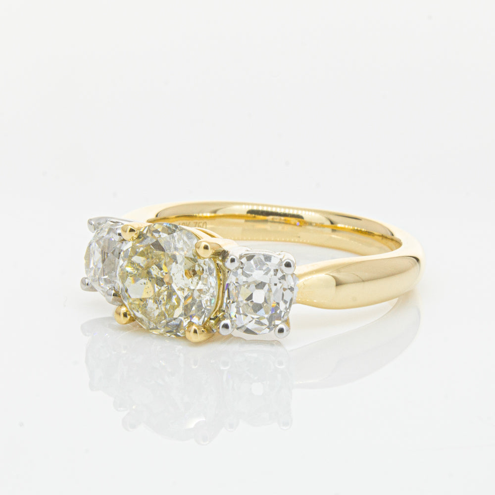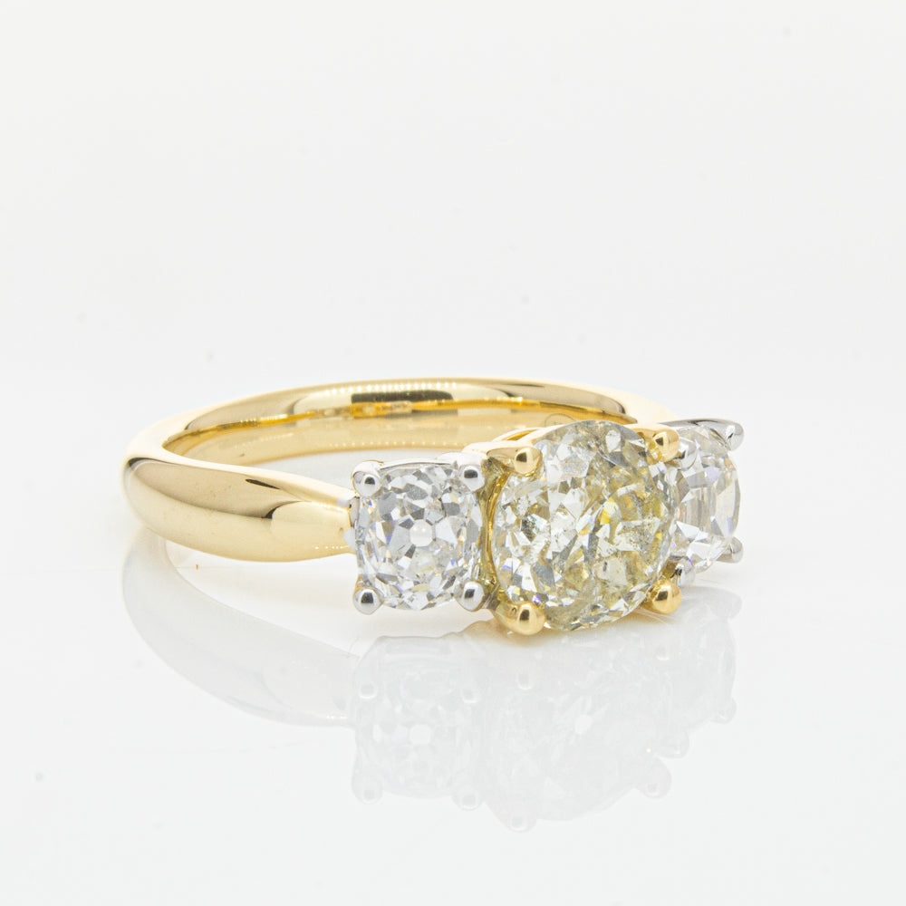 18ct yellow gold three stone ring featuring three old mine cut diamonds set in an 18ct white gold claw setting