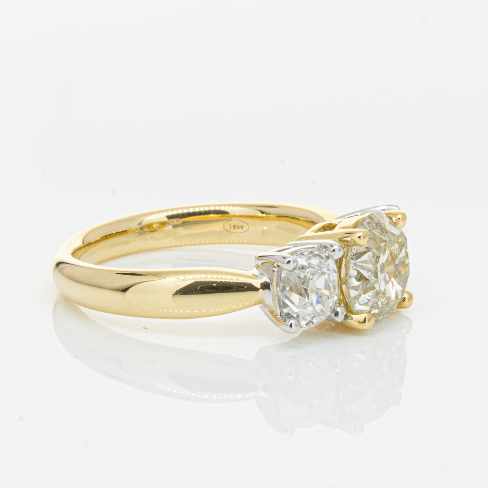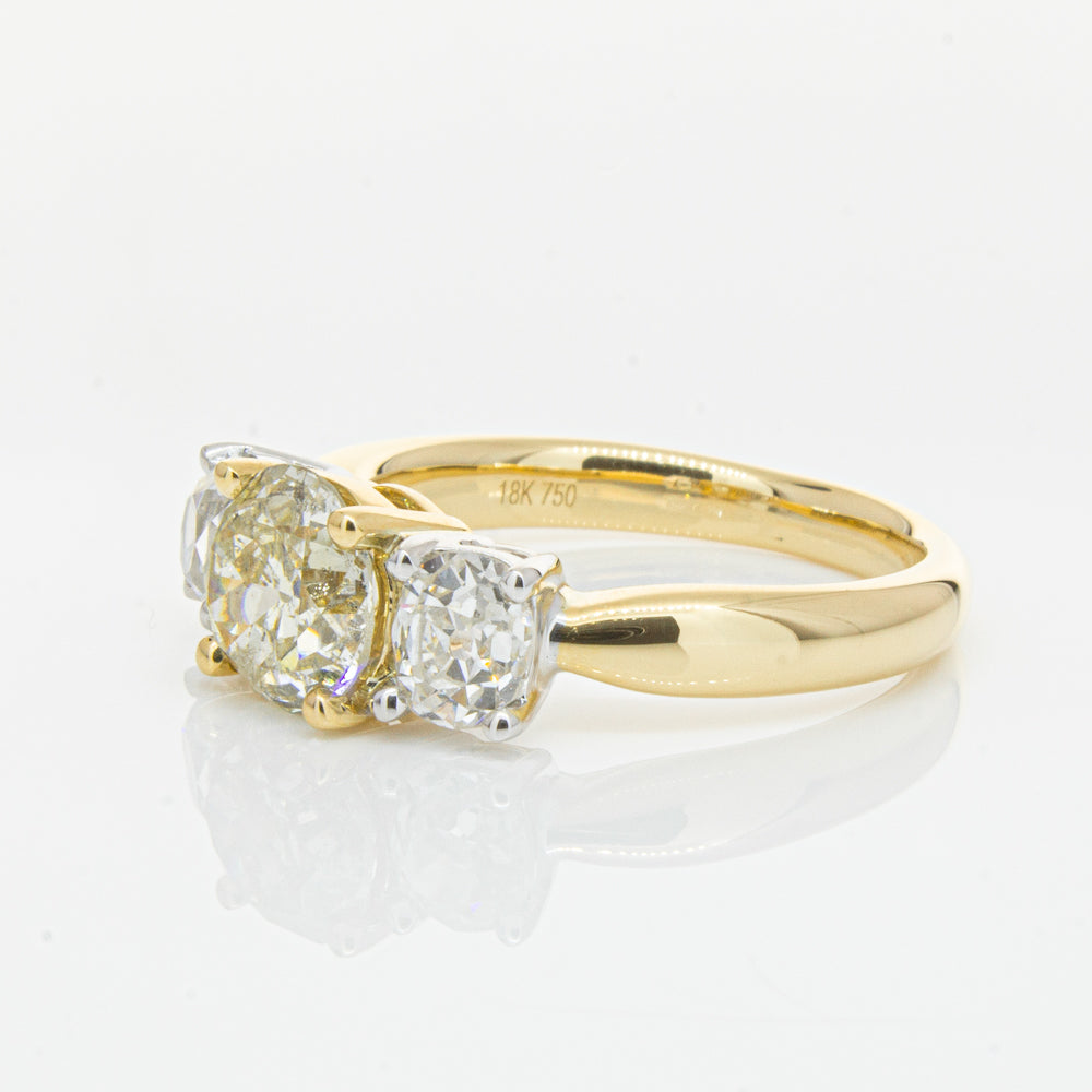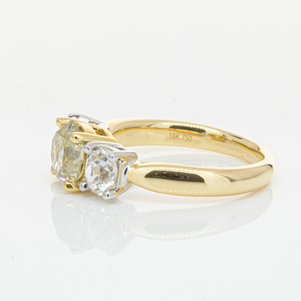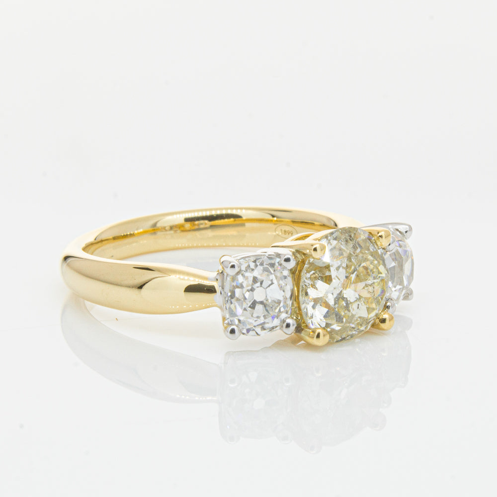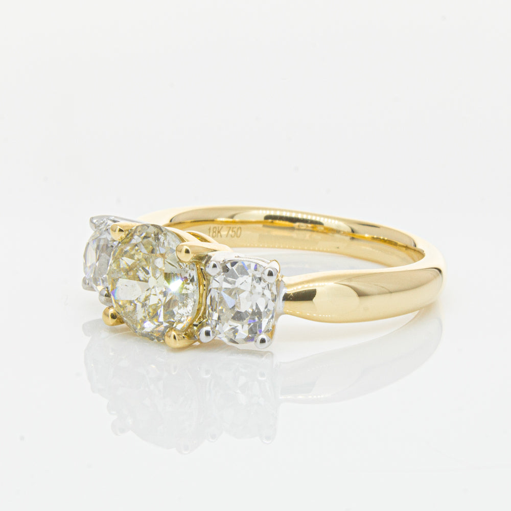 18ct yellow gold three stone ring featuring three old mine cut diamonds set in an 18ct white gold claw setting