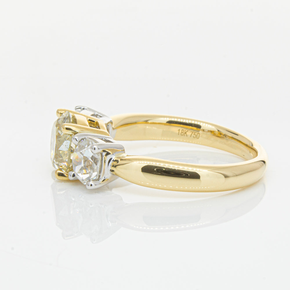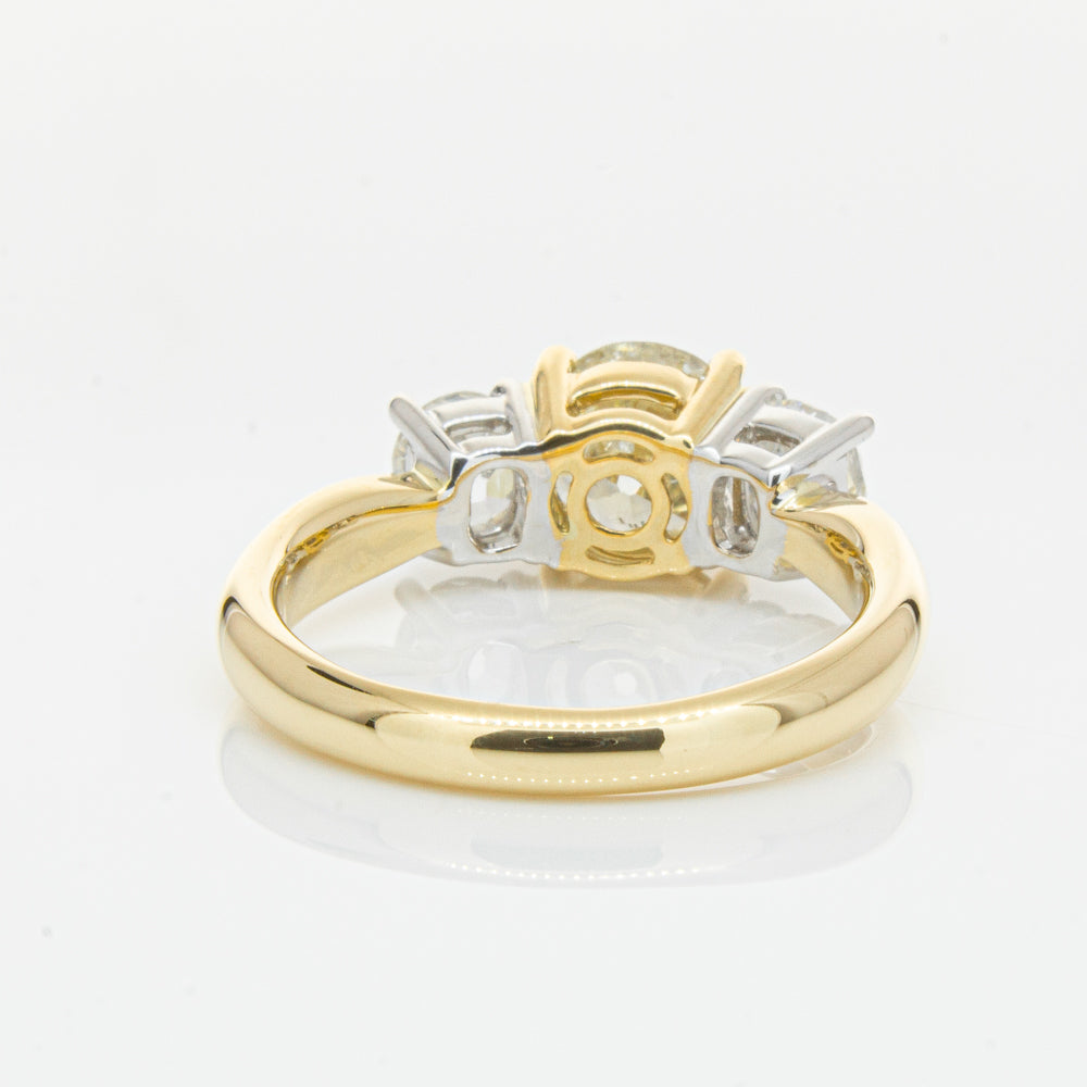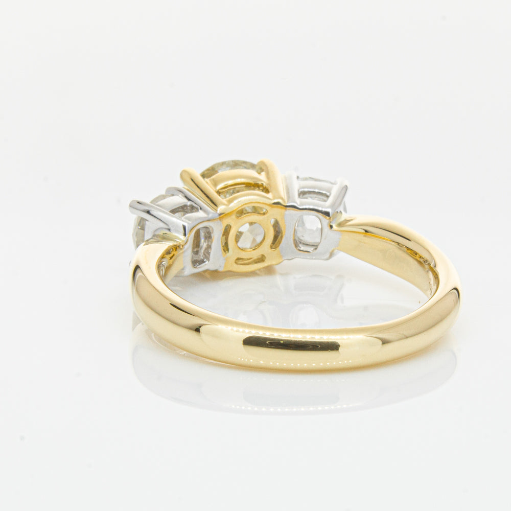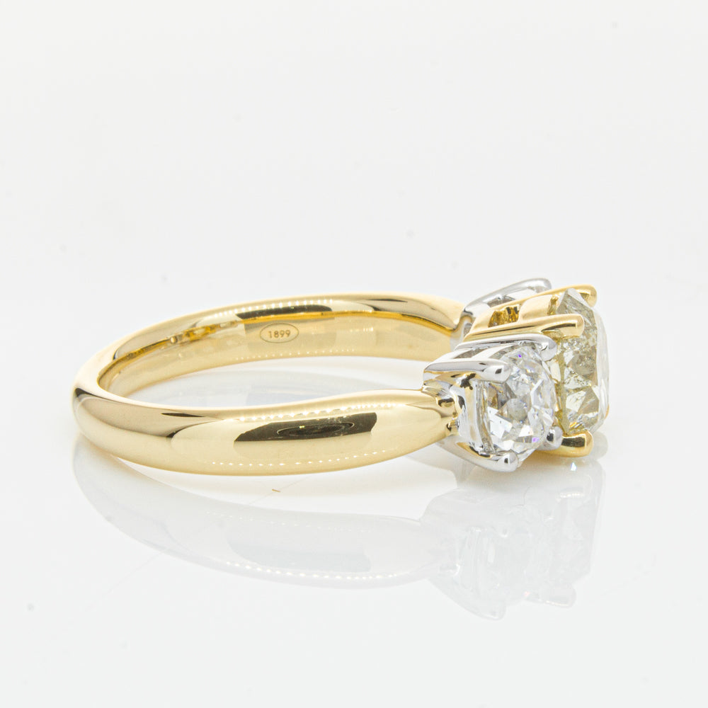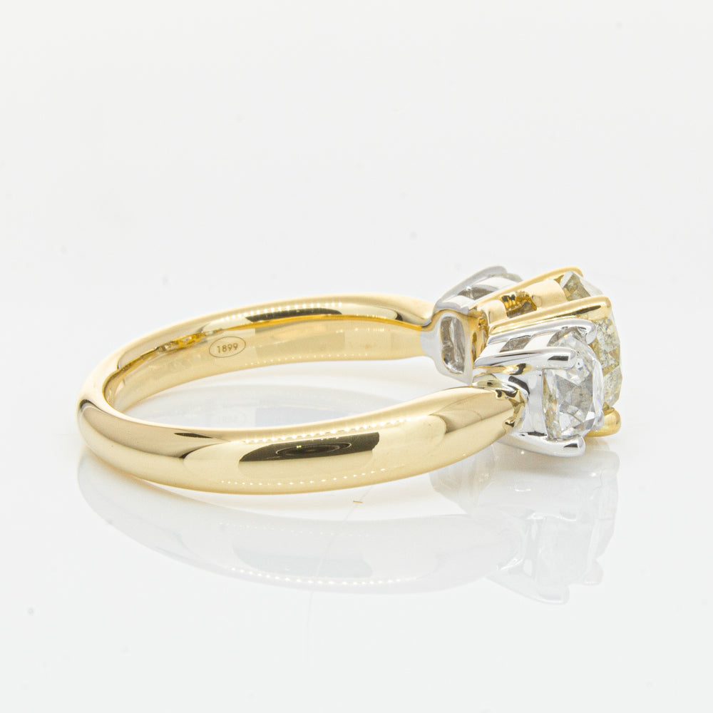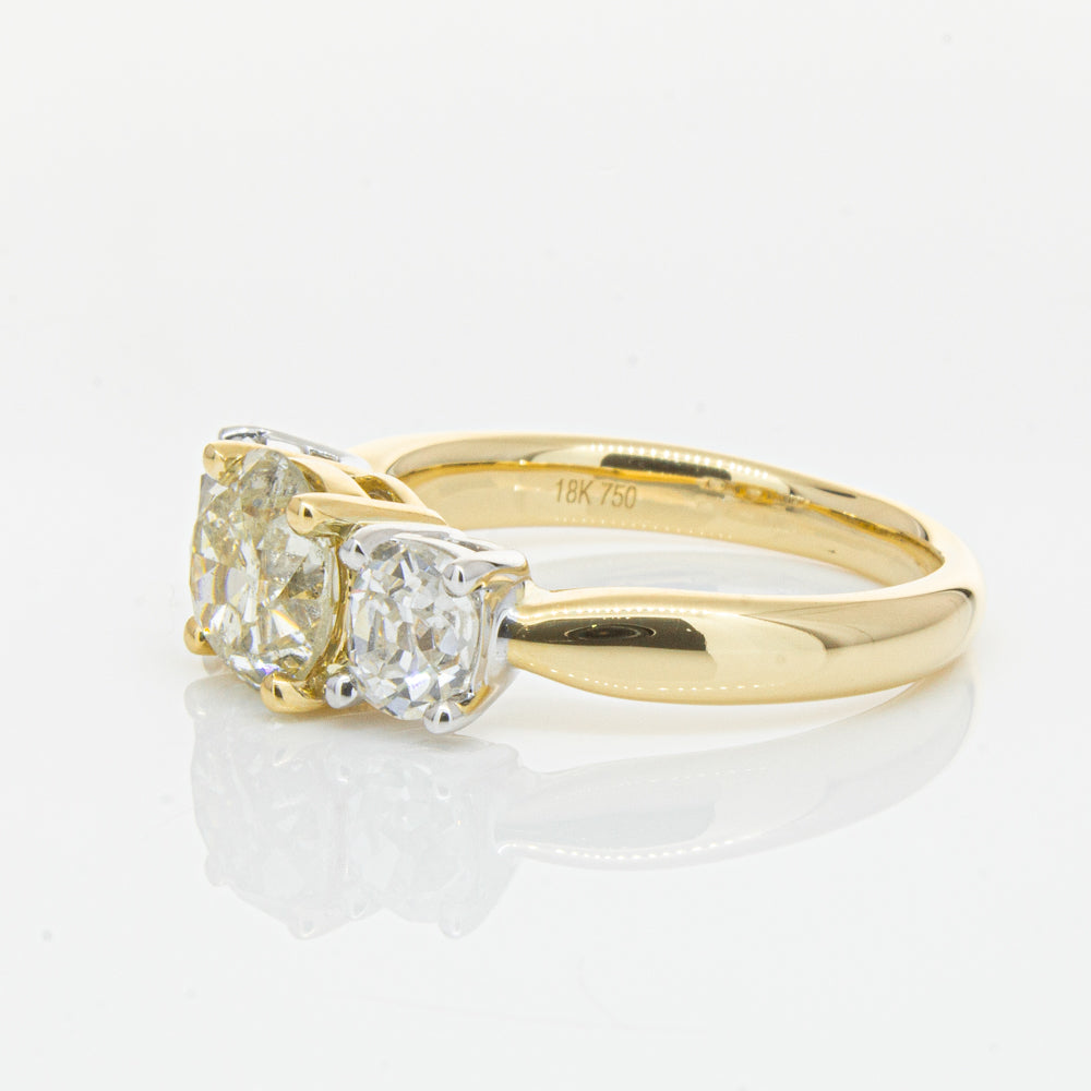 18ct yellow gold three stone ring featuring three old mine cut diamonds set in an 18ct white gold claw setting