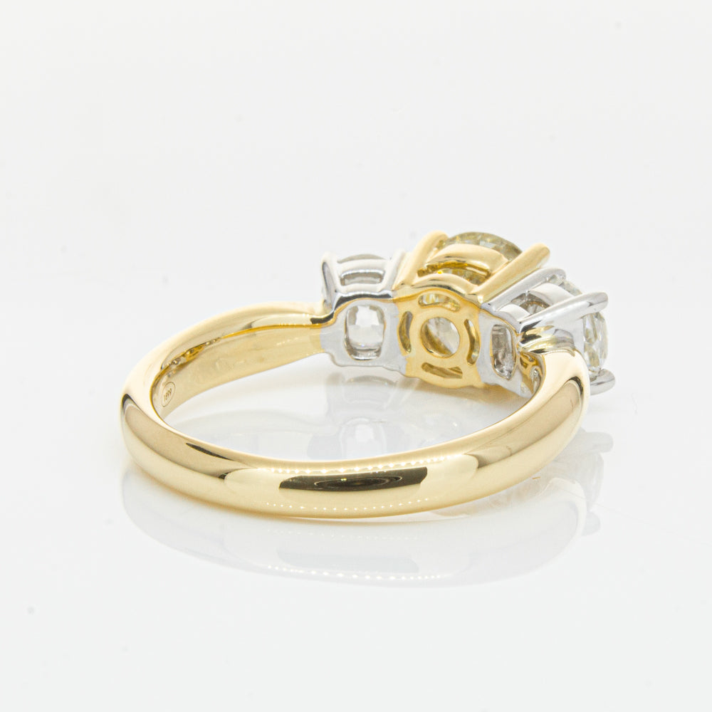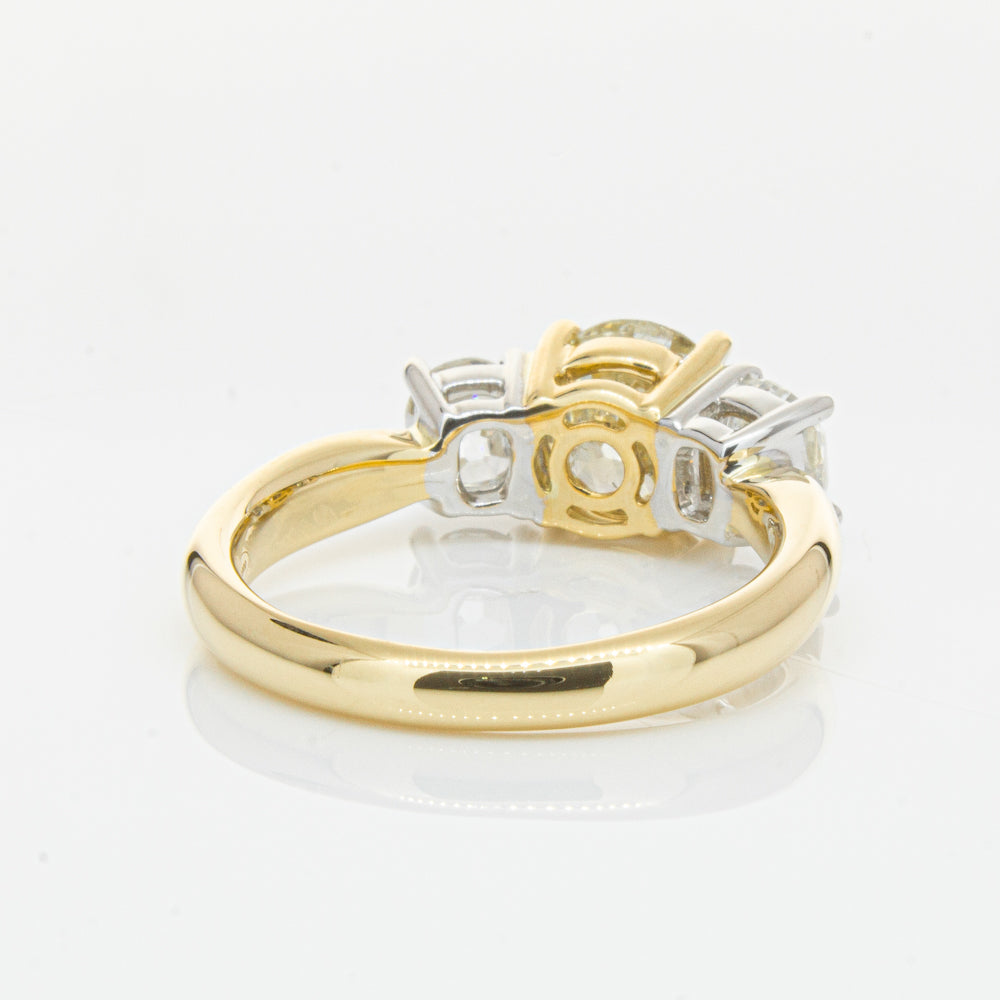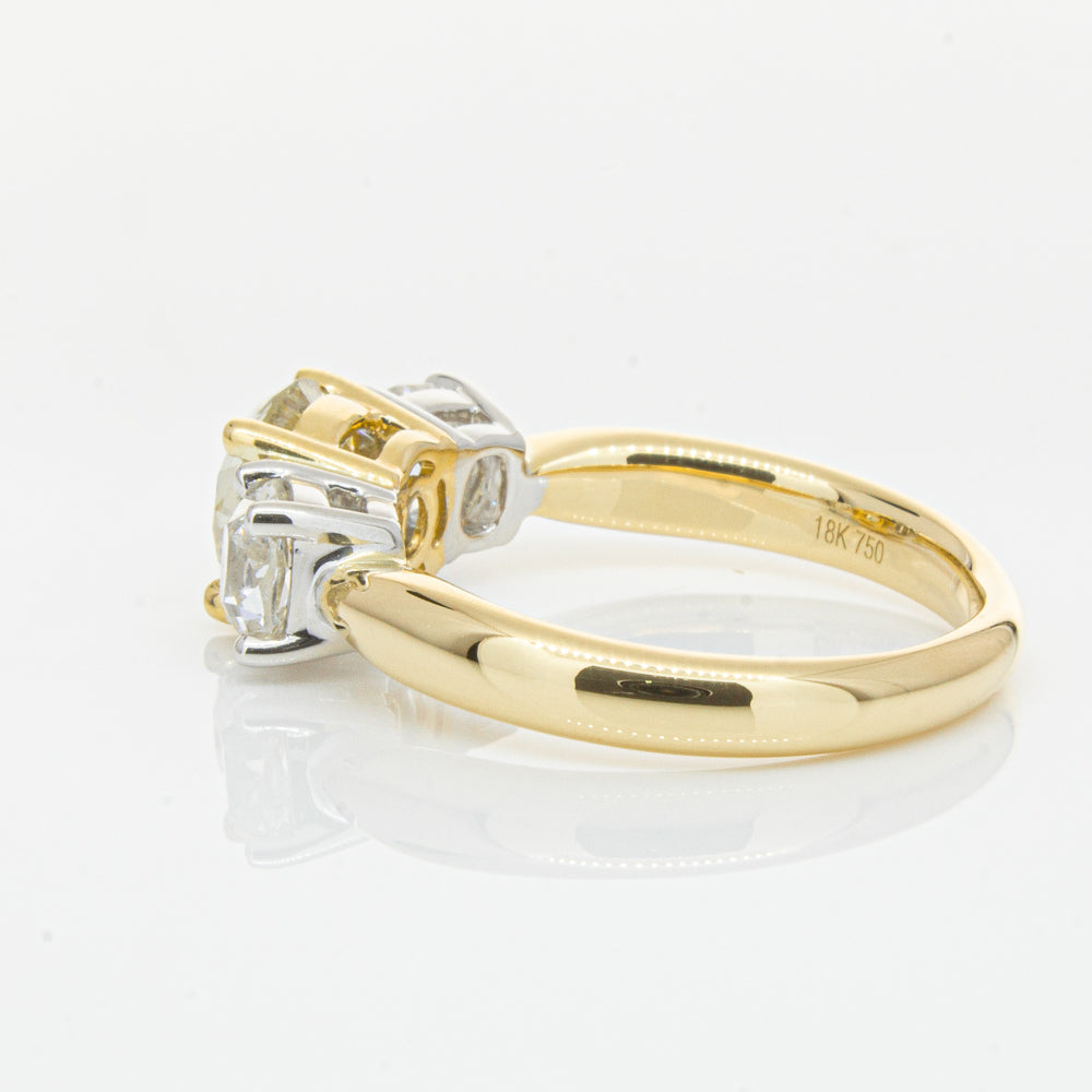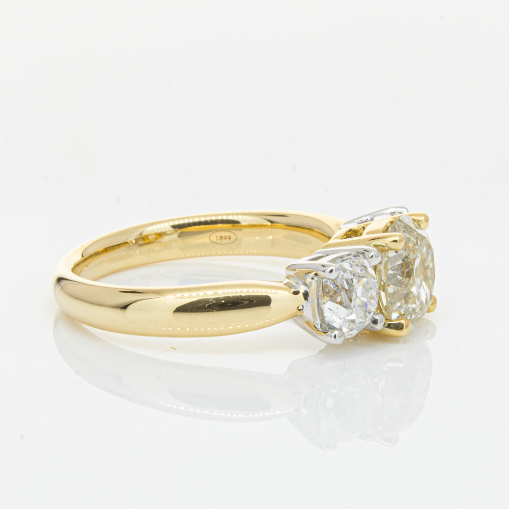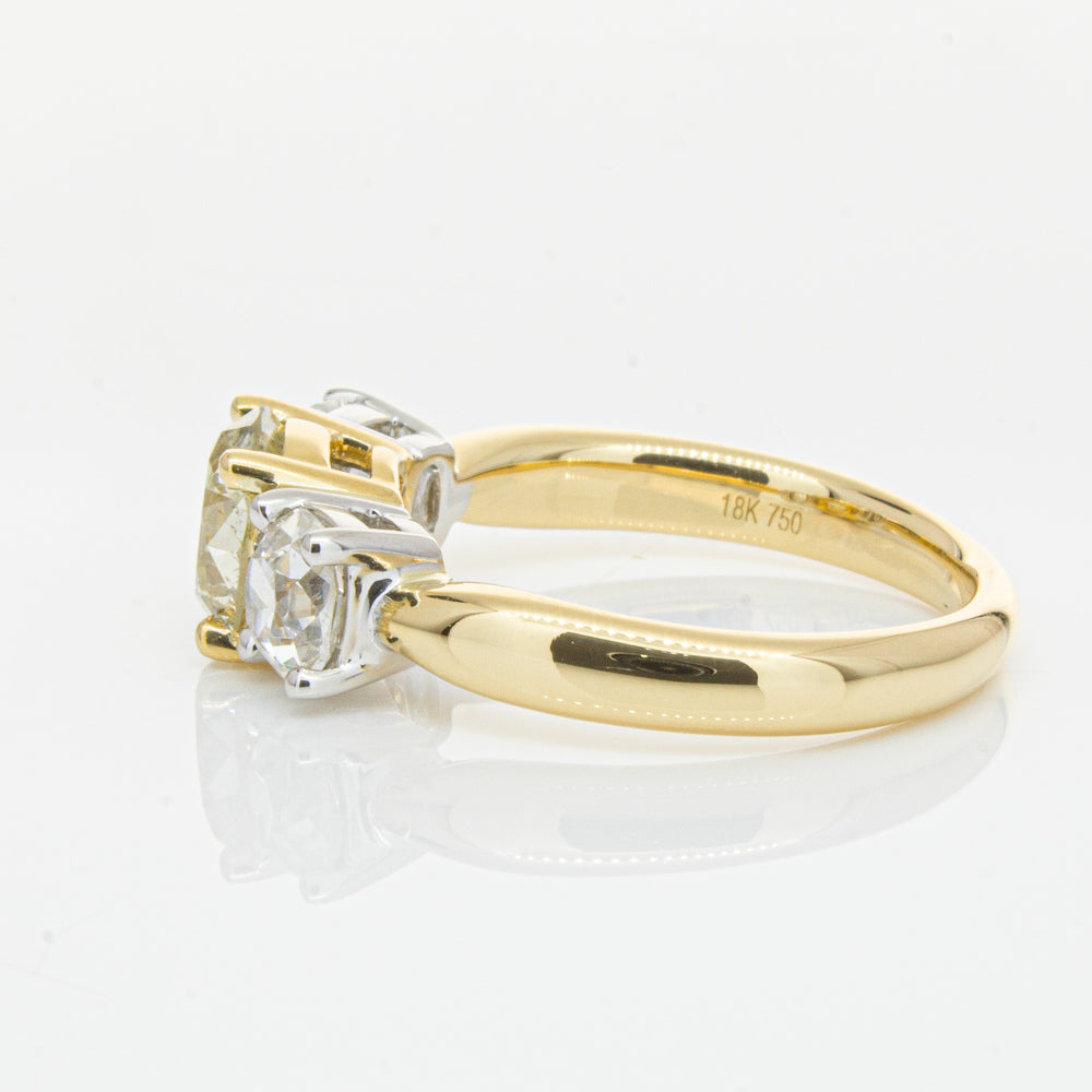 18ct yellow gold three stone ring featuring three old mine cut diamonds set in an 18ct white gold claw setting