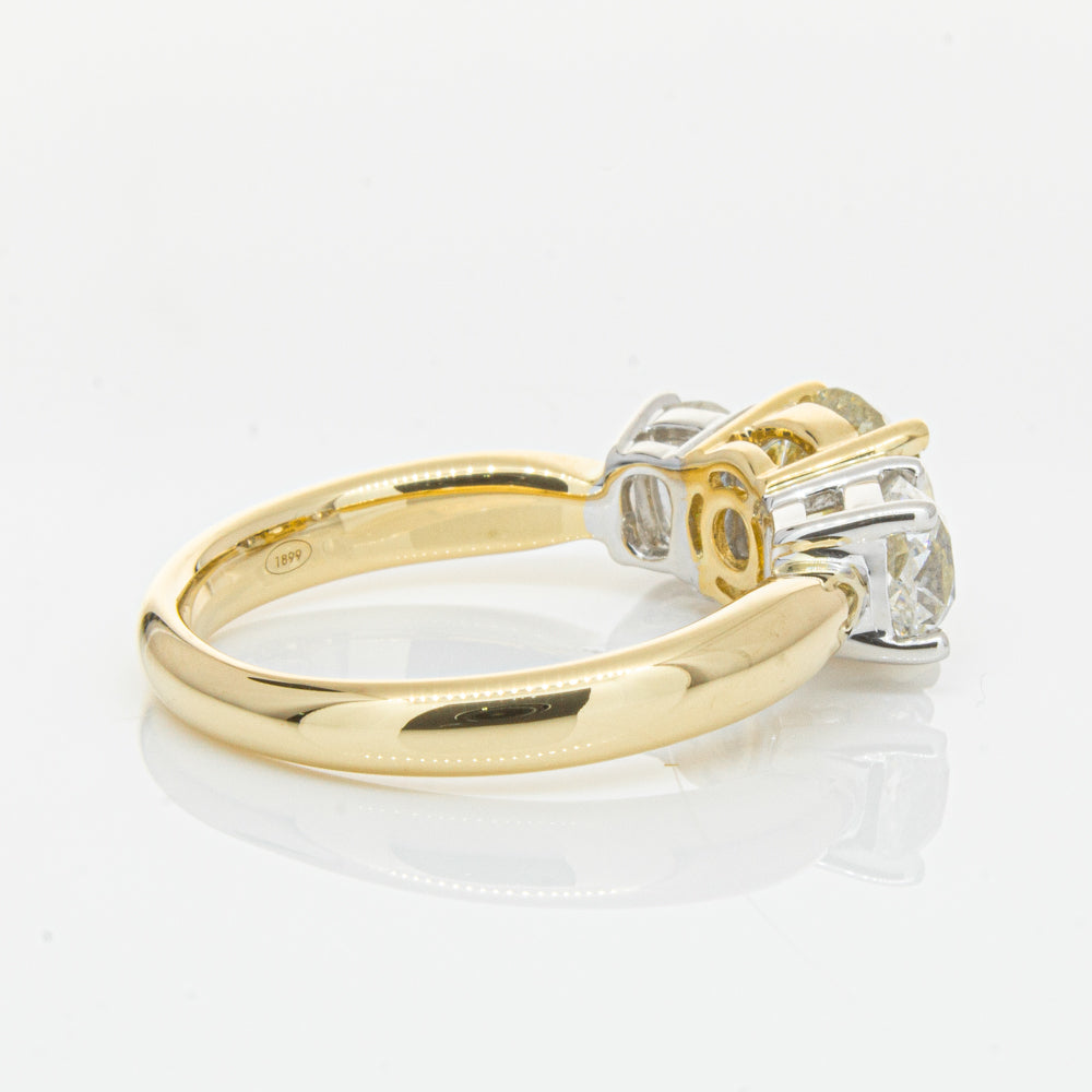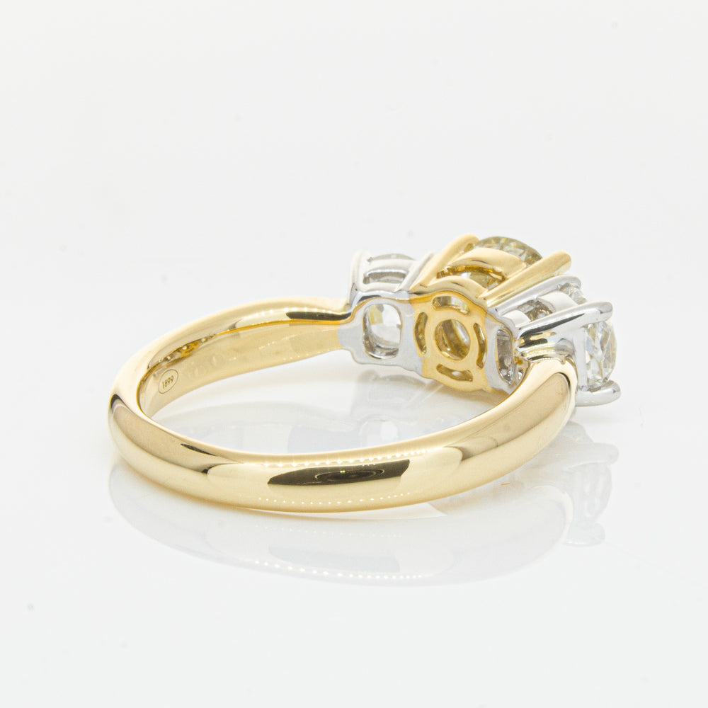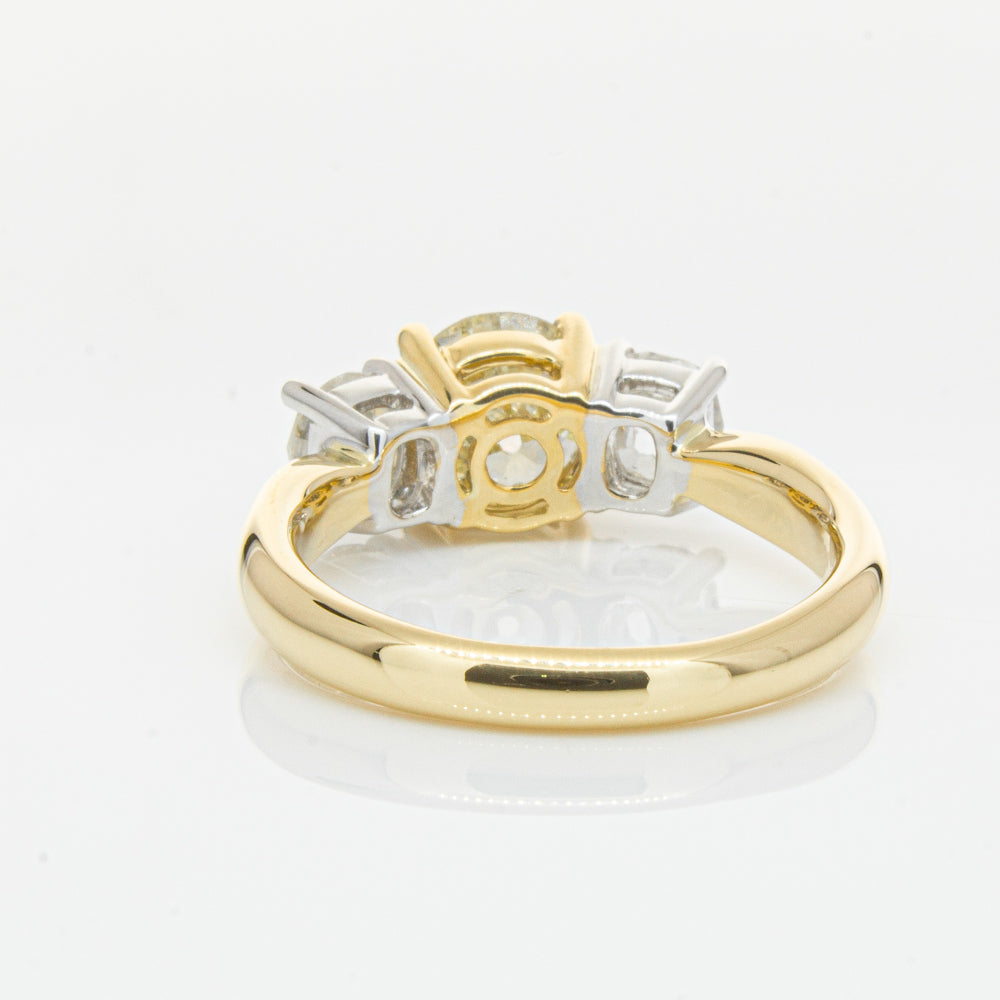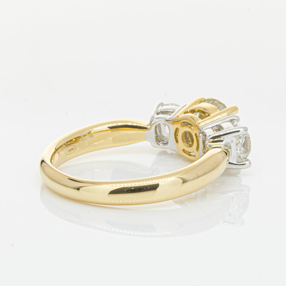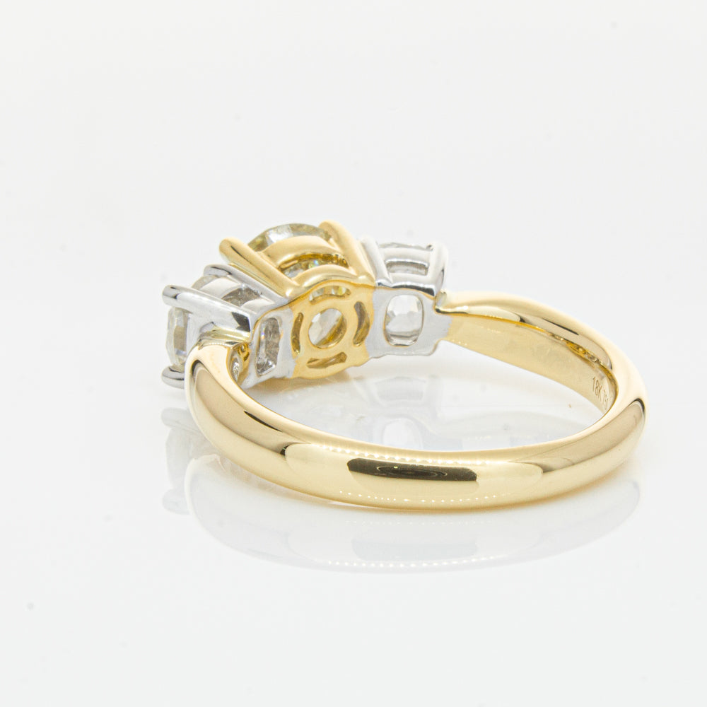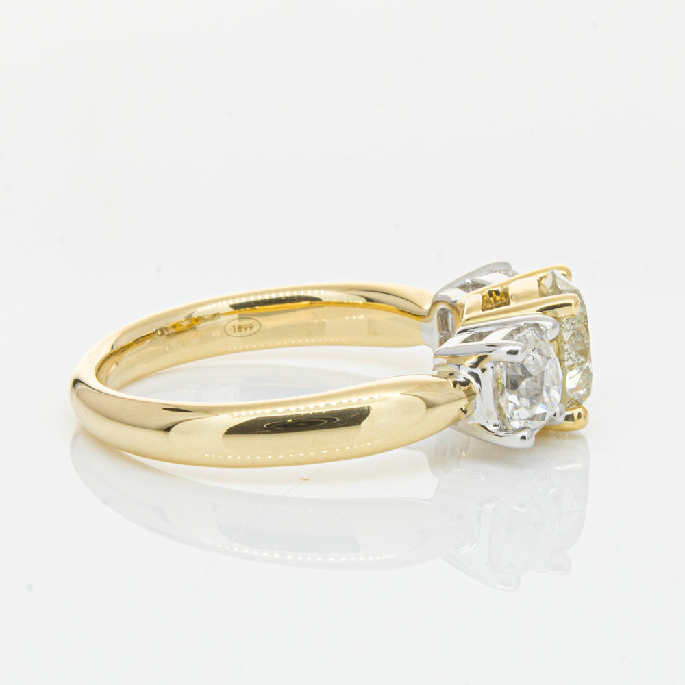 18ct yellow gold three stone ring featuring three old mine cut diamonds set in an 18ct white gold claw setting