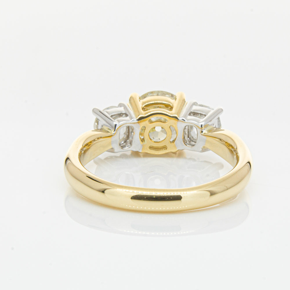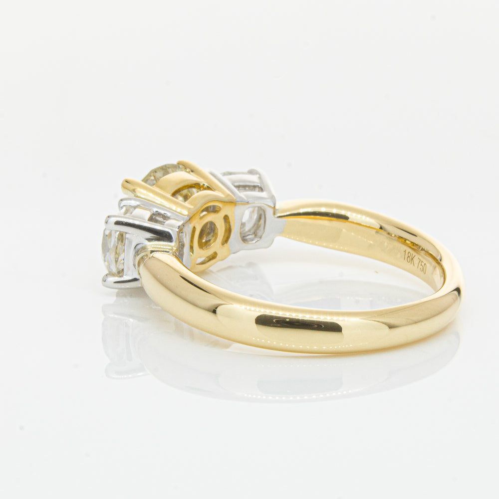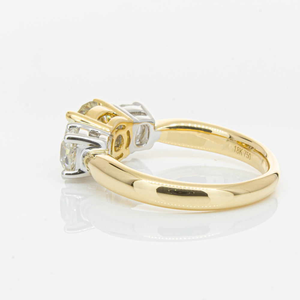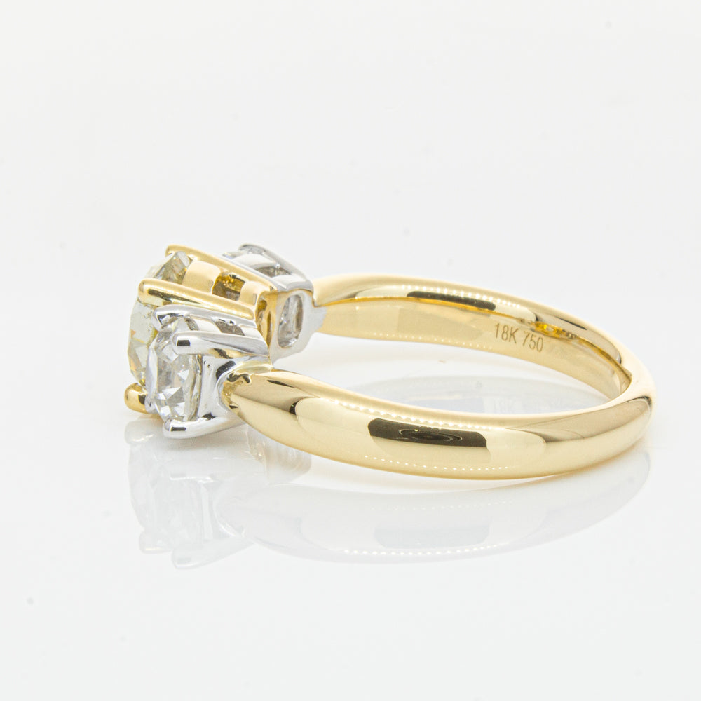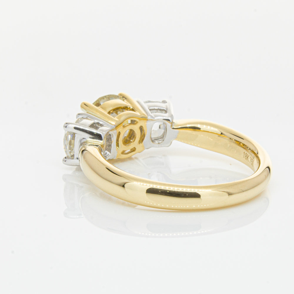 18ct yellow gold three stone ring featuring three old mine cut diamonds set in an 18ct white gold claw setting