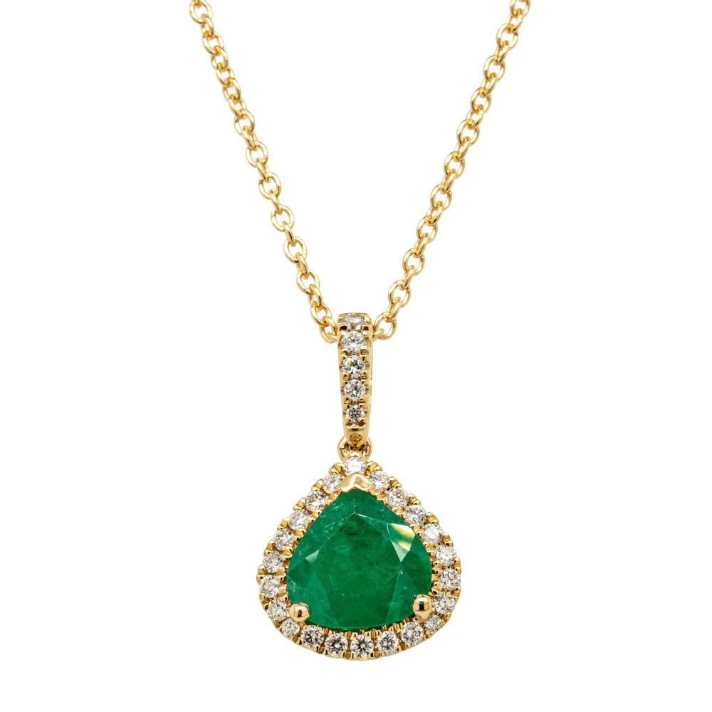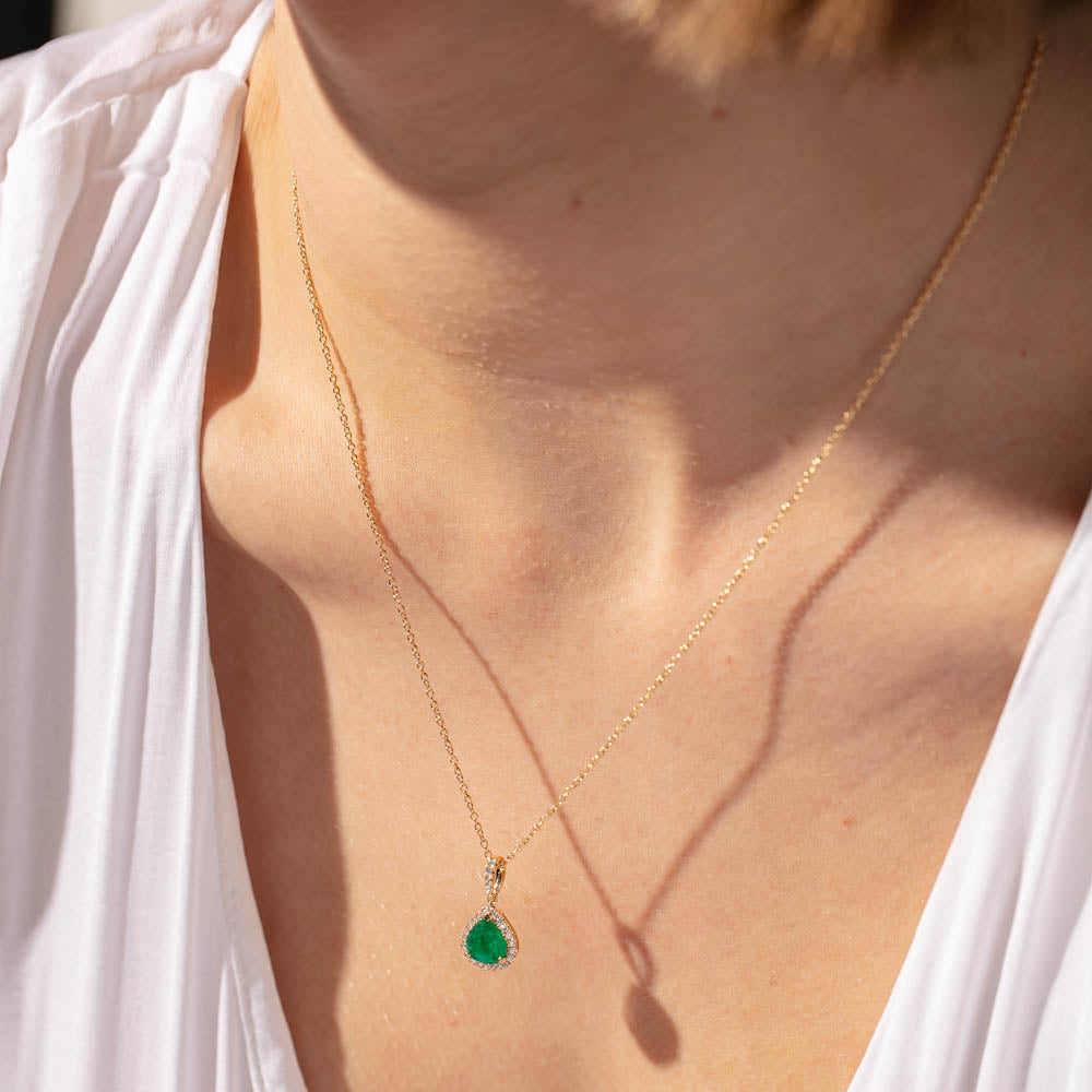 Shine bright wearing this glittering emerald and diamond halo pendant. Crafted in 18ct yellow gold this stunning pendant features a vibrant pear faceted emerald framed by a halo of shimmering diamonds. The perfect piece to add a touch of sparkle to any outfit.