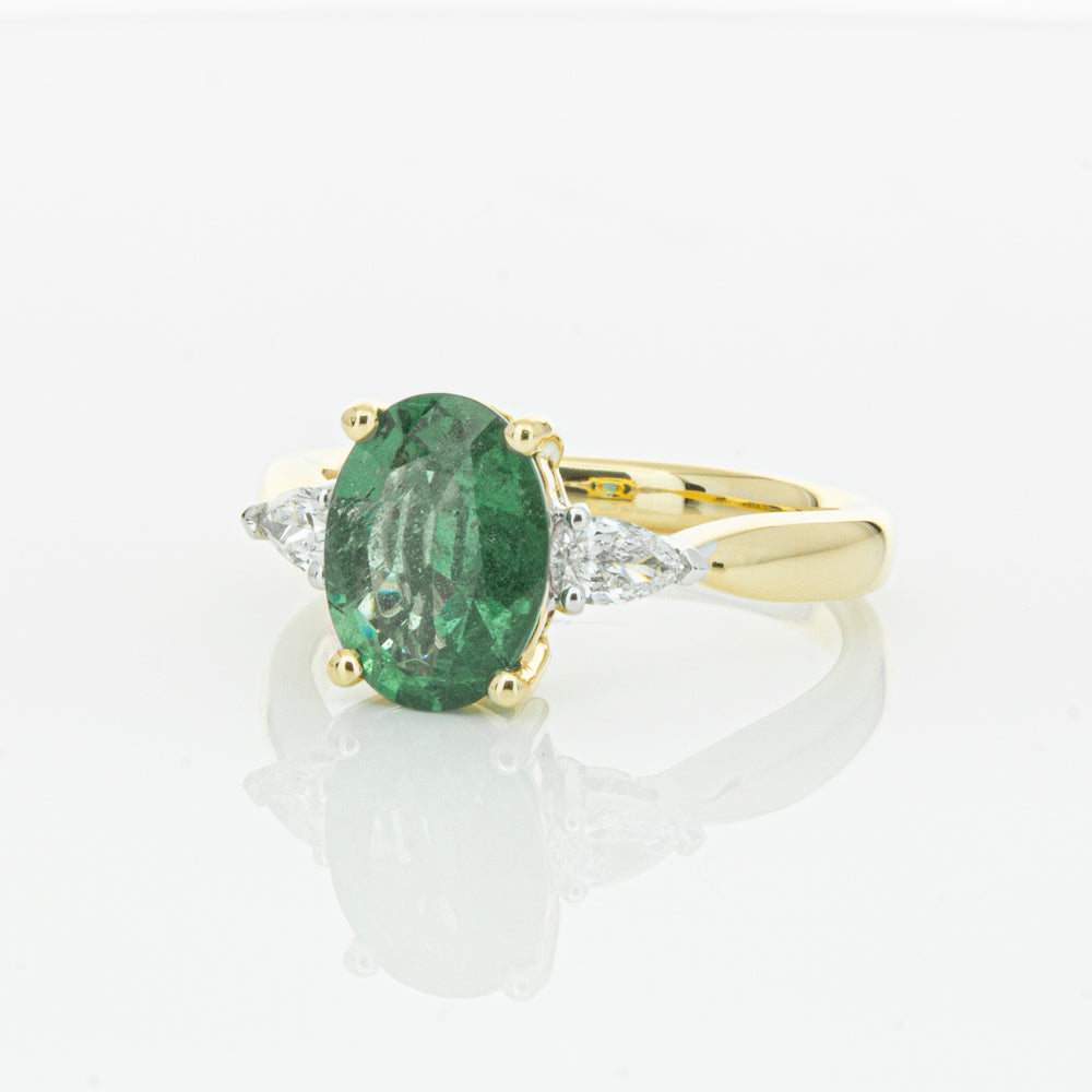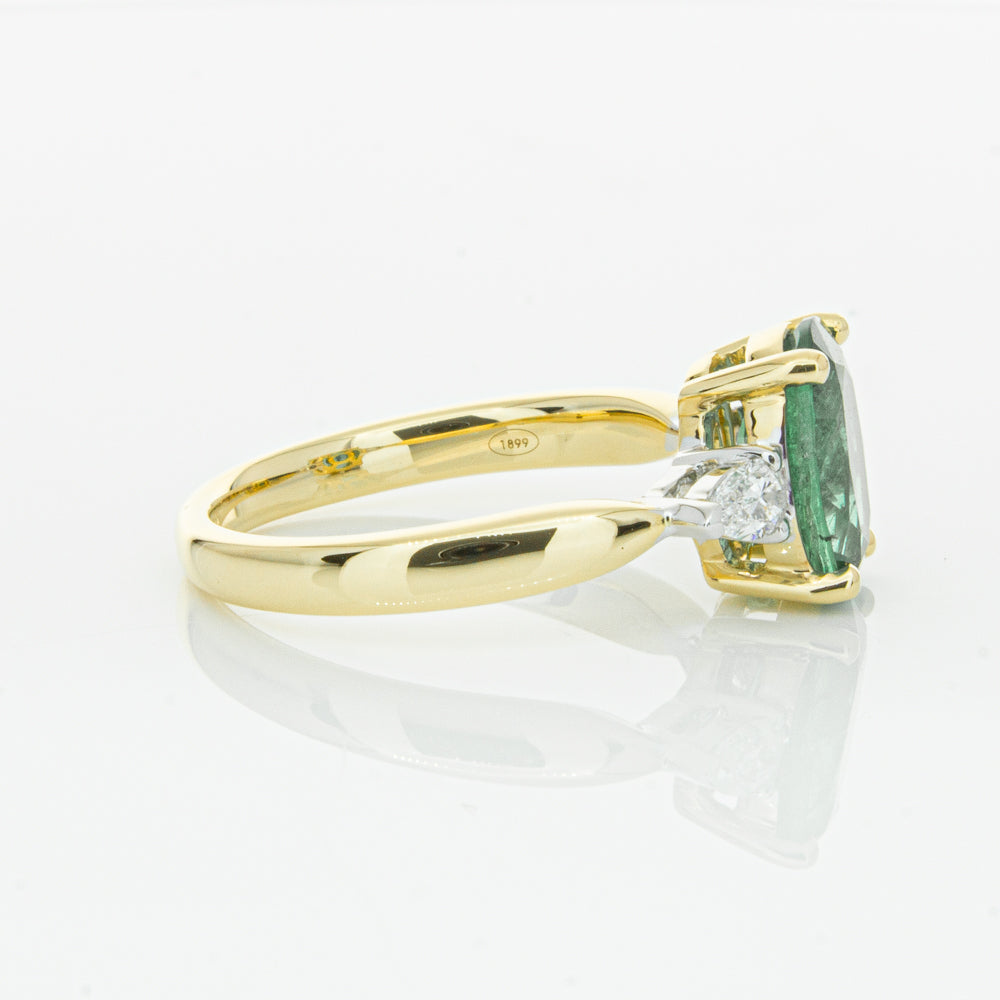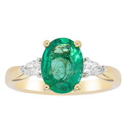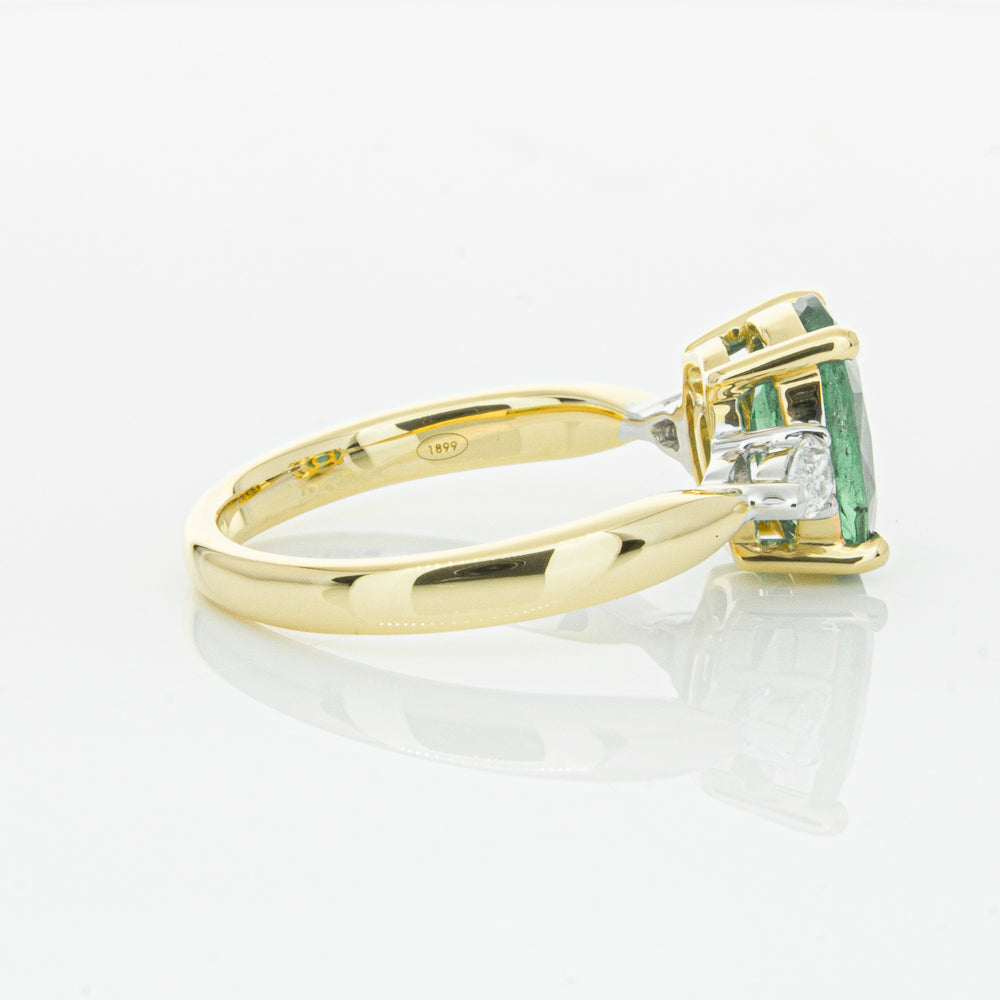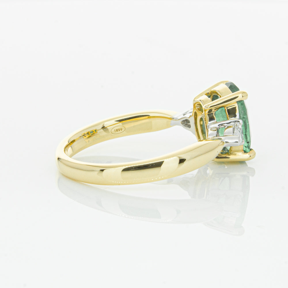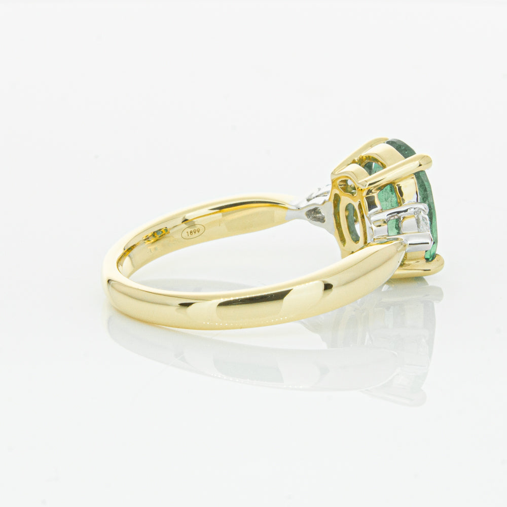 Carefully crafted in 18ct yellow gold from our signature 1899 collection,  this ring features an oval faceted emerald and two dazzling trilliant cut shoulder diamonds.