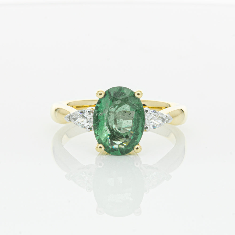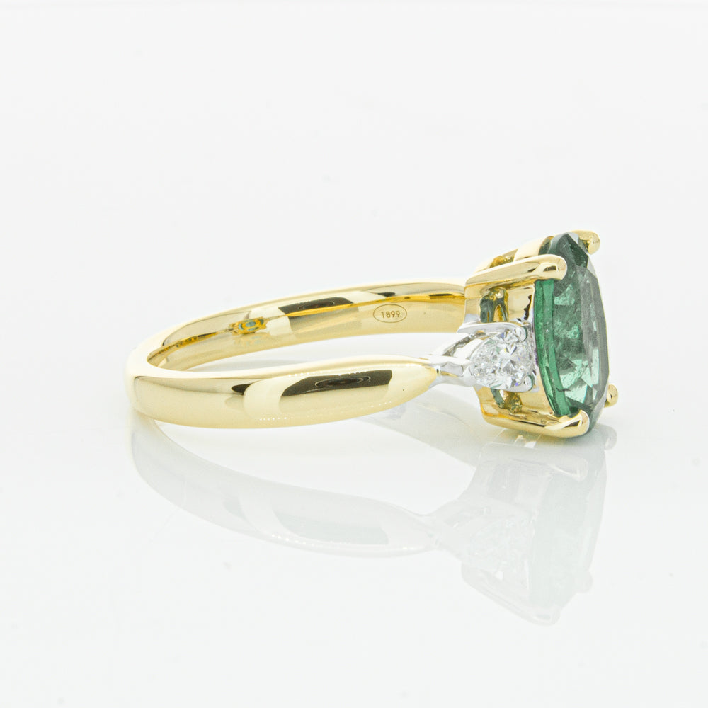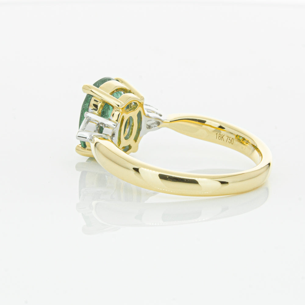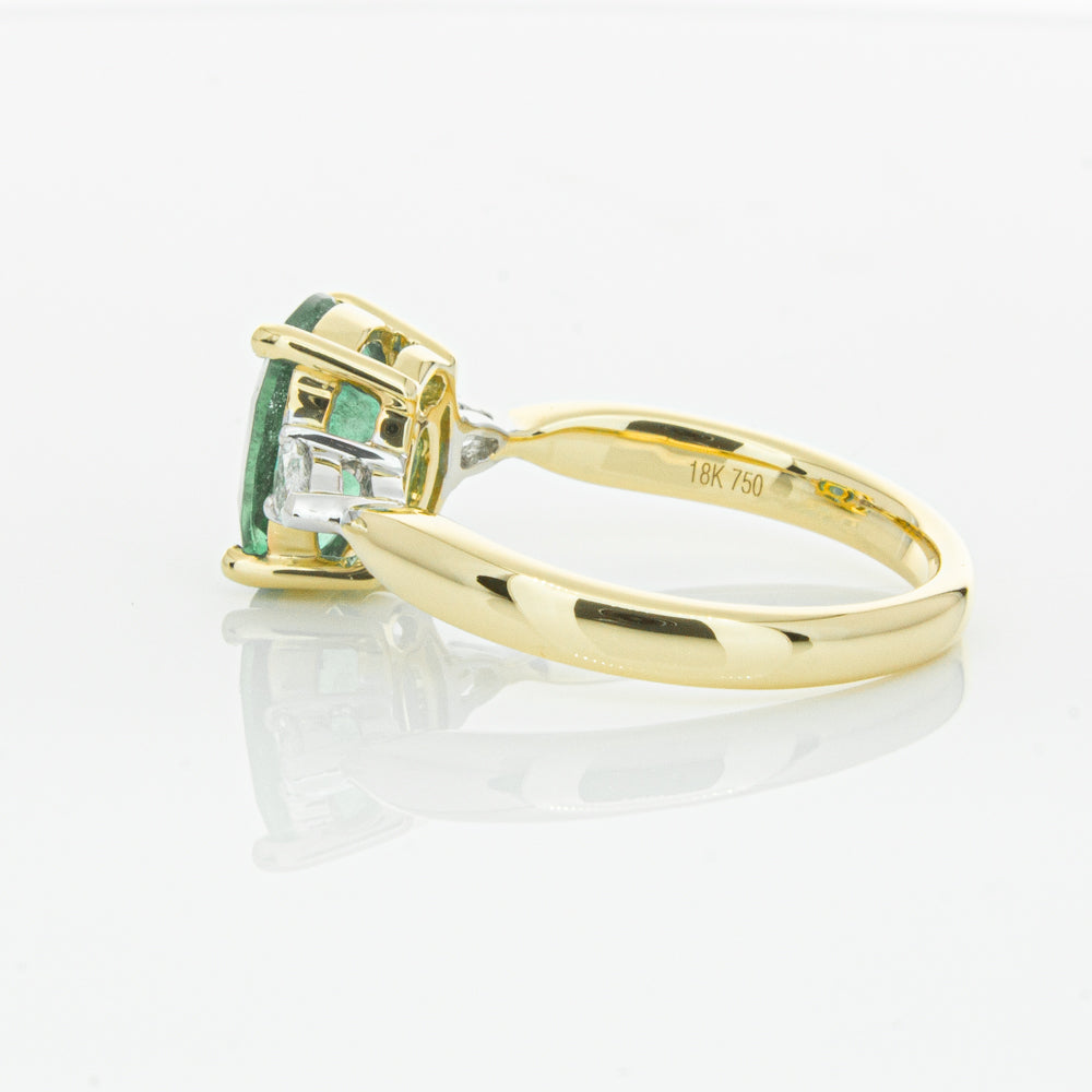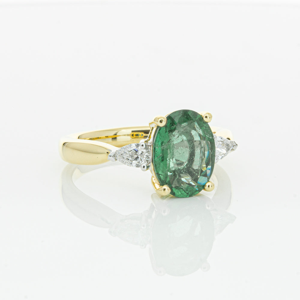 Carefully crafted in 18ct yellow gold from our signature 1899 collection,  this ring features an oval faceted emerald and two dazzling trilliant cut shoulder diamonds.
