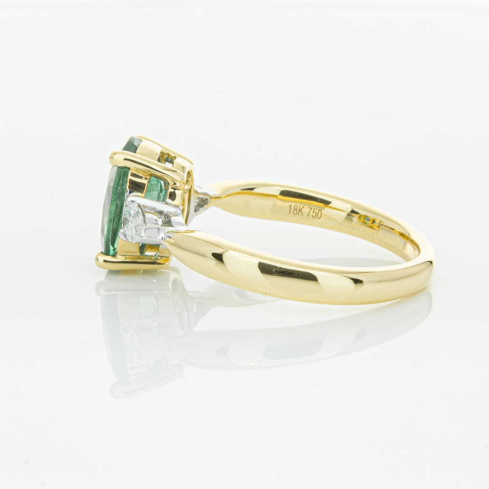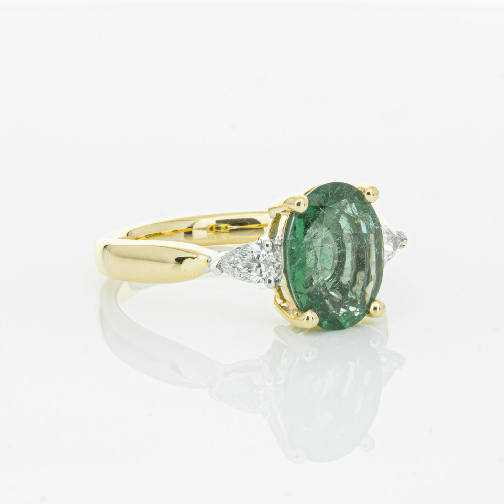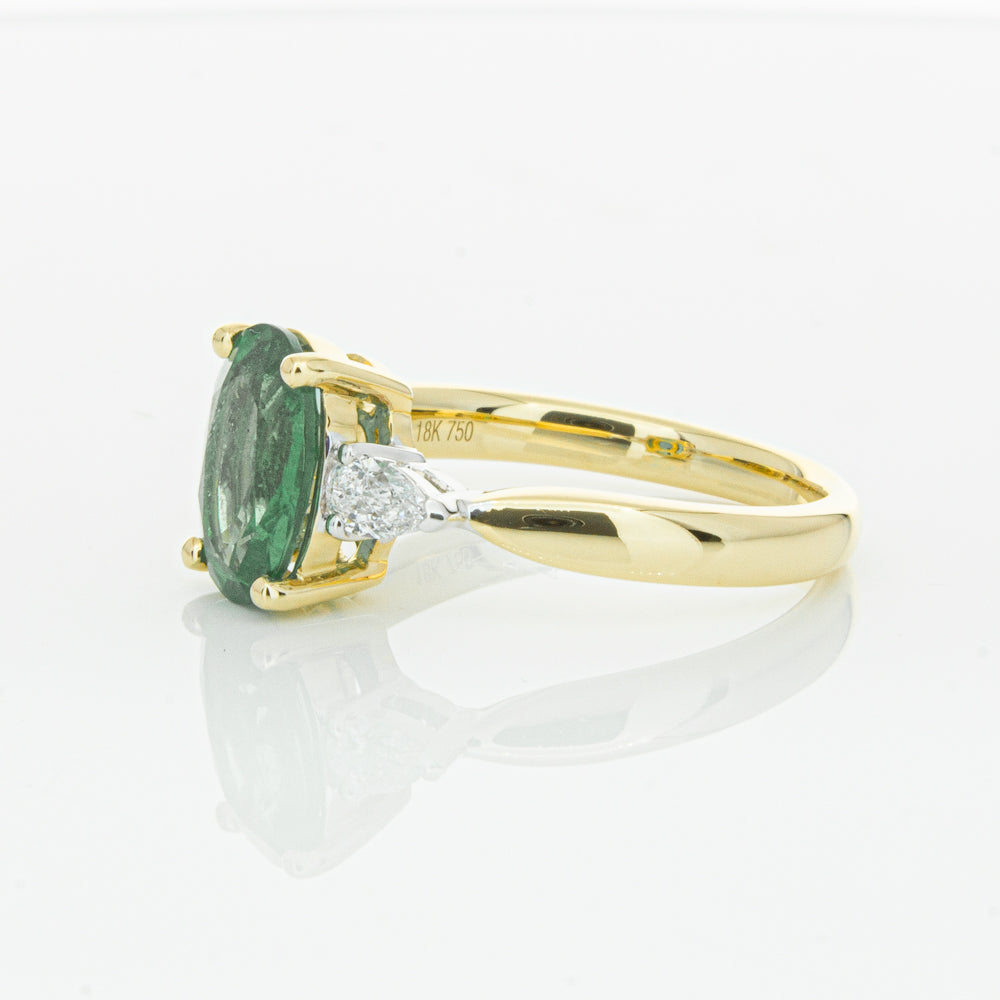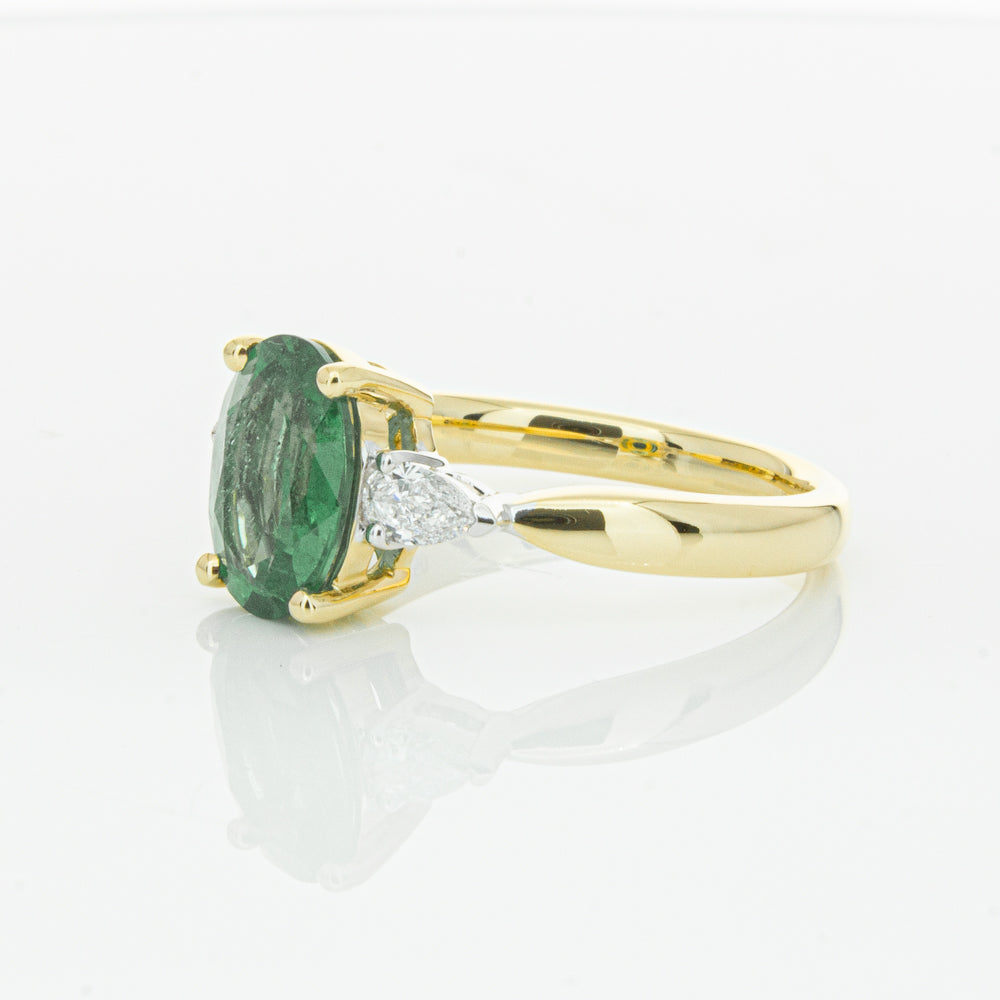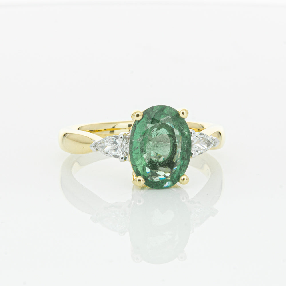 Carefully crafted in 18ct yellow gold from our signature 1899 collection,  this ring features an oval faceted emerald and two dazzling trilliant cut shoulder diamonds.