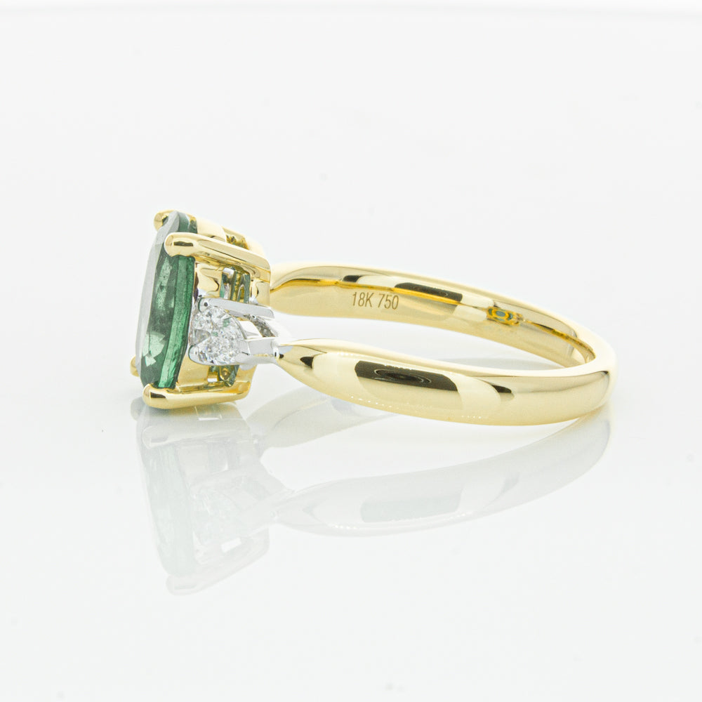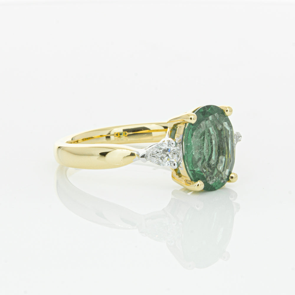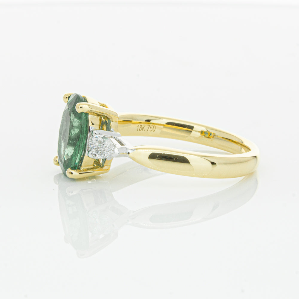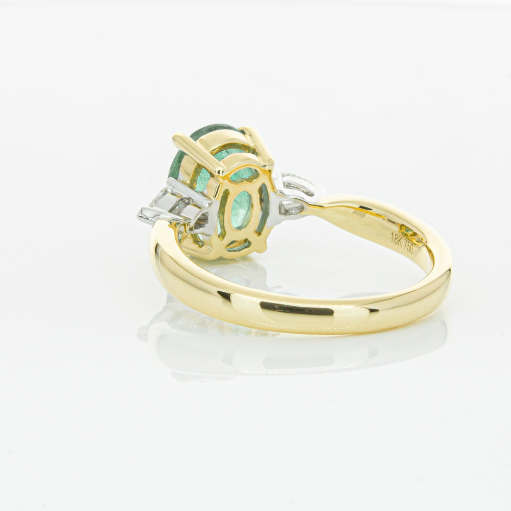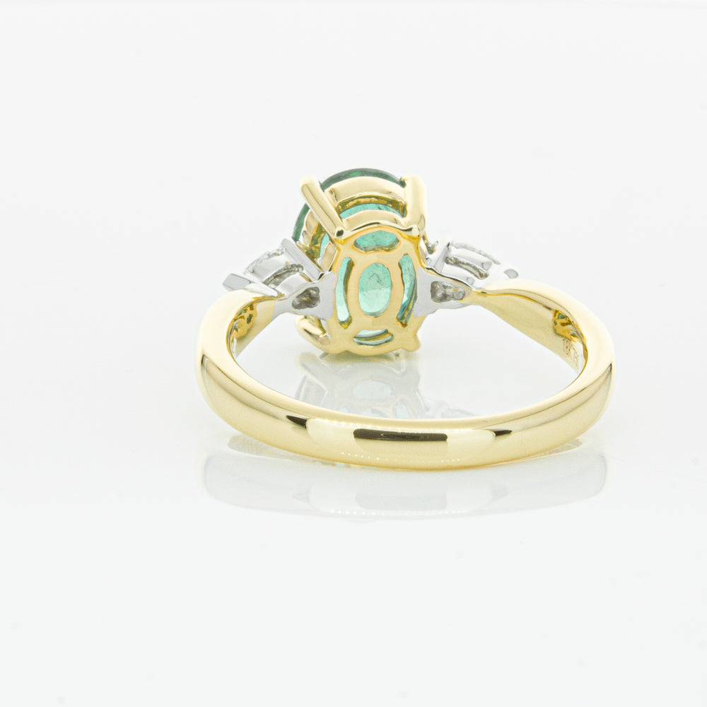 Carefully crafted in 18ct yellow gold from our signature 1899 collection,  this ring features an oval faceted emerald and two dazzling trilliant cut shoulder diamonds.