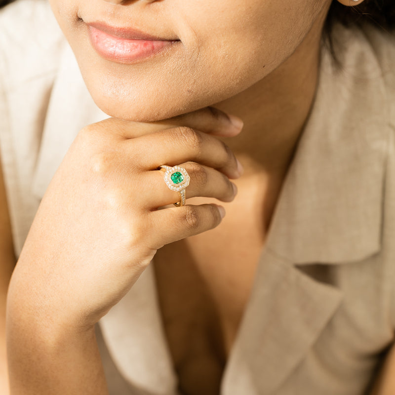 Carefully crafted in 18ct yellow gold, this beautiful ring features one octagonal cut emerald set in a octagonal diamond cluster setting. This stunning emerald is framed by a halo of white diamonds and is resting on diamond set shoulders.
