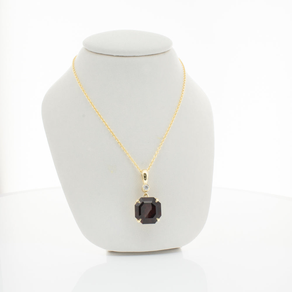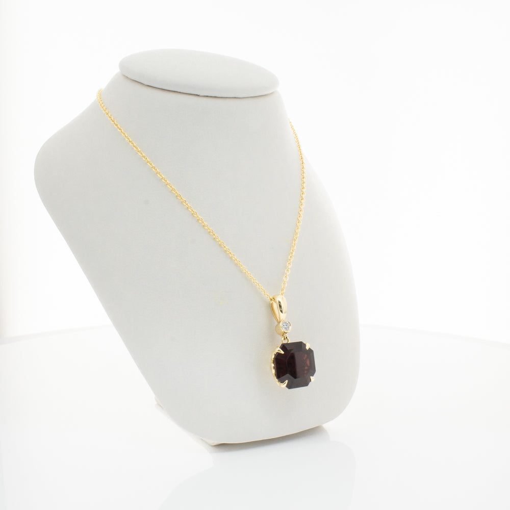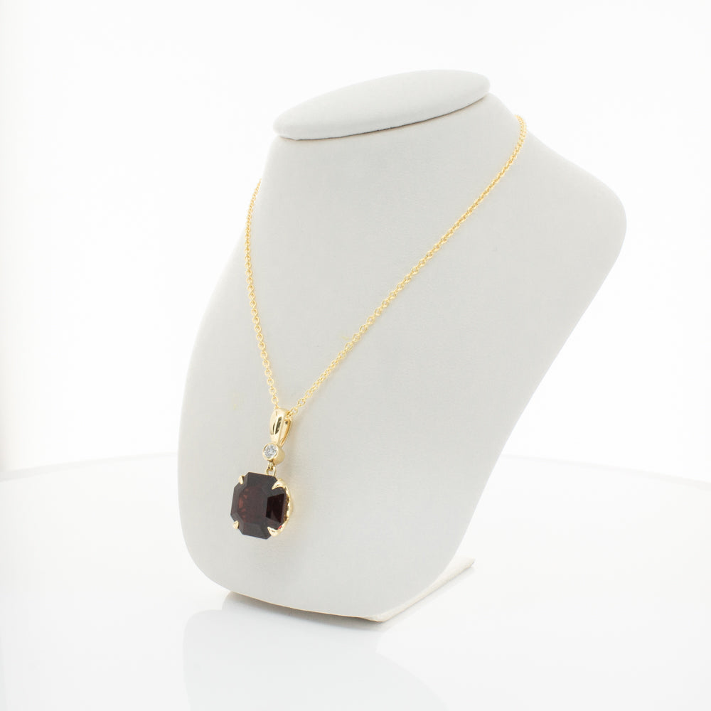 Carefully crafted in 18ct yellow gold, this stunning Octavia pendant boasts a custom cut eight-sided garnet with one round brilliant cut diamond.
