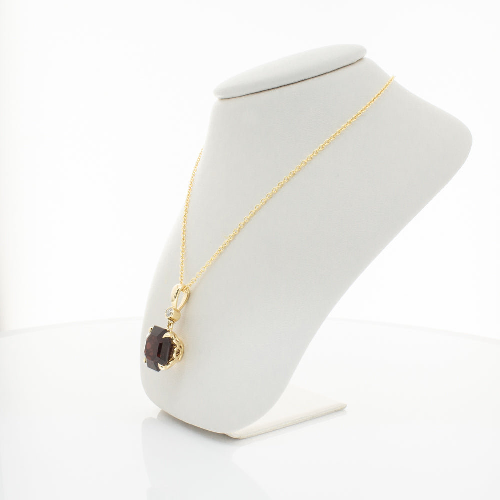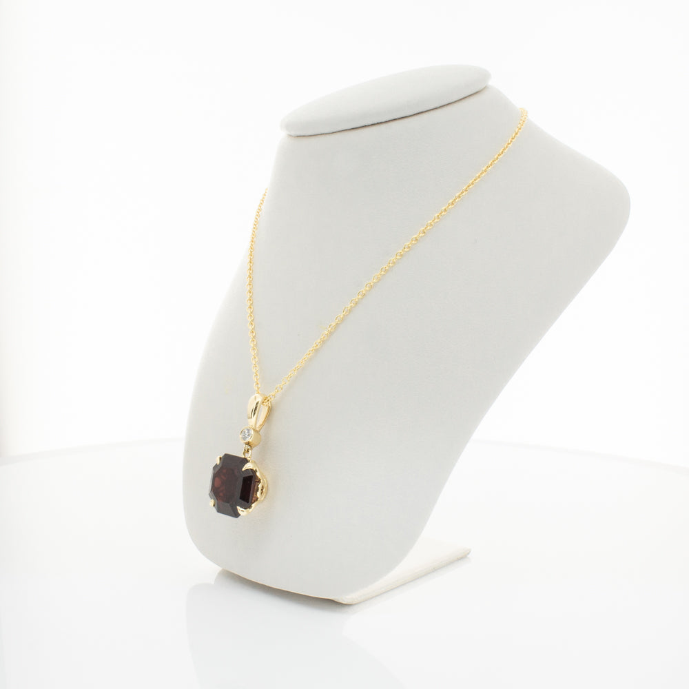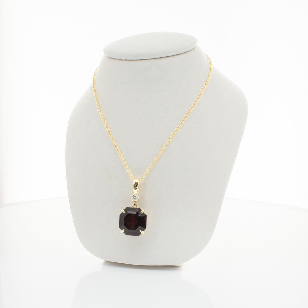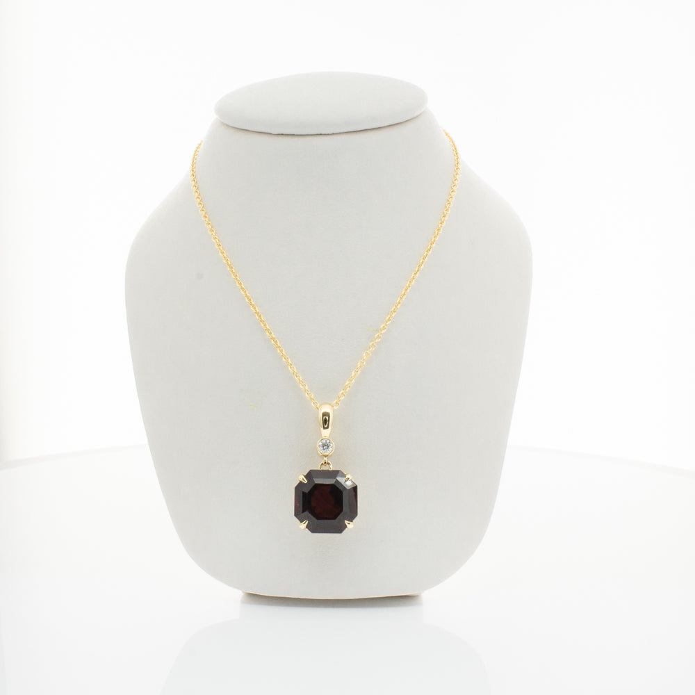 Carefully crafted in 18ct yellow gold, this stunning Octavia pendant boasts a custom cut eight-sided garnet with one round brilliant cut diamond.