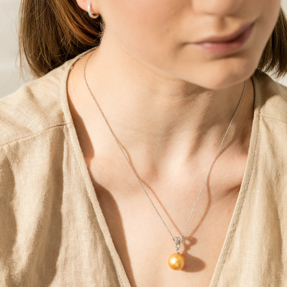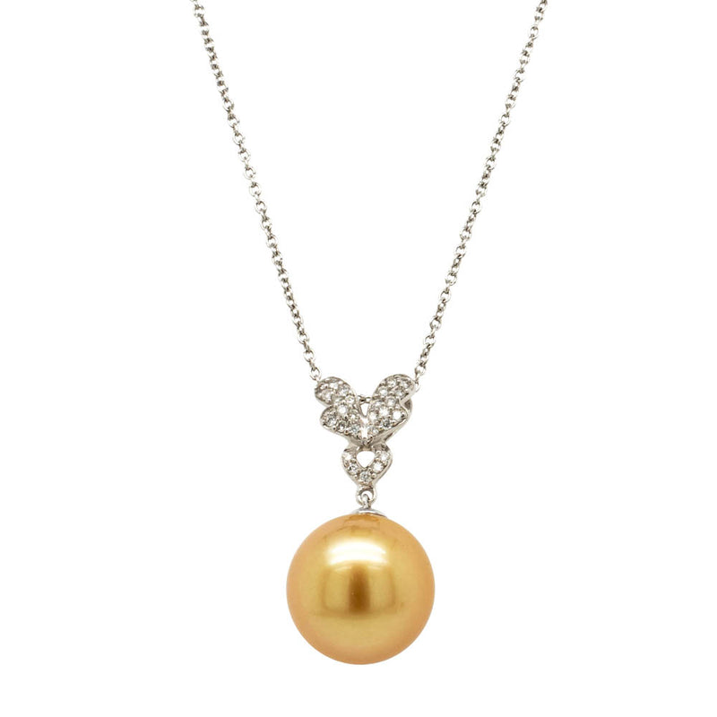 Stand out wearing this sparkling pearl and diamond pendant! Crafted from beautiful 18ct white gold this breathtaking piece features a peg set south sea golden pearl which swings from a diamond set bail. You are sure to receive many compliments wearing this magnificent piece. So go on, Treat yourself!
