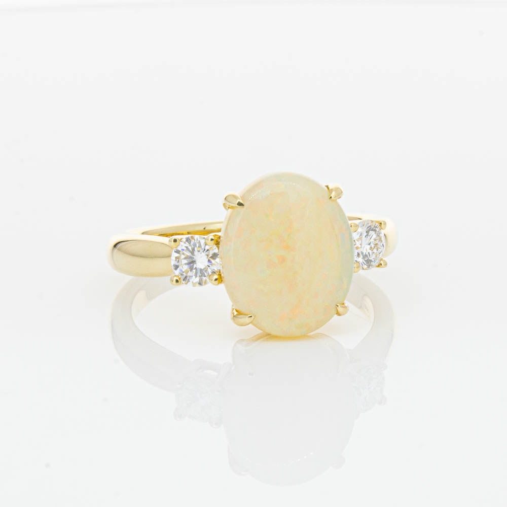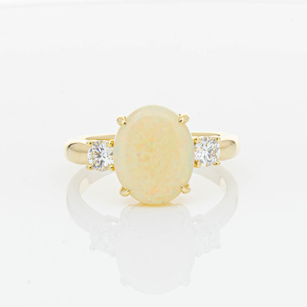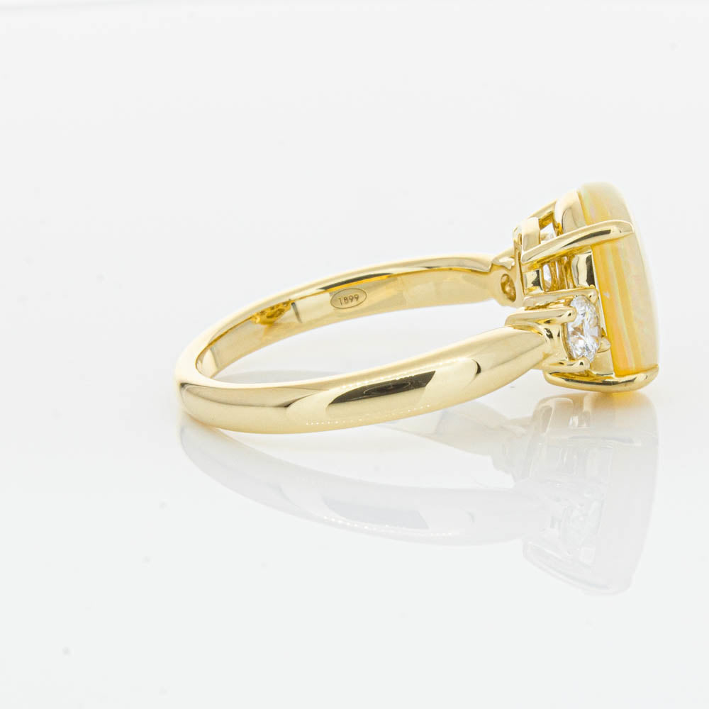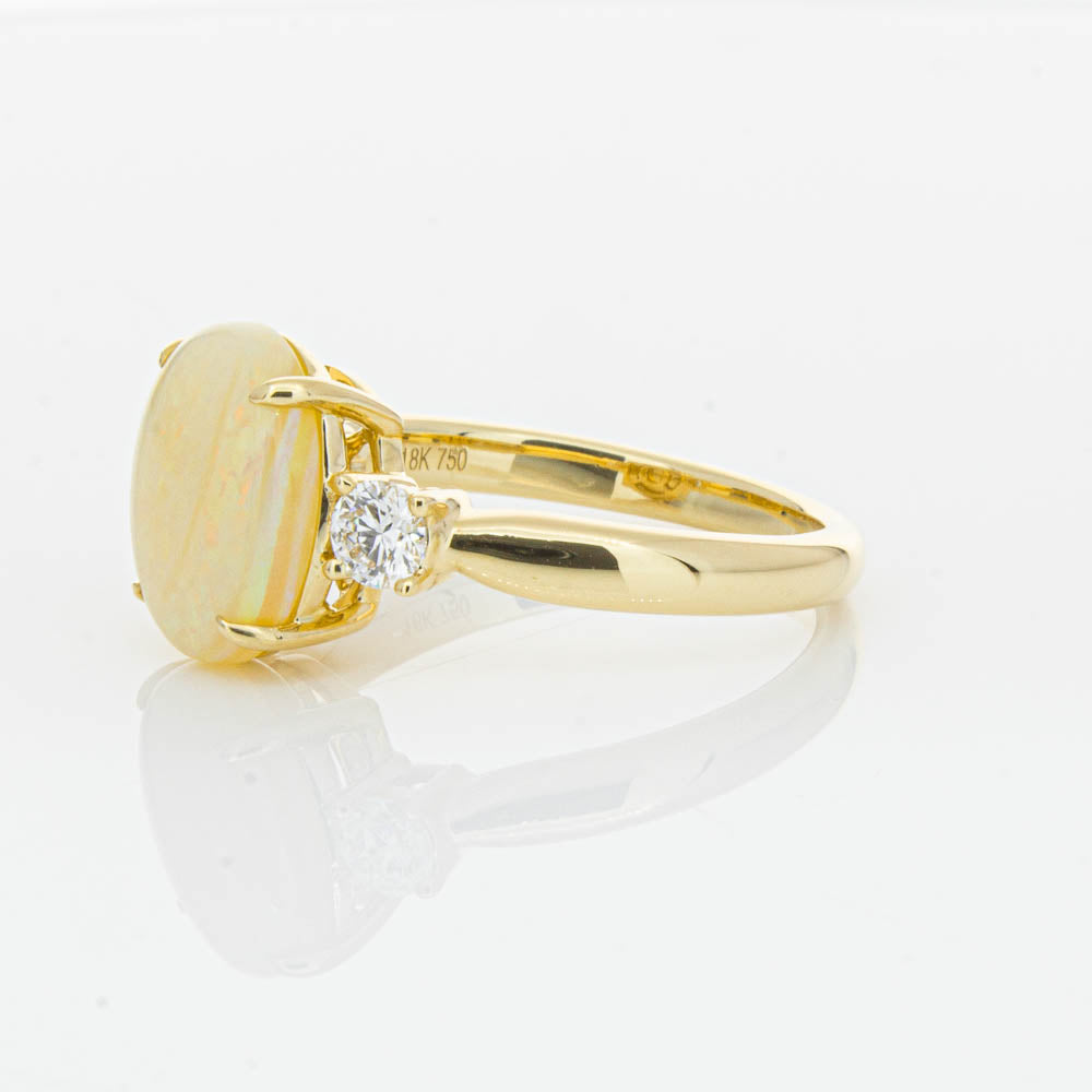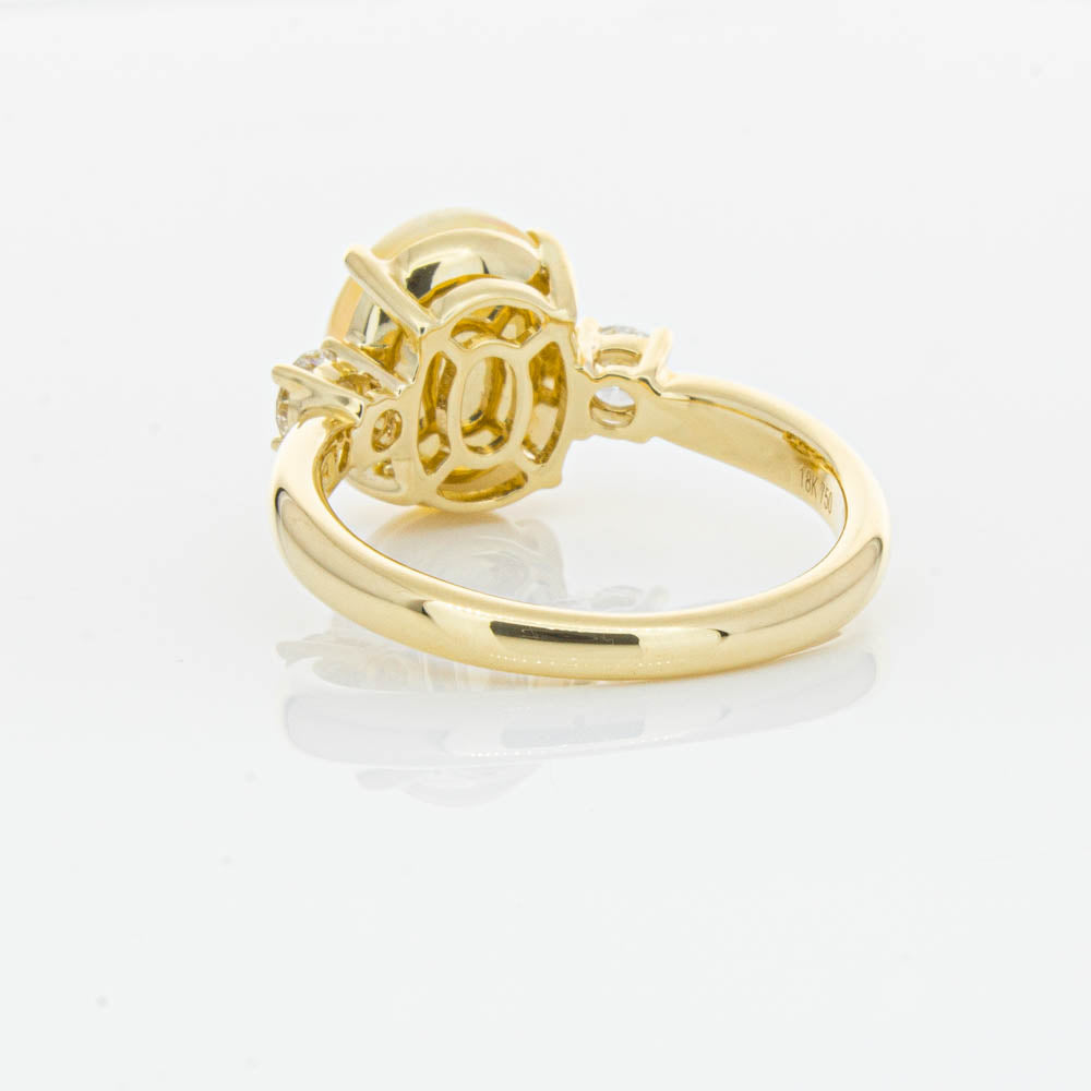 Truly breathtaking.. this striking opal & diamond ring is sure to impress! Carefully set in 18ct yellow gold, this radiant ring boasts one exquisite oval opal that consists of a play of green and orange set inside a pair of round brilliant cut diamonds.