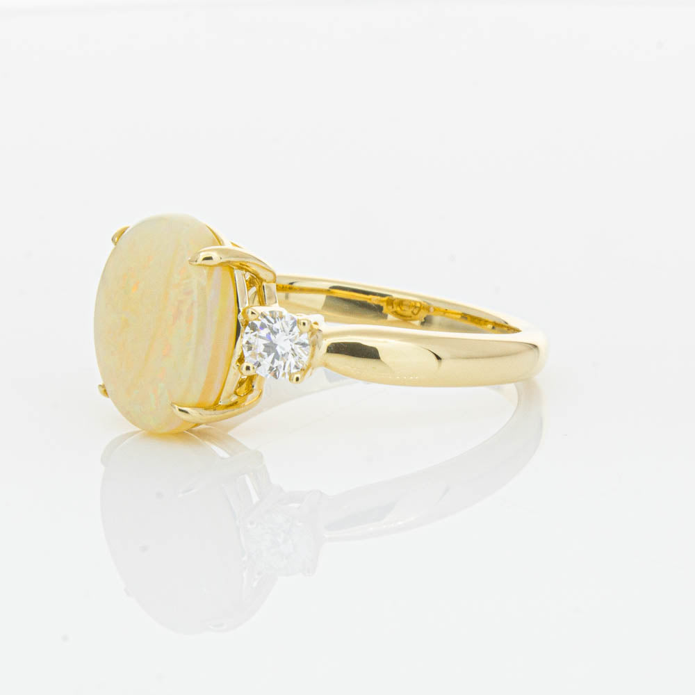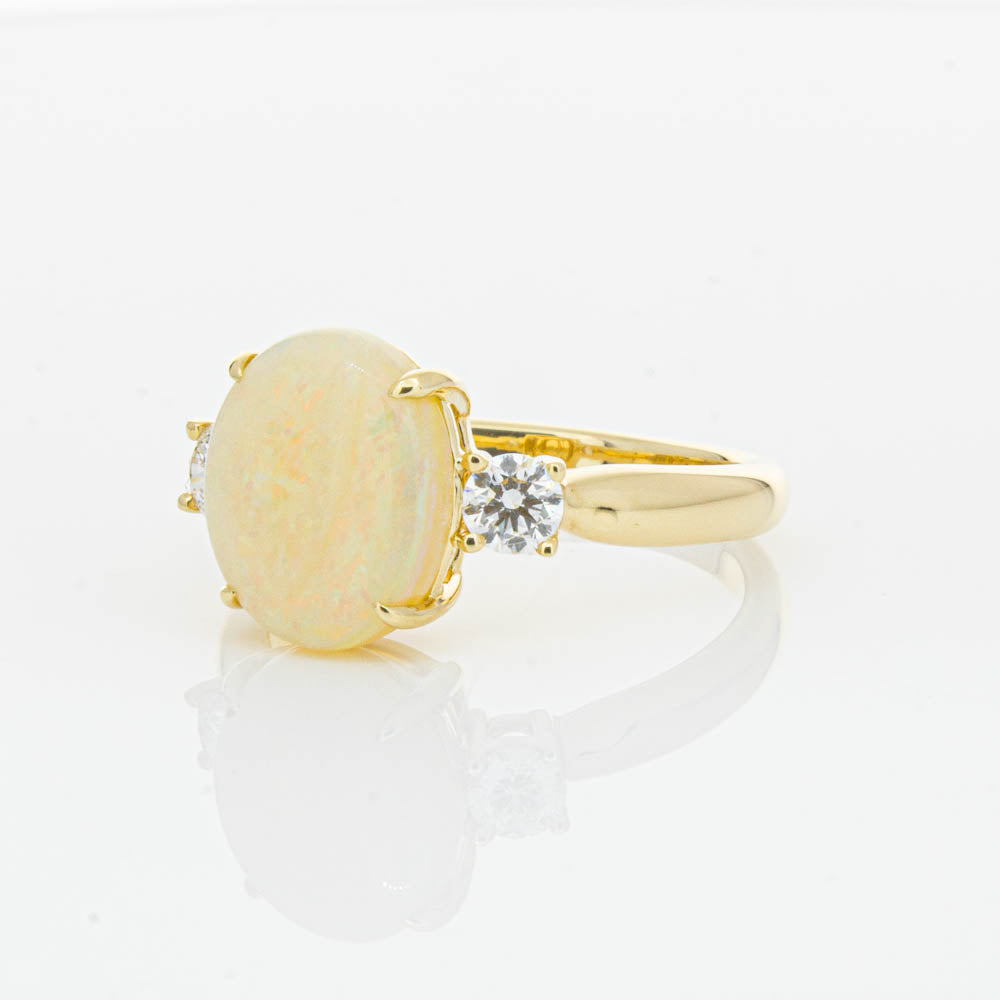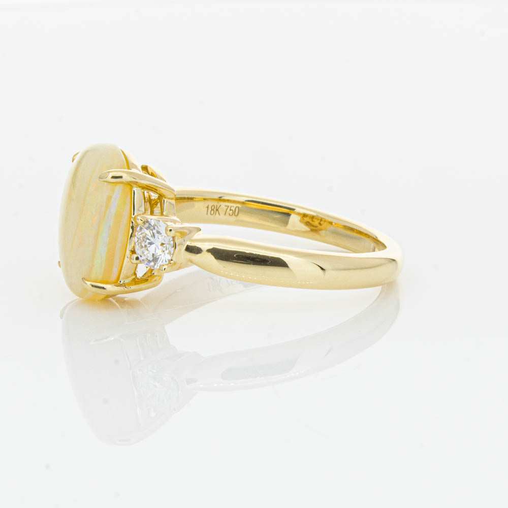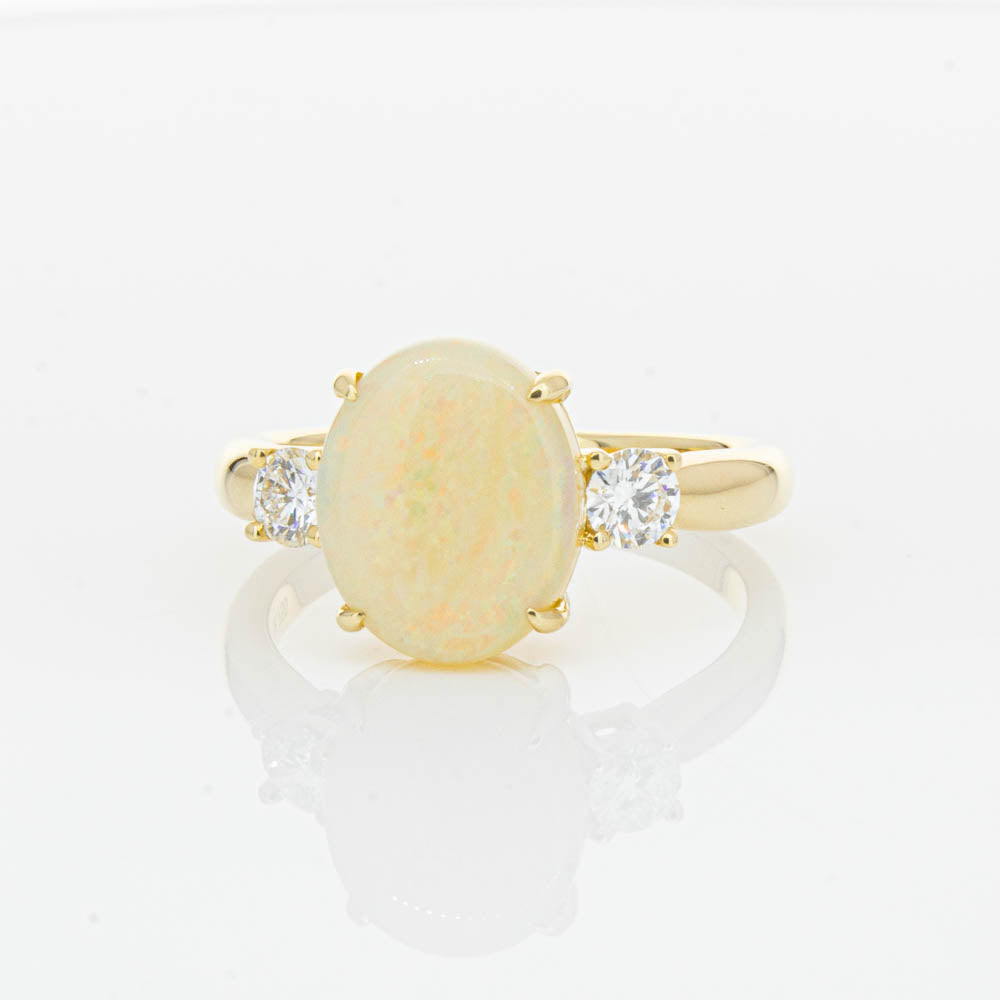 Truly breathtaking.. this striking opal & diamond ring is sure to impress! Carefully set in 18ct yellow gold, this radiant ring boasts one exquisite oval opal that consists of a play of green and orange set inside a pair of round brilliant cut diamonds.