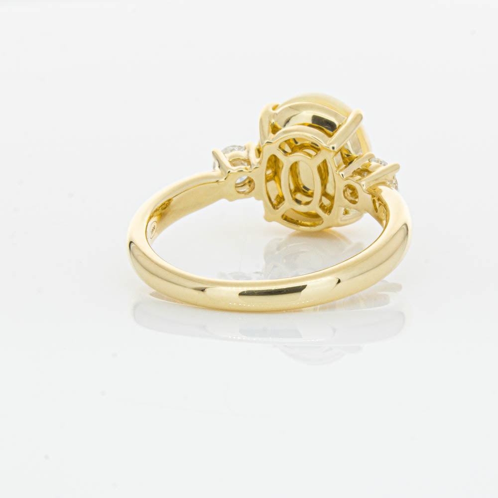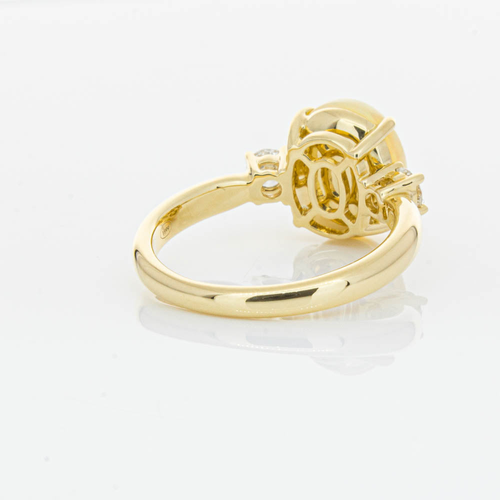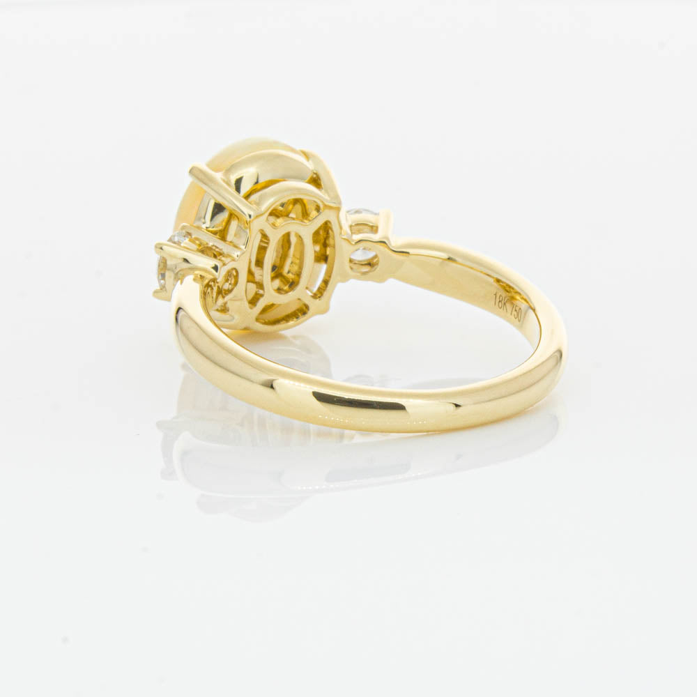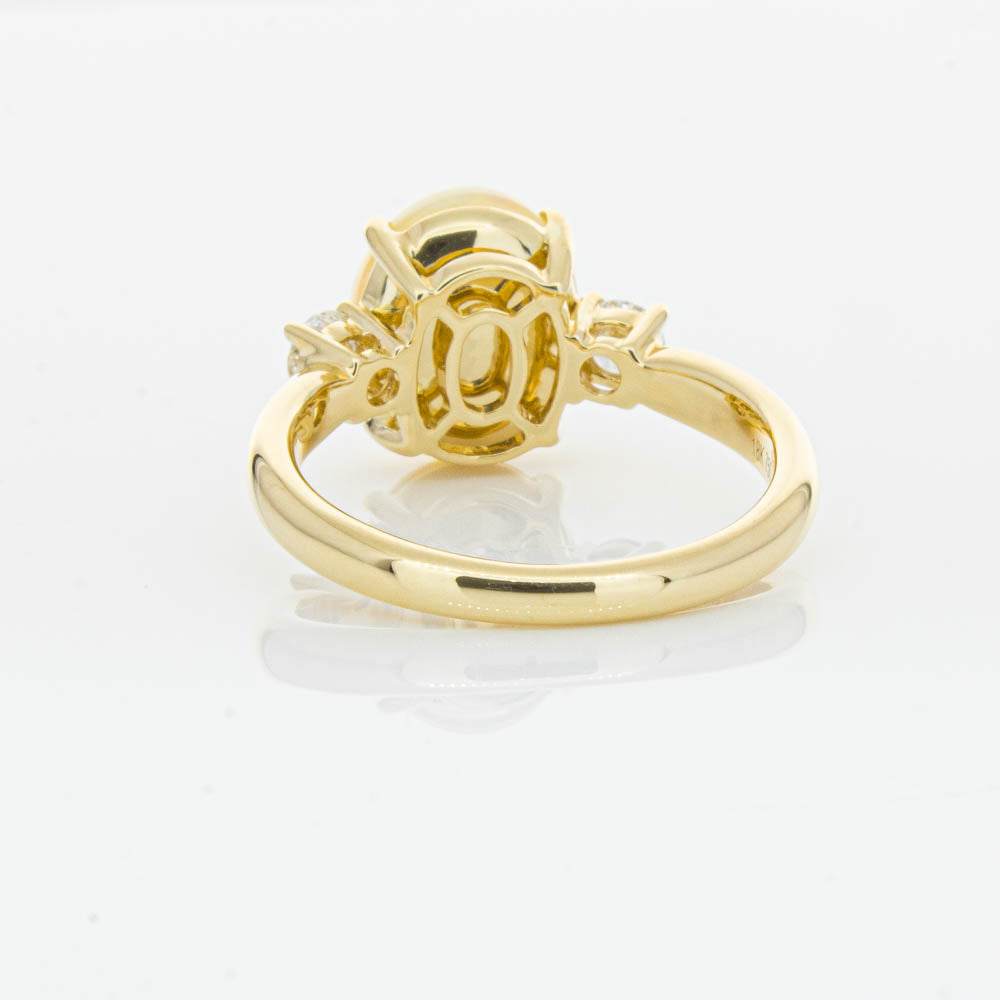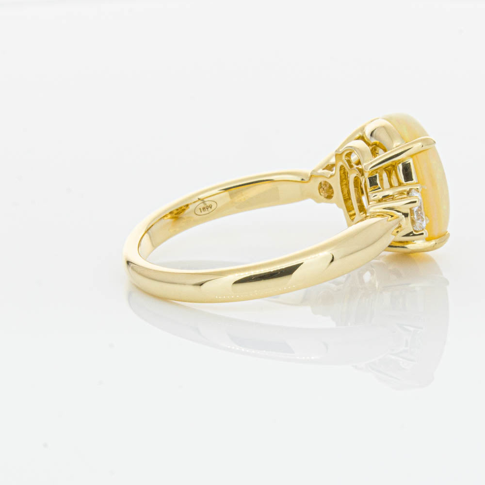 Truly breathtaking.. this striking opal & diamond ring is sure to impress! Carefully set in 18ct yellow gold, this radiant ring boasts one exquisite oval opal that consists of a play of green and orange set inside a pair of round brilliant cut diamonds.