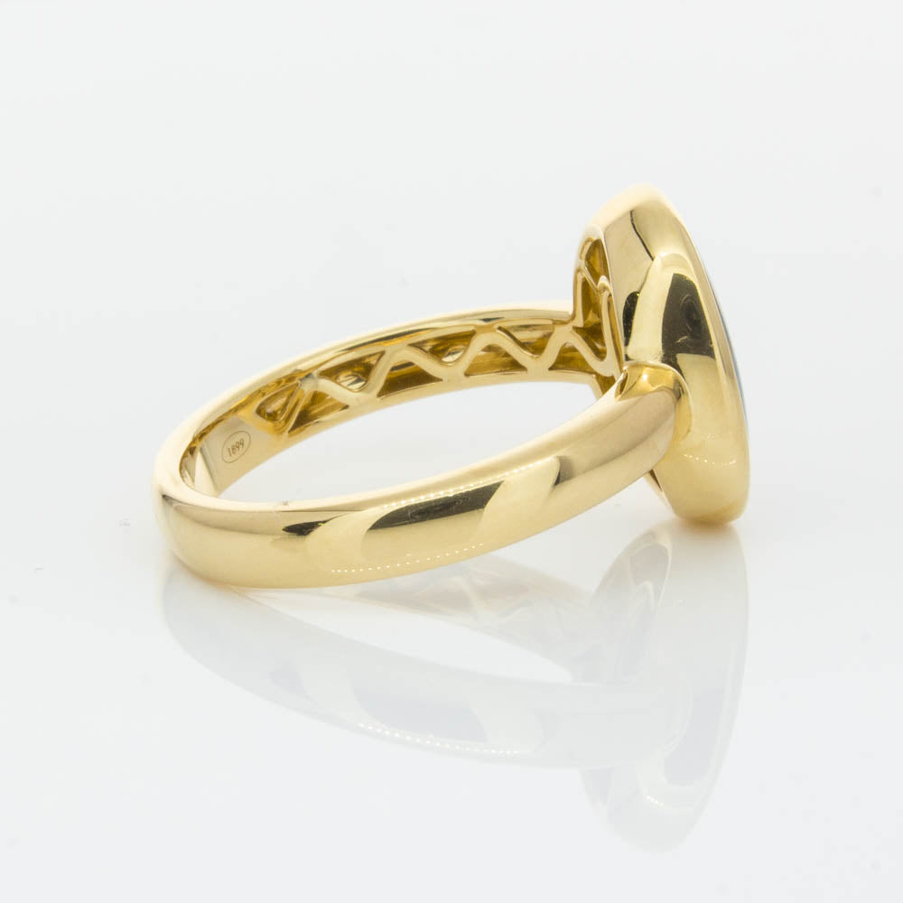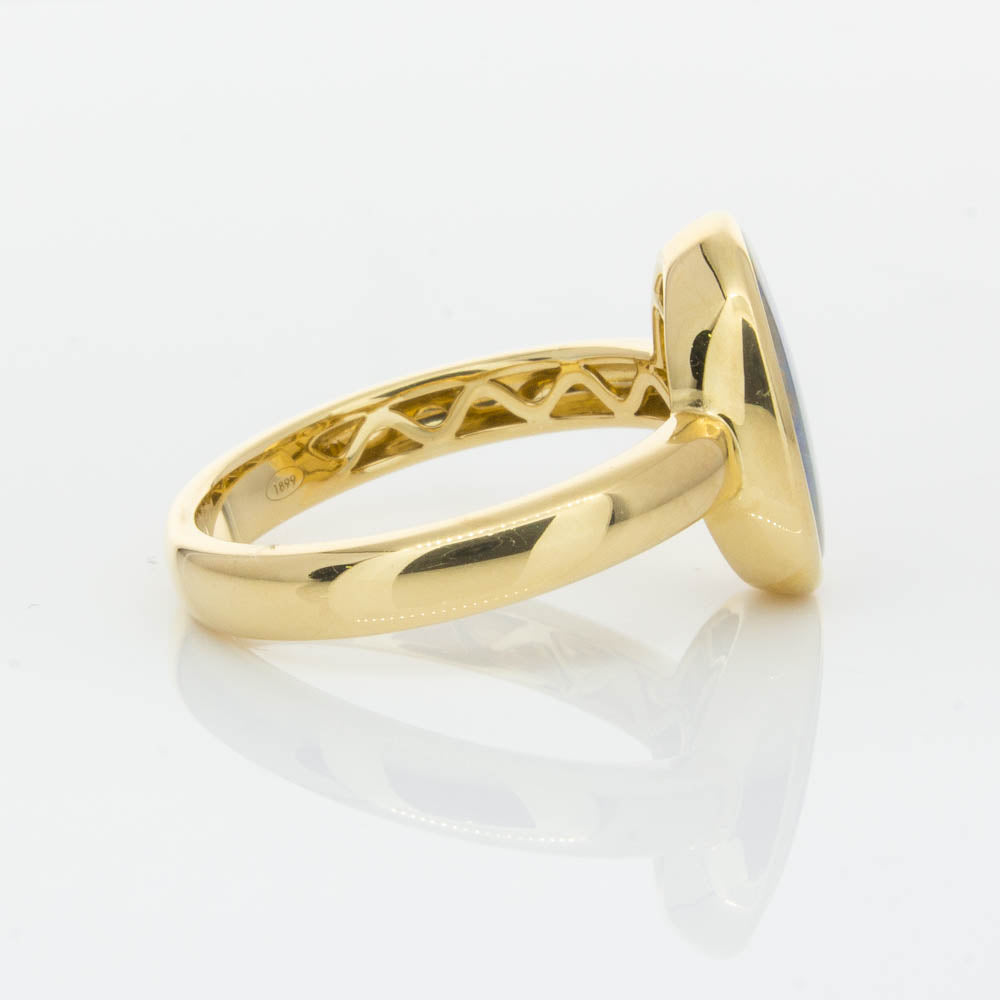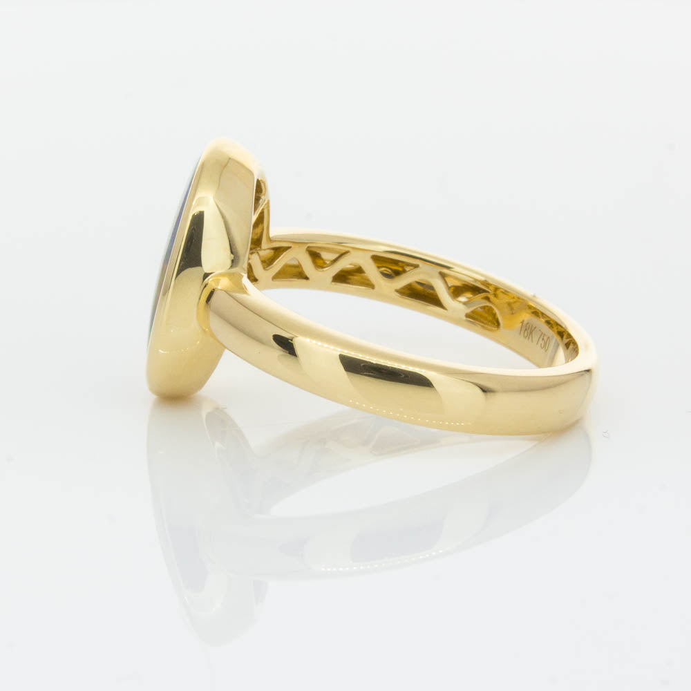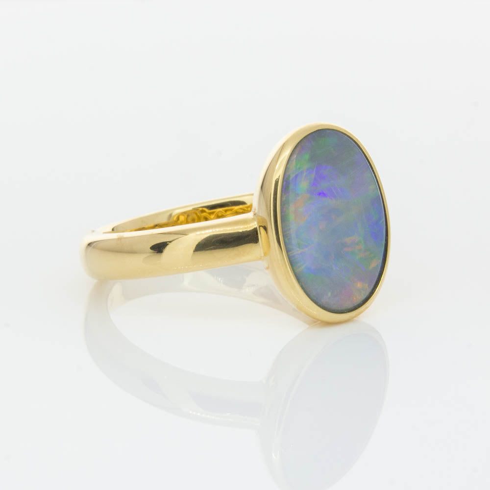 Truly breathtaking.. this striking opal ring is sure to impress! Carefully set in 18ct yellow gold, this radiant ring boasts one exquisite oval opal that consists of a play of blue, violet and orange.