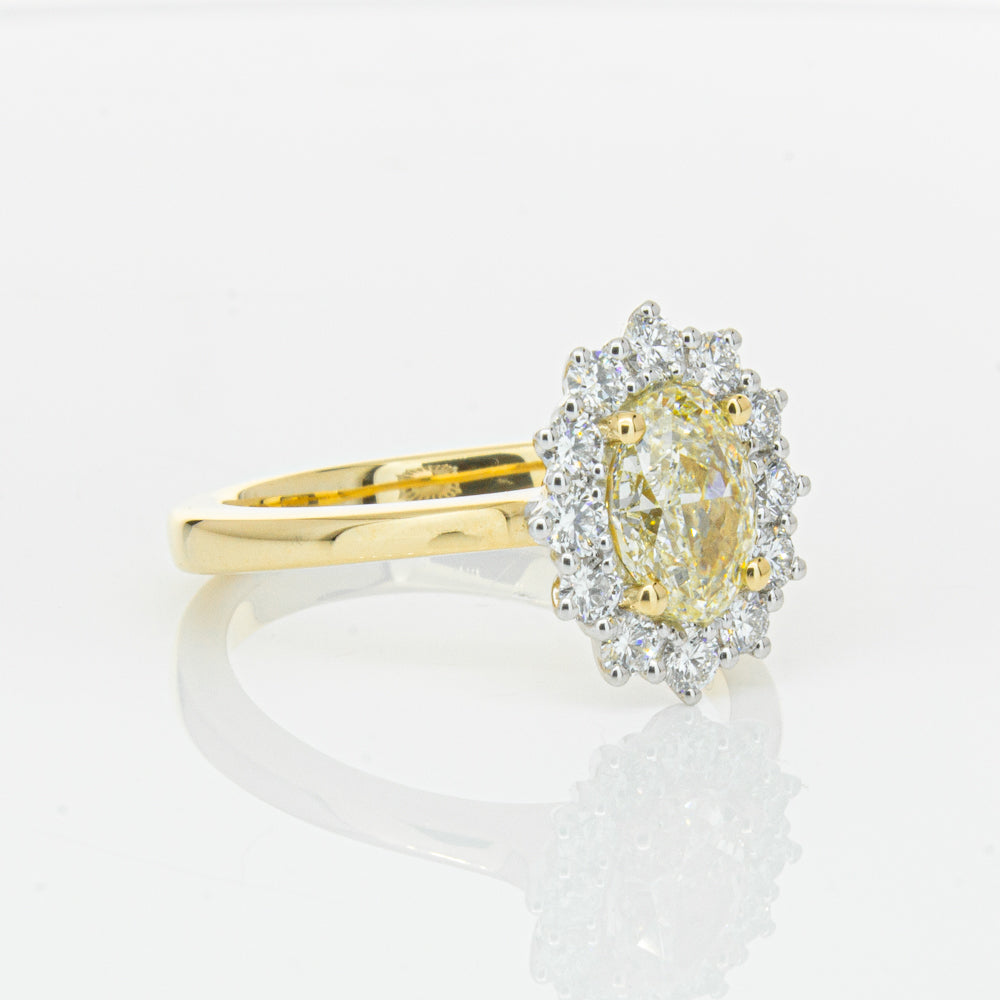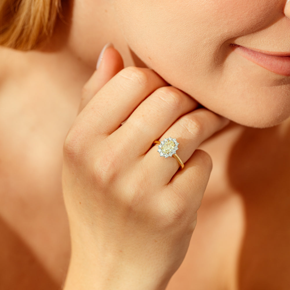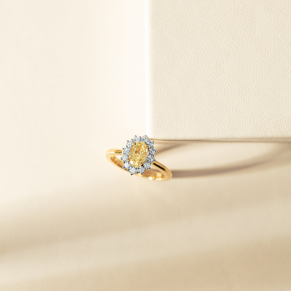 This beautiful Belle Ring features a breathtaking oval cut yellow diamond with a halo of round brilliant cut diamonds. Magnificent from every angle, this stunning ring is the hallmark of elegance and opulence.