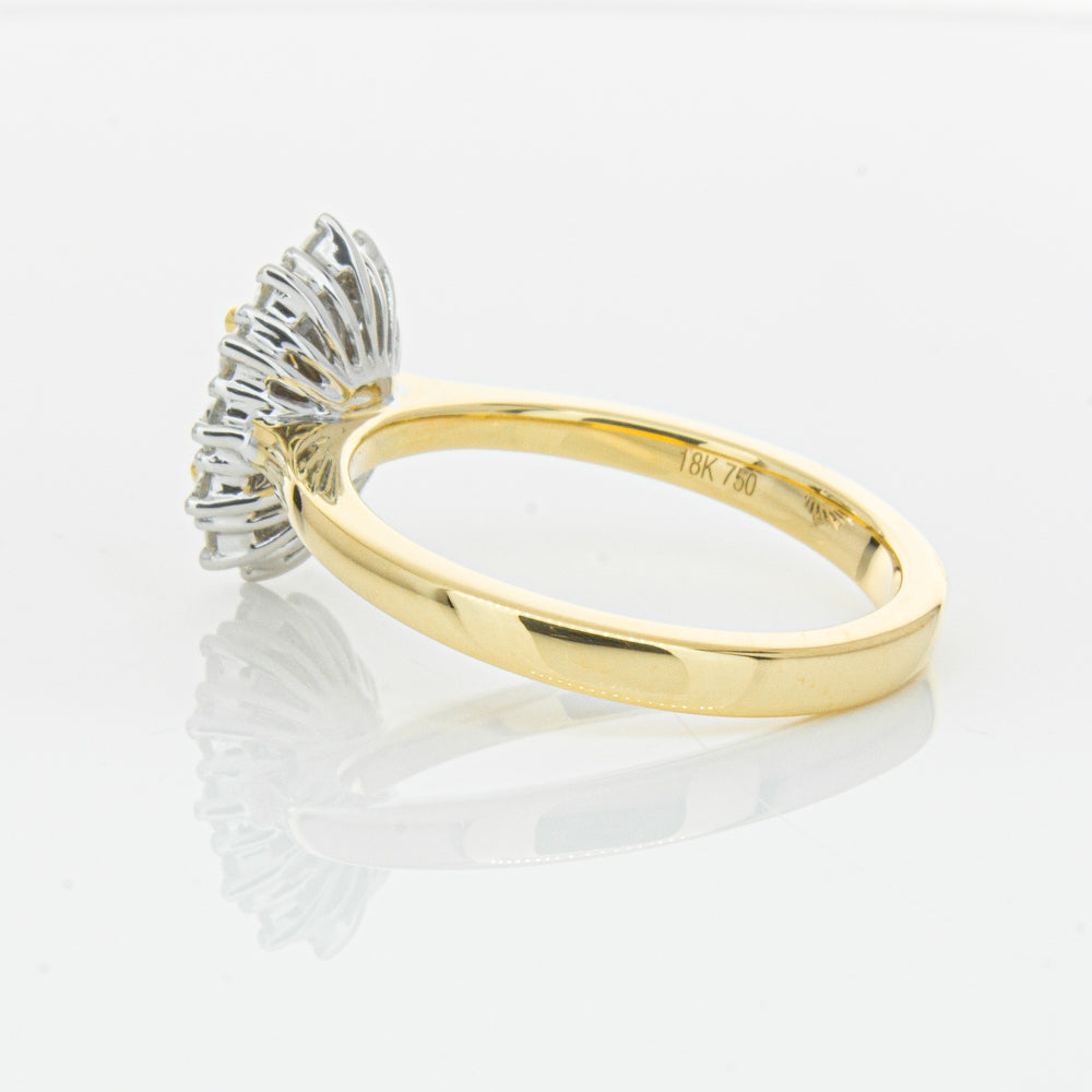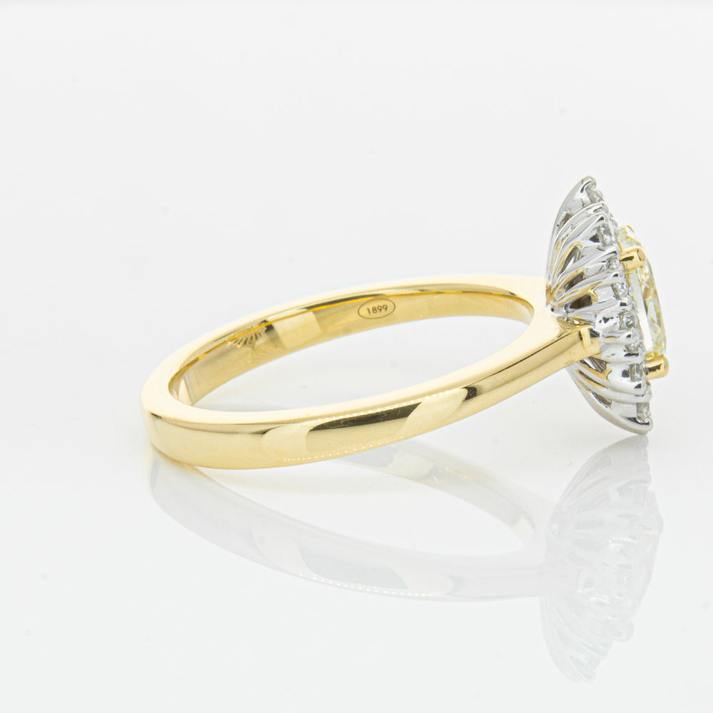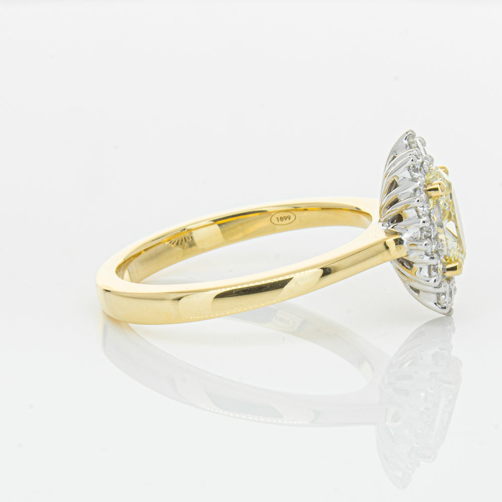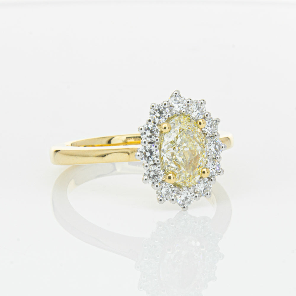 This beautiful Belle Ring features a breathtaking oval cut yellow diamond with a halo of round brilliant cut diamonds. Magnificent from every angle, this stunning ring is the hallmark of elegance and opulence.