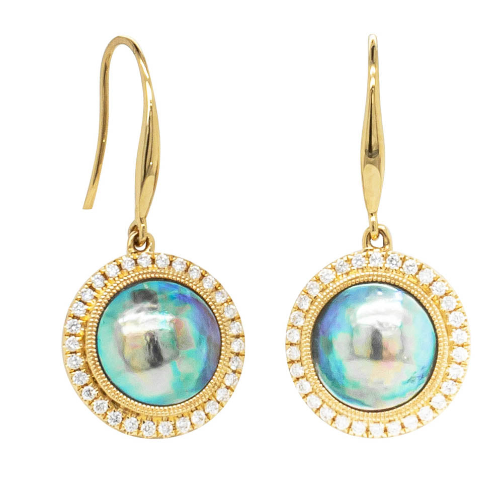 Take a piece of Aotearoa with you wherever you go in these beautiful paua and drop earrings! Crafted carefully from divine 18ct yellow gold from our signature 1899 collection, these earrings feature two round rubover set pauas with a beautiful play of blues and greens set on a diamond halo mount.
