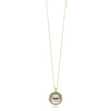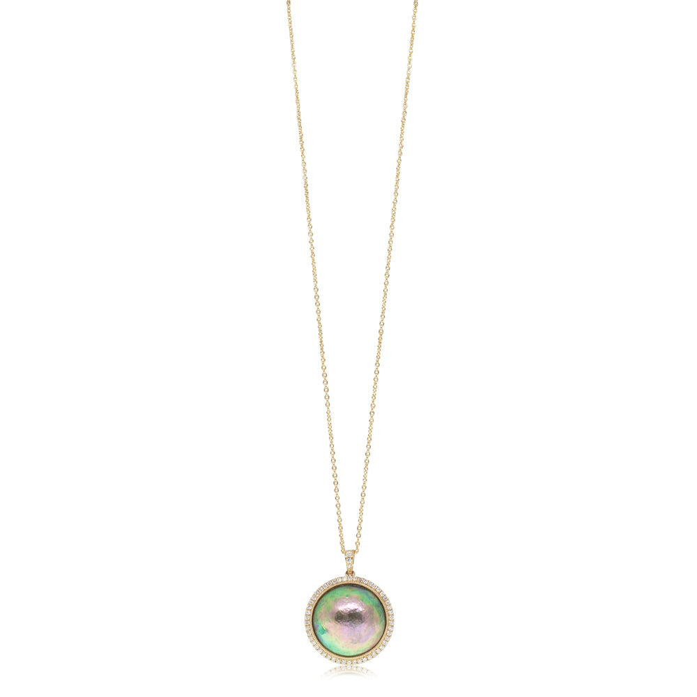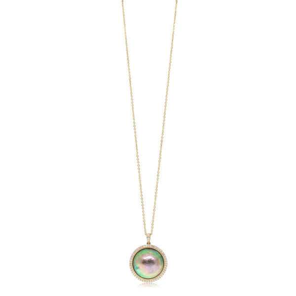 18ct yellow gold pendant boasts a paua pearl with a dazzling diamond halo and bail.