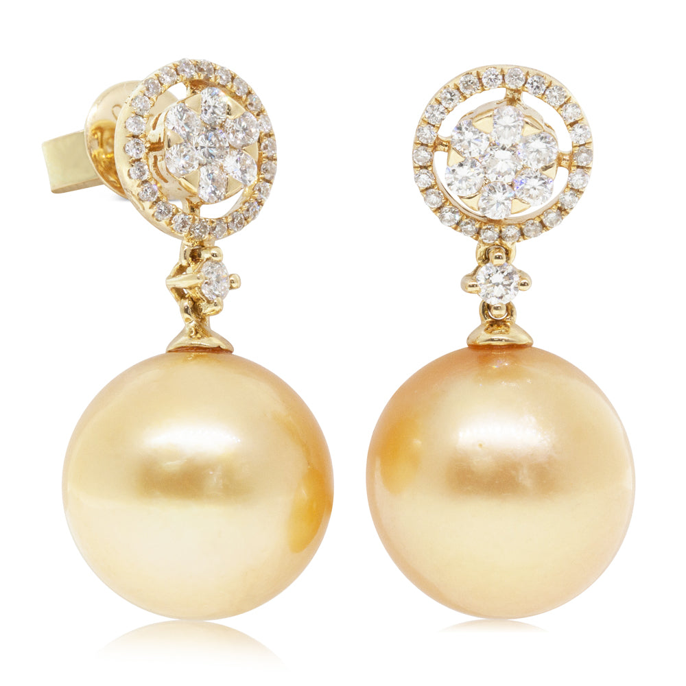 18ct yellow gold earrings featuring two golden pearls with sixty round brilliant cut diamonds.