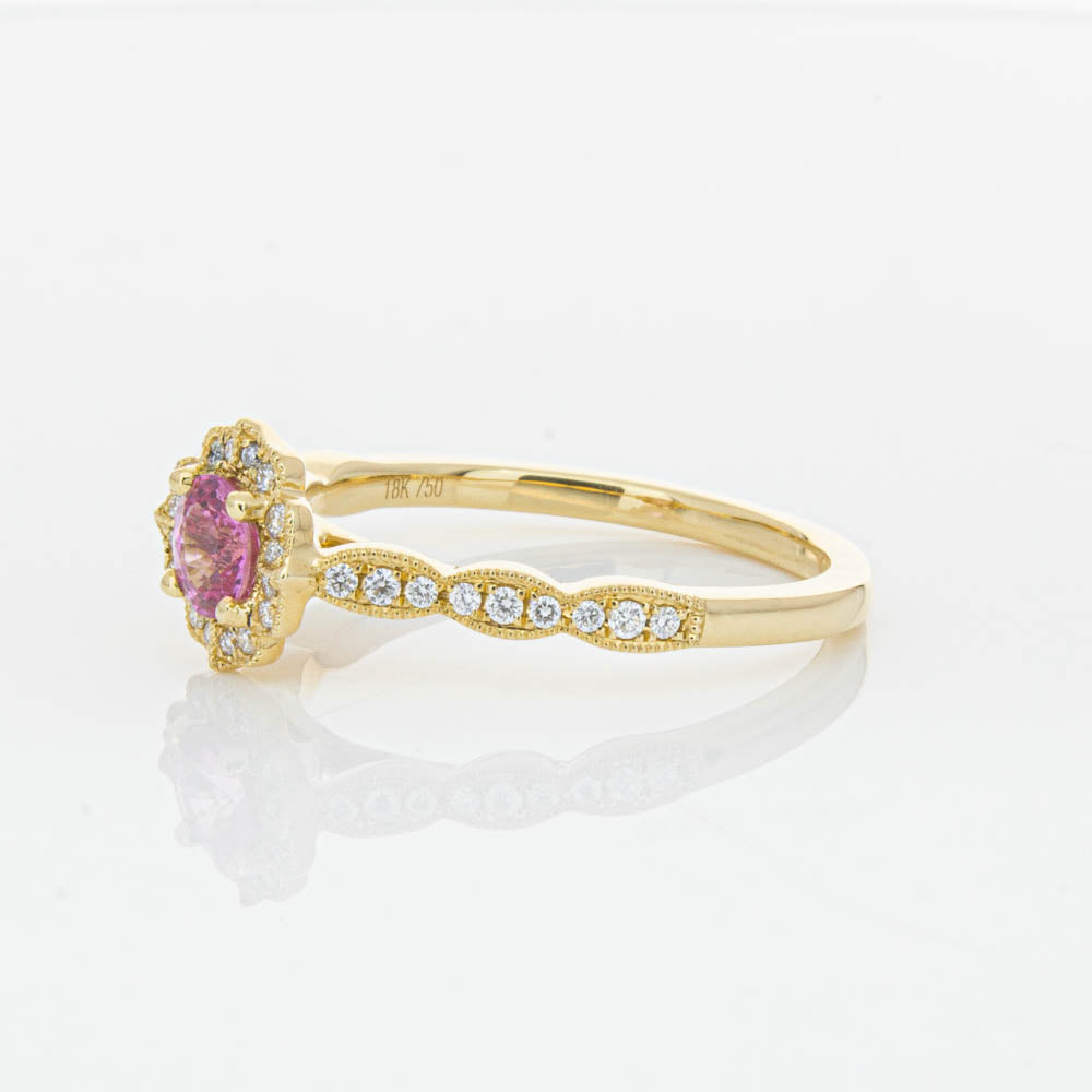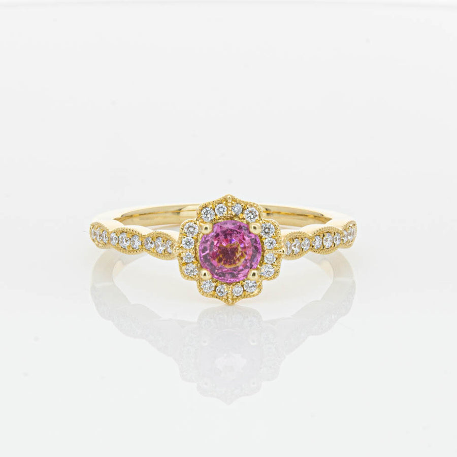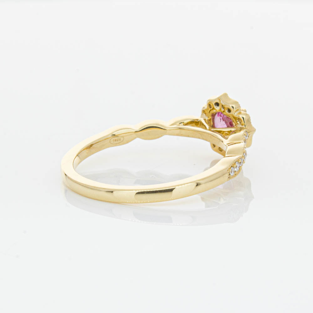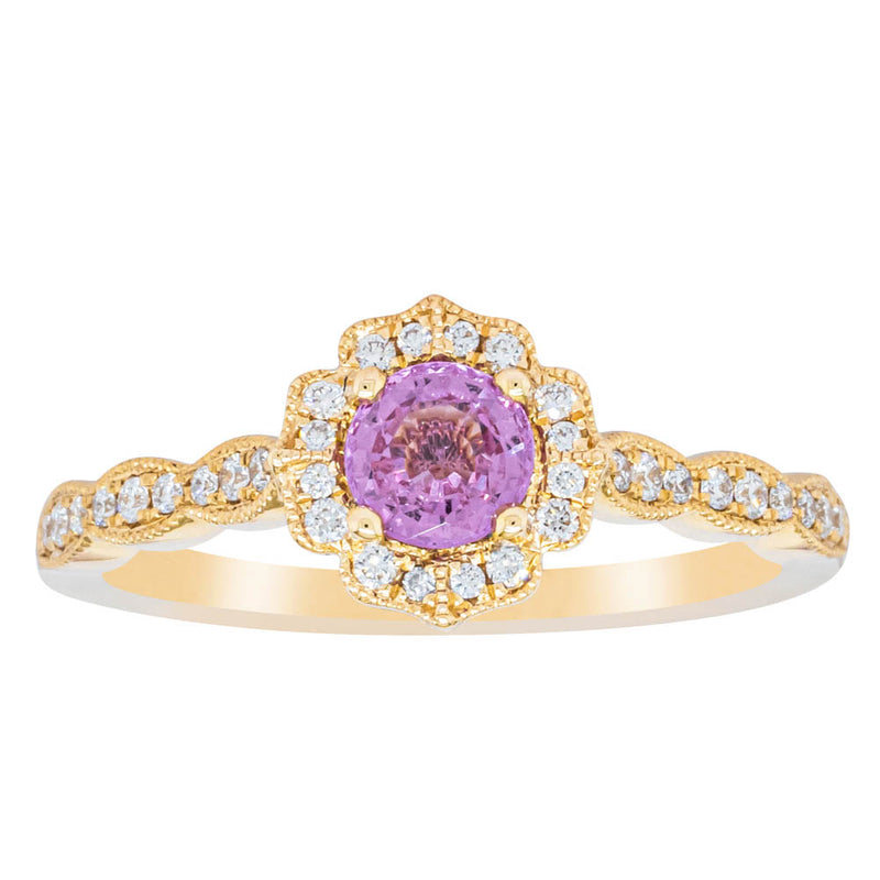 Carefully crafted in 18ct yellow gold this ring from our signature 1899 collection features a round faceted pink sapphire framed by a shimmering halo of round brilliant cut diamonds. You won't be able to resist showing of this lovely ring.