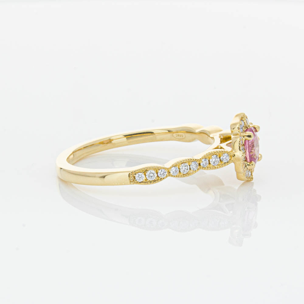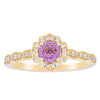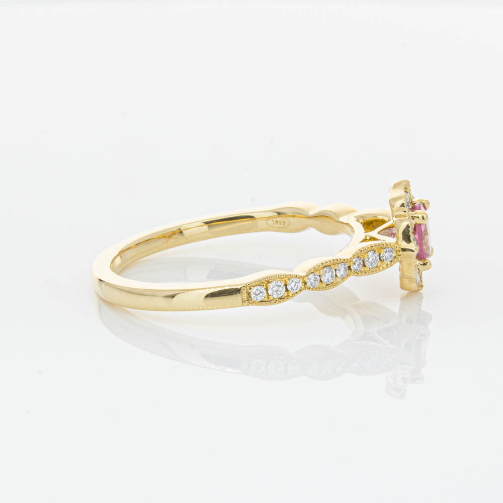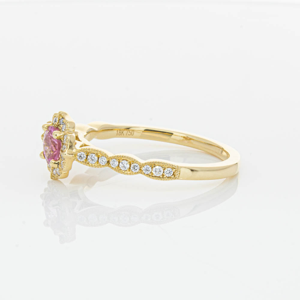 Carefully crafted in 18ct yellow gold this ring from our signature 1899 collection features a round faceted pink sapphire framed by a shimmering halo of round brilliant cut diamonds. You won't be able to resist showing of this lovely ring.