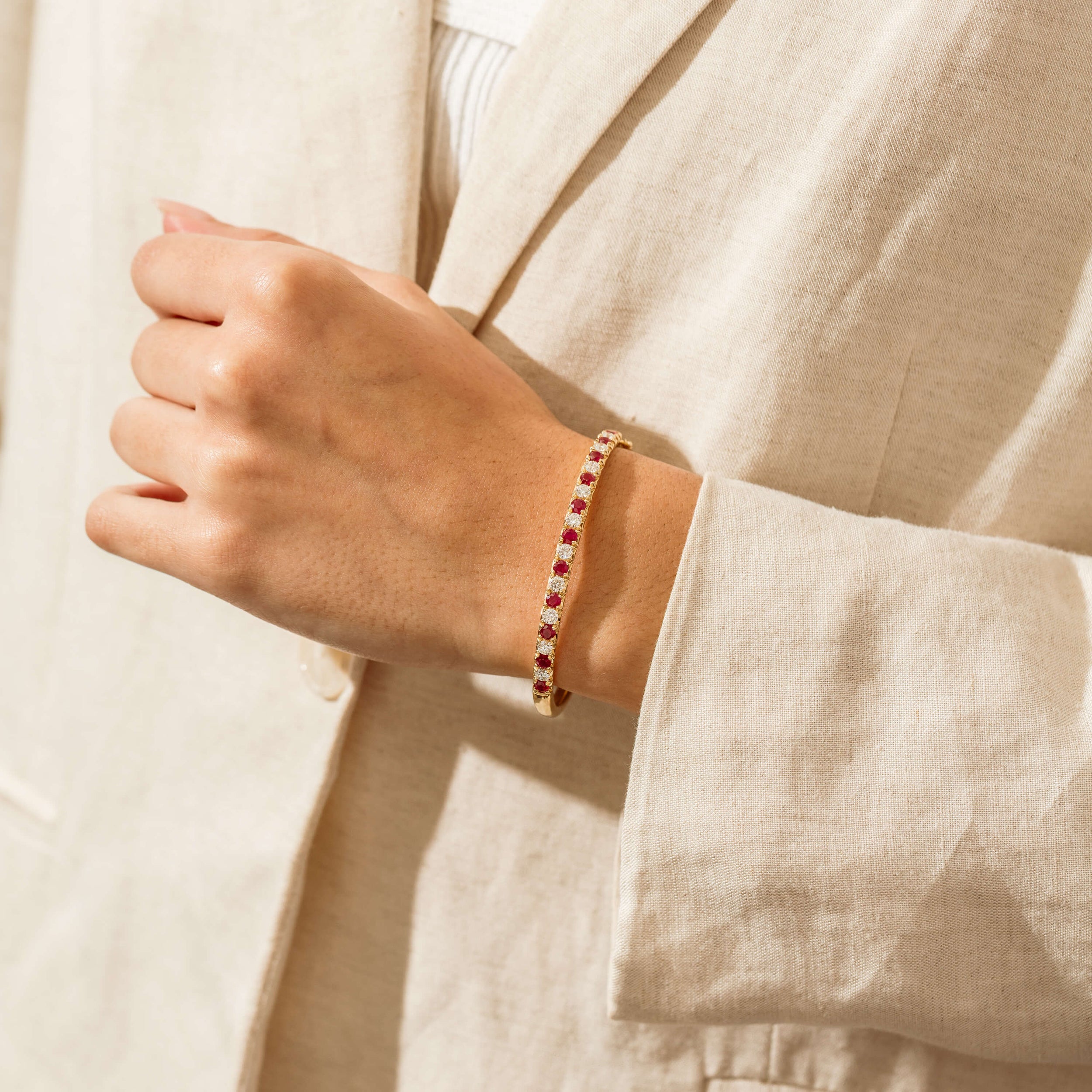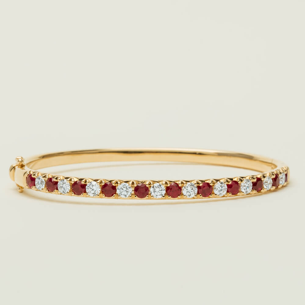 Designed for security and comfort, the bangle fastens with a push-in clasp and a pair of safety catches. The harmonious blend of rich yellow gold, radiant rubies, and bright diamonds makes this piece perfect for marking milestones, celebrating special occasions, or adding everyday sophistication.