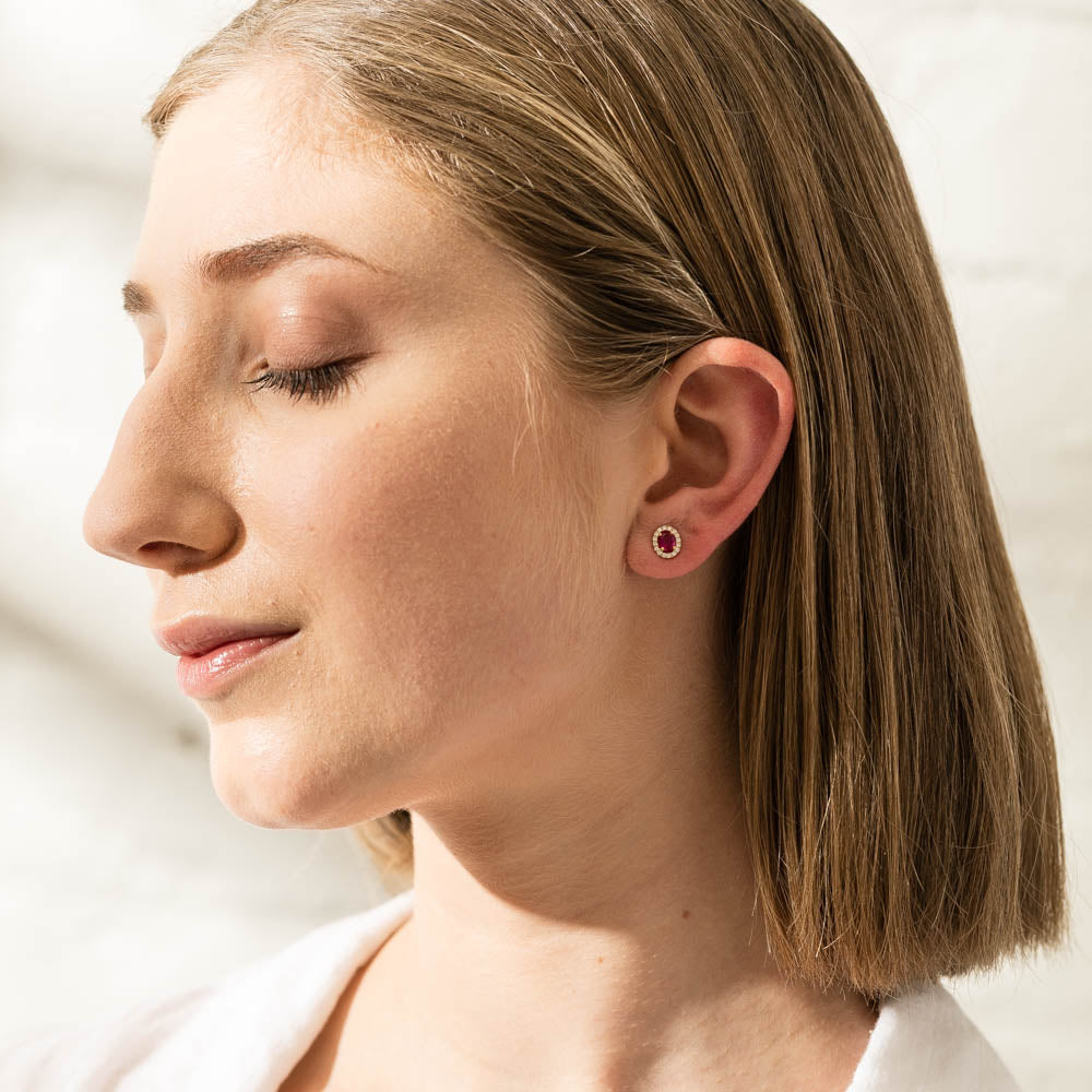 18ct yellow gold earrings featuring two oval faceted rubies, framed by a delicate halo of sparkling round brilliant cut diamonds.