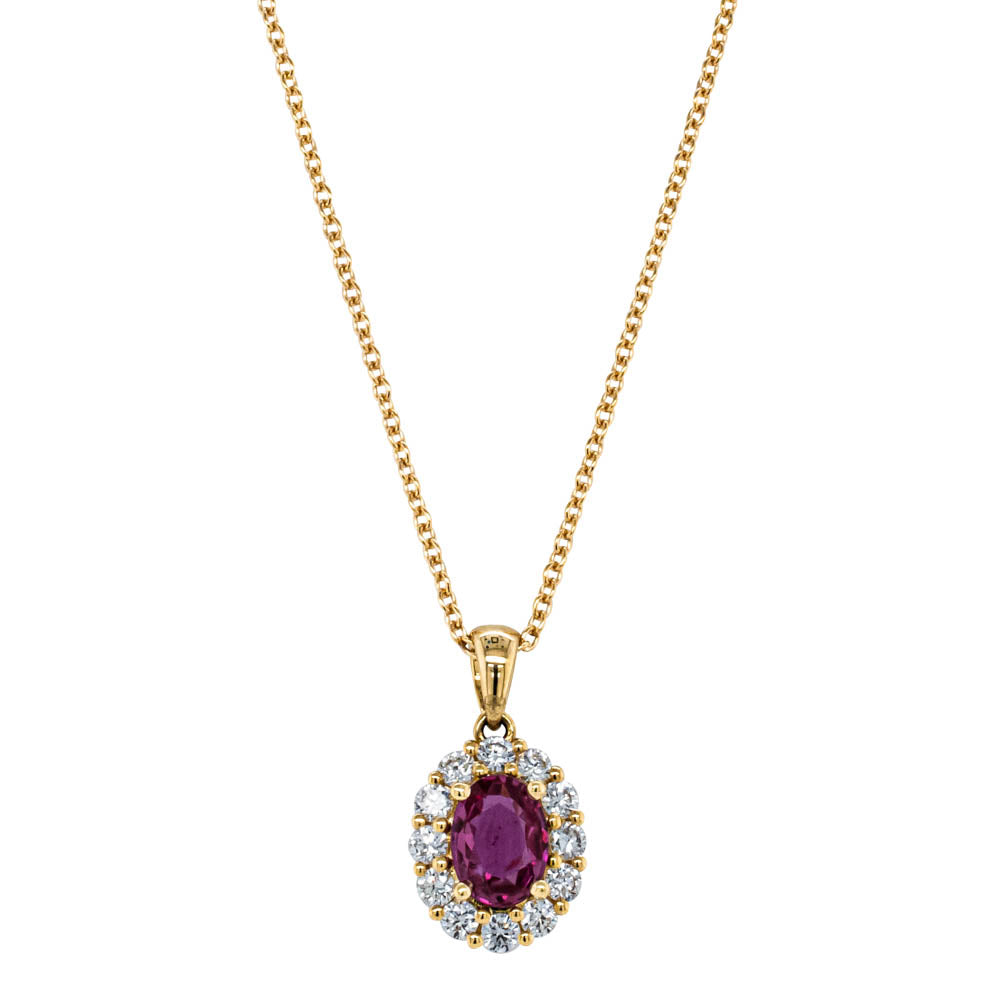 The queen of all gems, this beautiful ruby pendant boasts a stunning ruby in strong red, surrounded by a sparkling diamond frame.