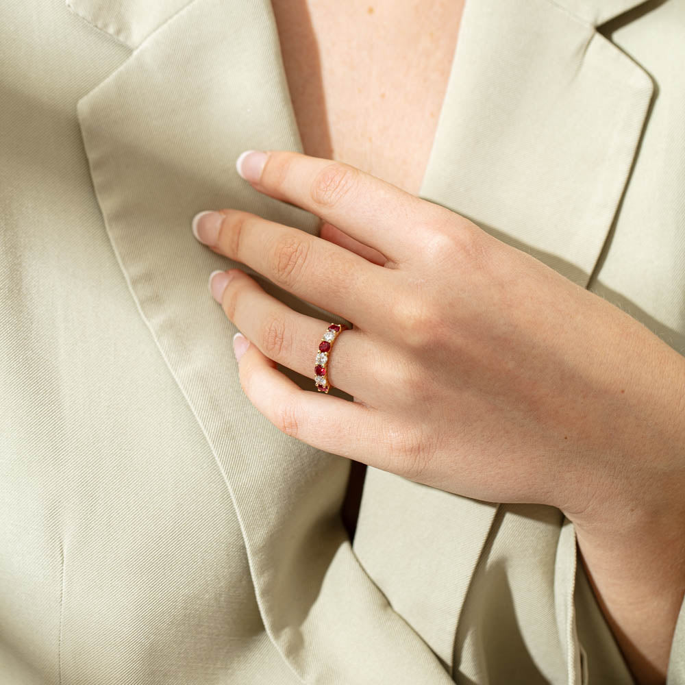 Crafted in 18ct yellow gold, this beautiful ring boasts four strong red rubies alternating with  sparkling round brilliant cut diamonds.