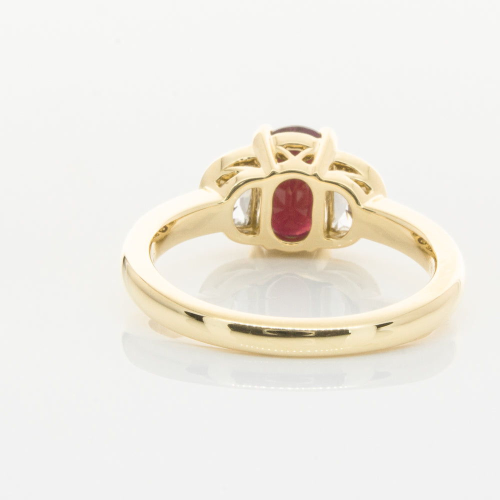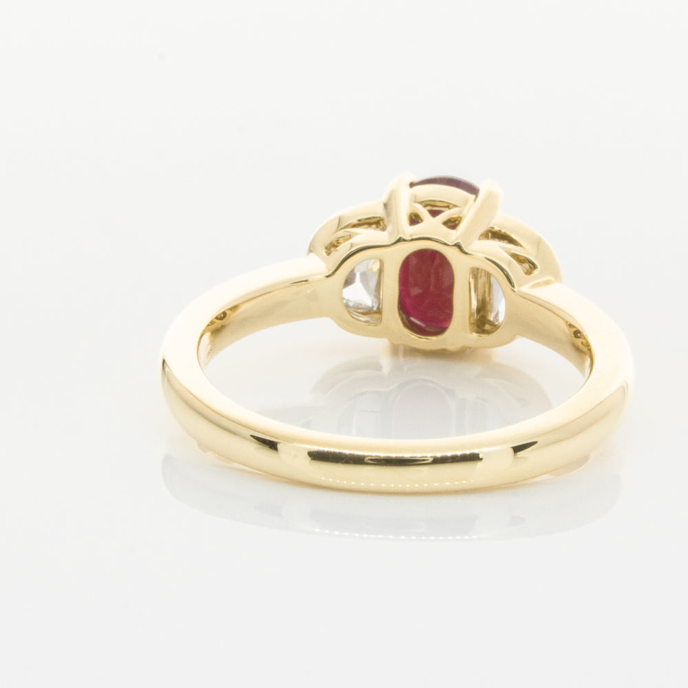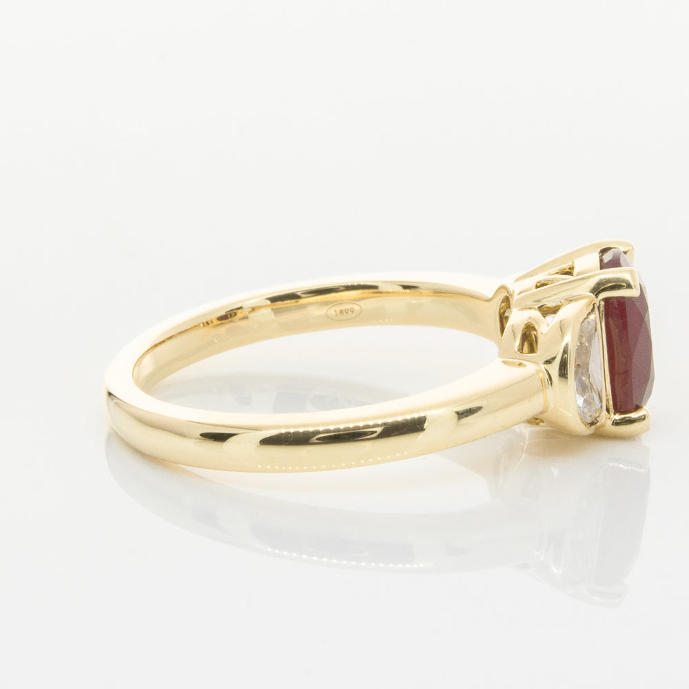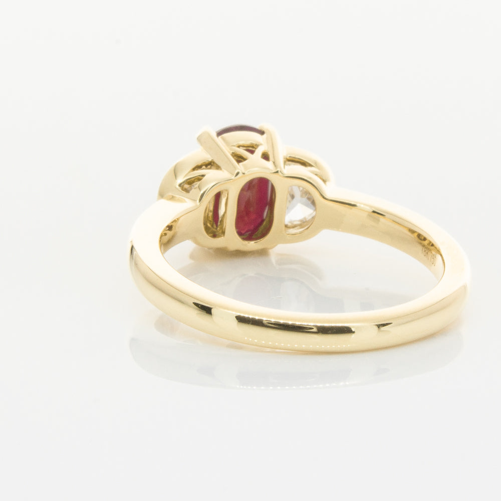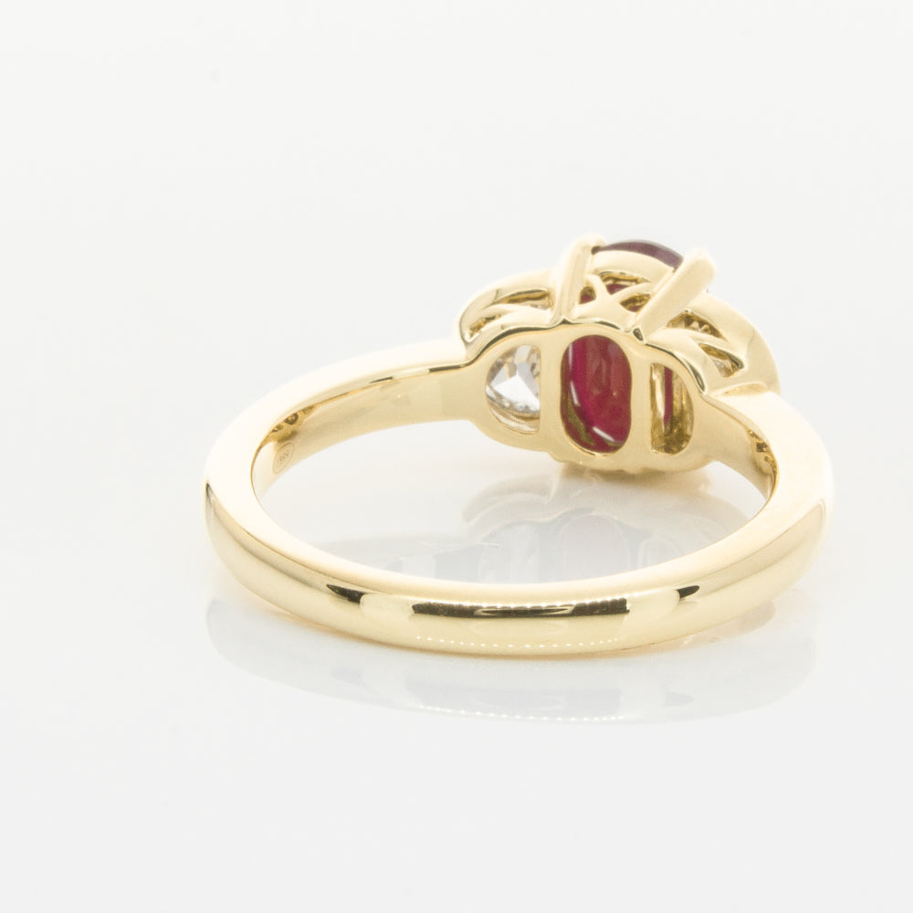 18ct Yellow Gold Oval Ruby & Diamond Bezel Set Three Stone Ring