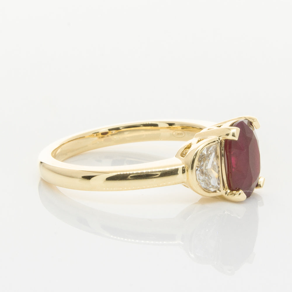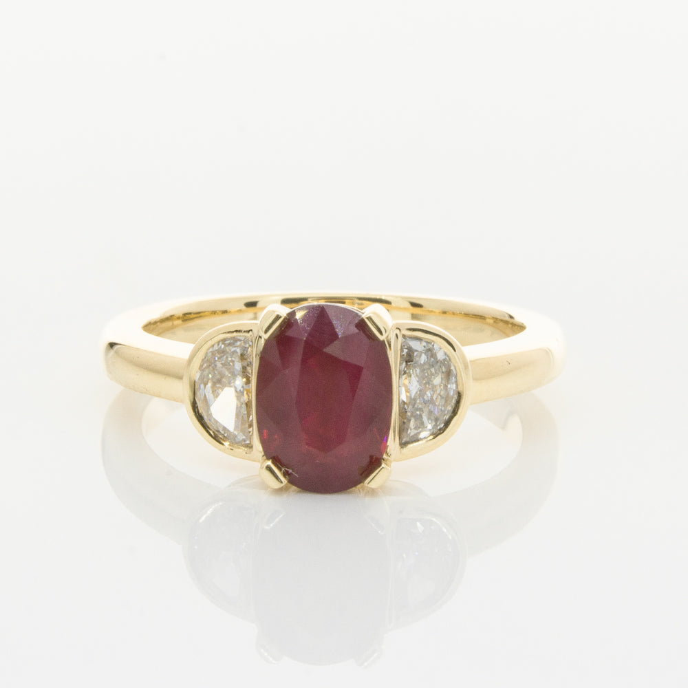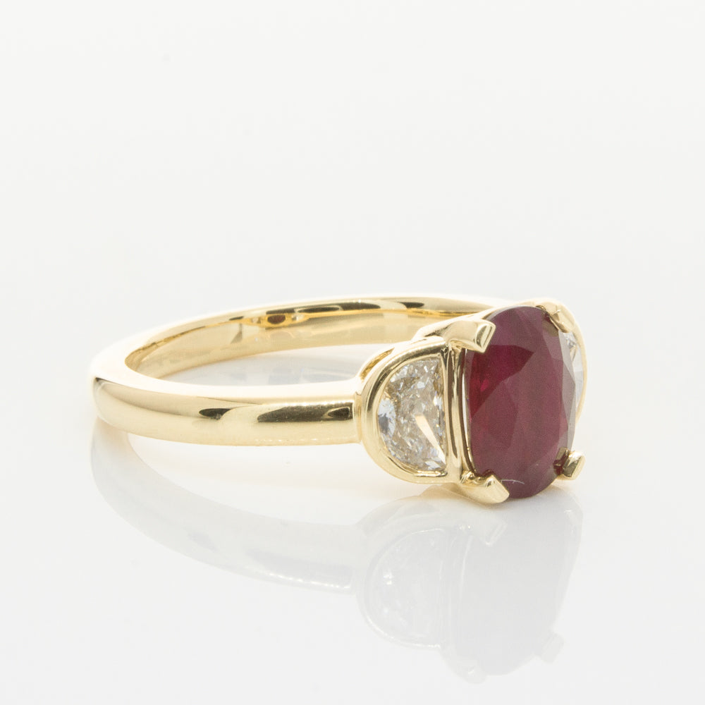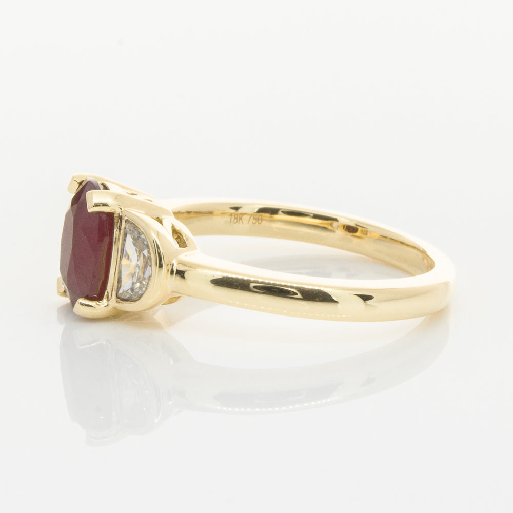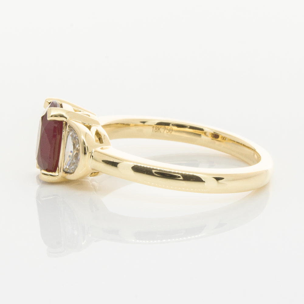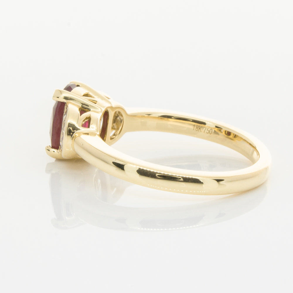 18ct Yellow Gold Oval Ruby & Diamond Bezel Set Three Stone Ring