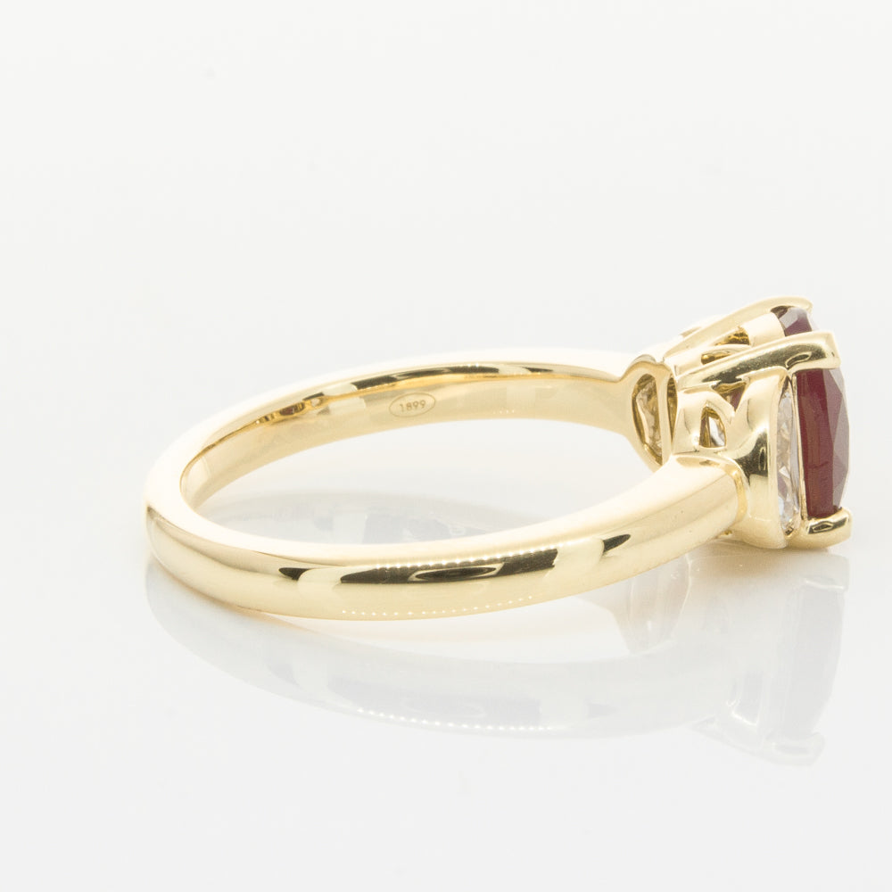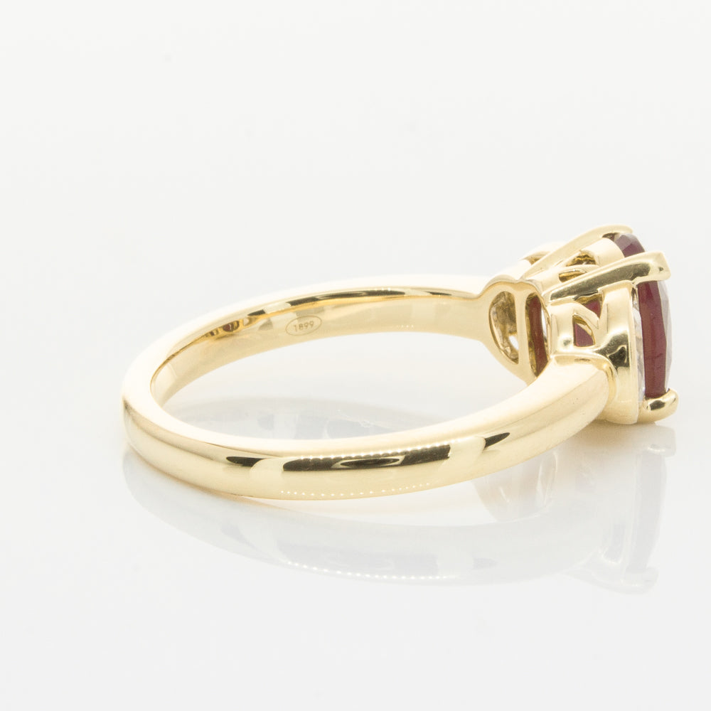 18ct yellow gold ring featuring one oval cut beautiful ruby framed by two dazzling diamonds.