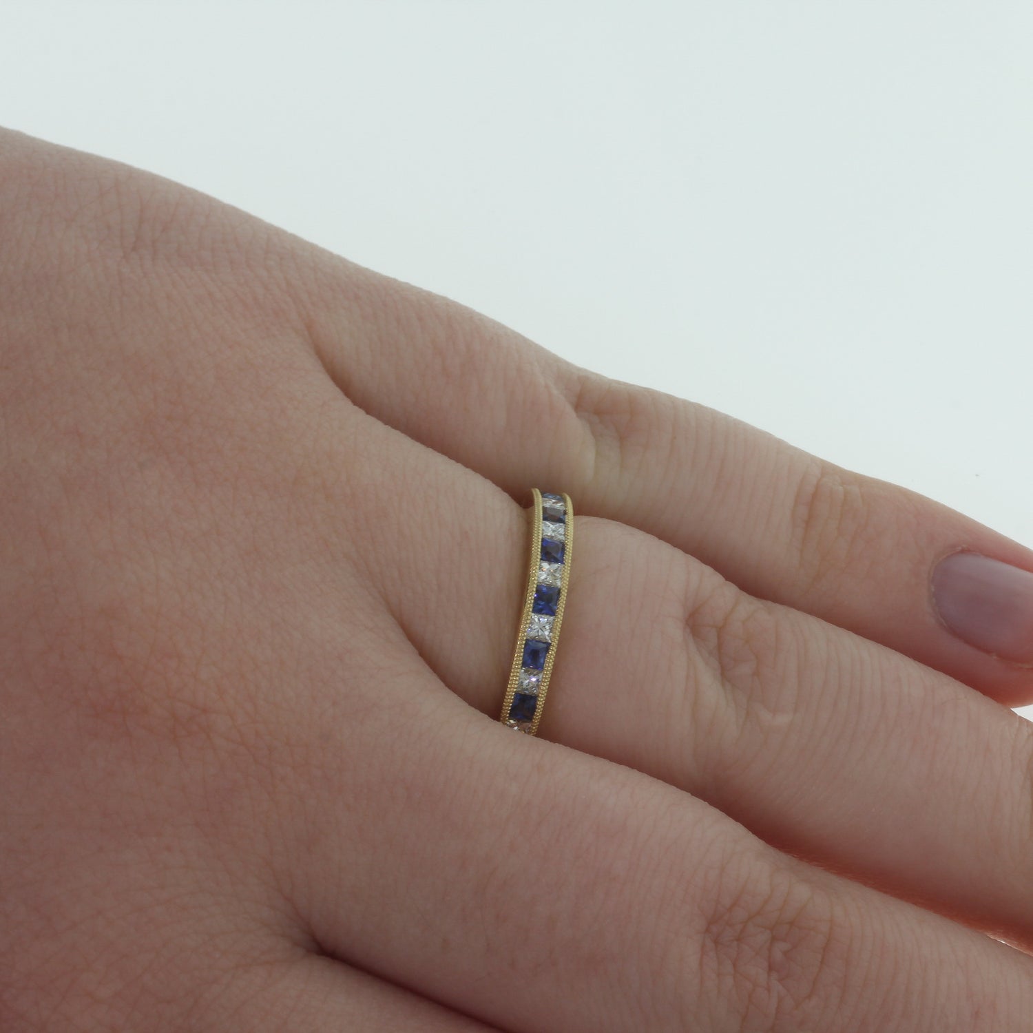 She will adore this classic diamond and sapphire band. This beautiful piece has been crafted in 18ct yellow gold and boasts princess cut sapphires and diamonds. Let the compliments begin with this timeless ring.