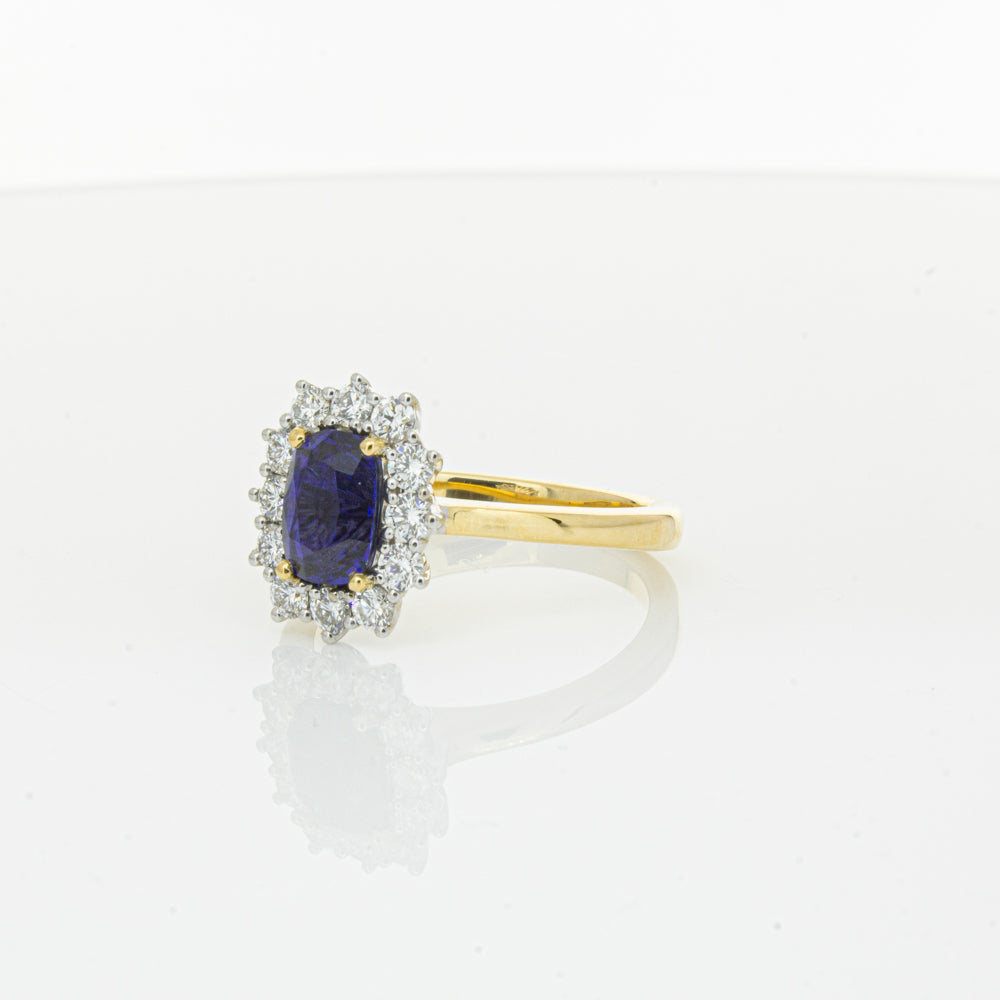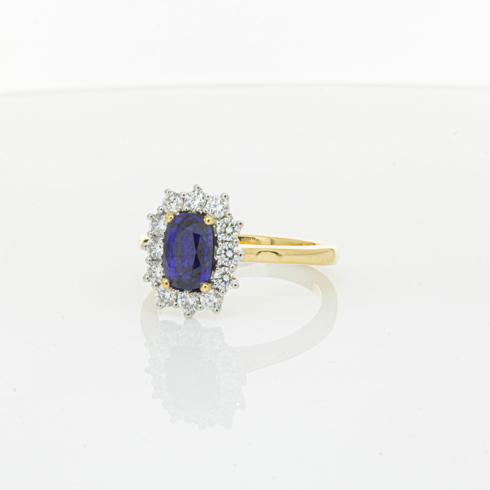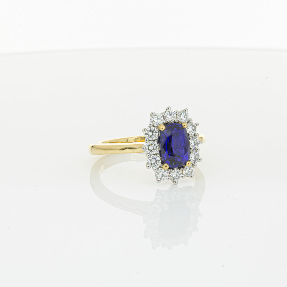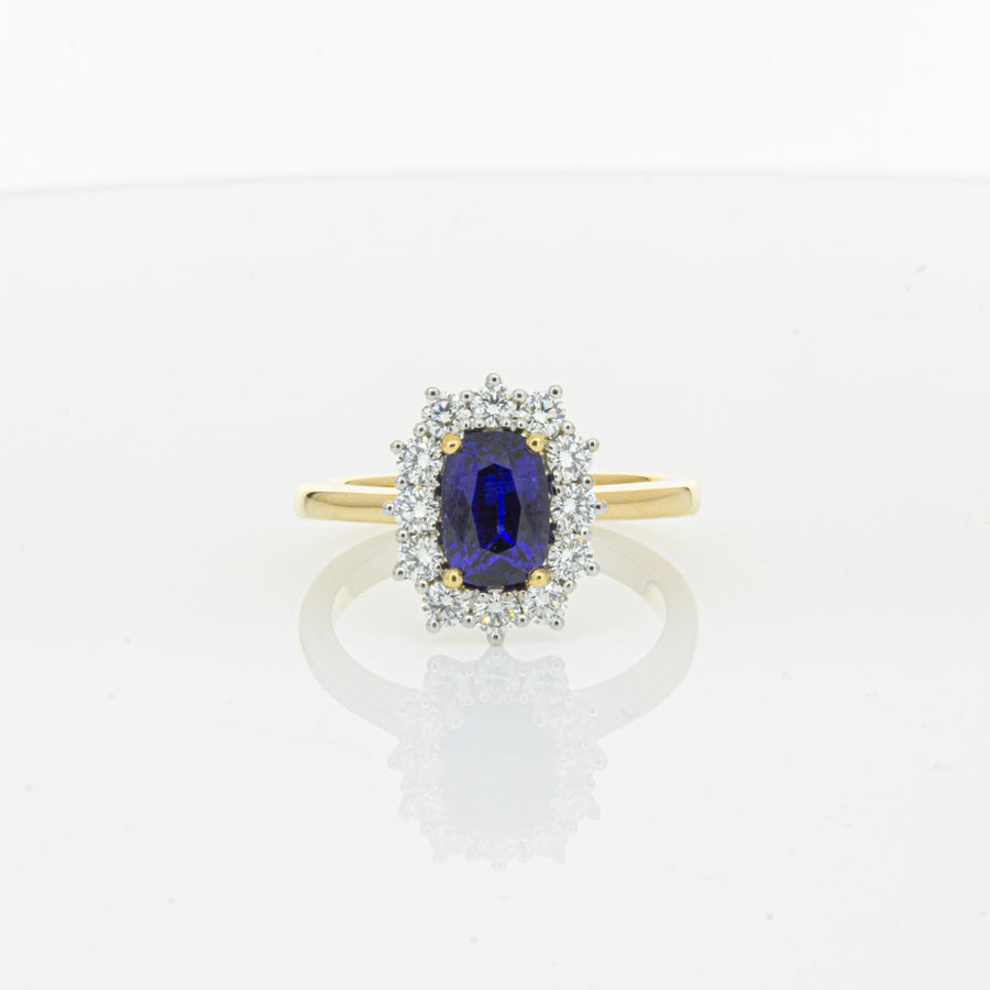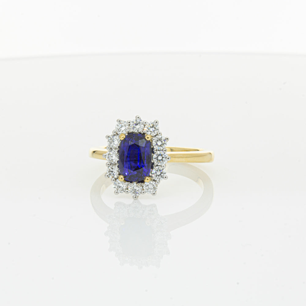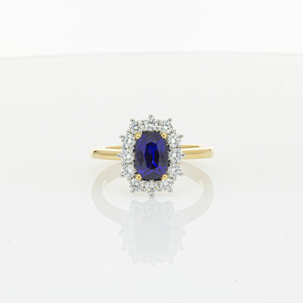 An update to a classic, this stunning cushion faceted halo sapphire Belle ring from our signature 1899 collection features a demurely tapered shank and diamond detailing on the halo. The beauty is in the details - this ring sparkles from every angle.