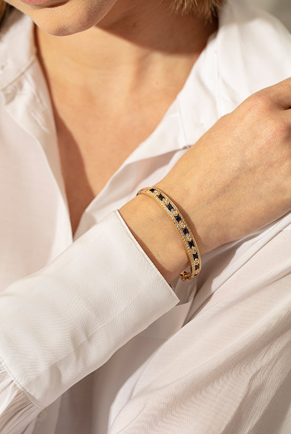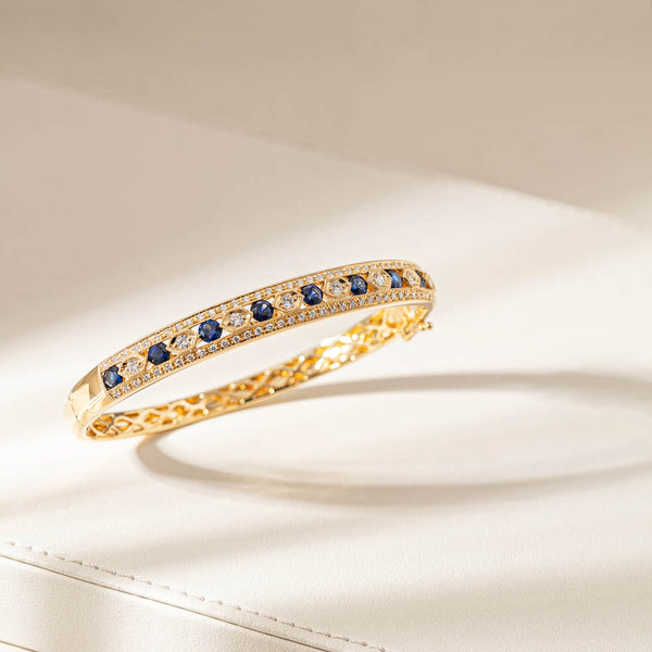 A modern look with classic timeless style, this 18ct yellow gold Cecelia bangle features deep blue sapphires alternating with round brilliant cut diamonds, set in precious 18ct yellow gold.