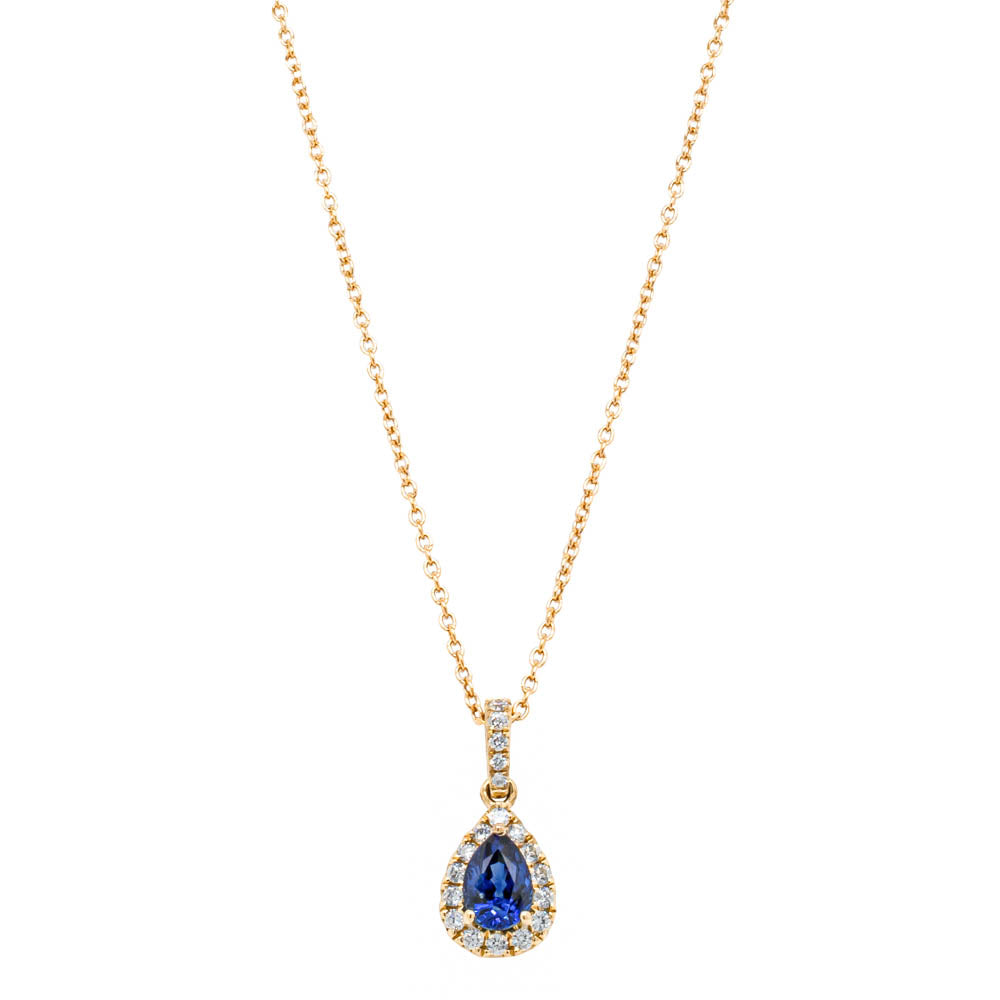 Stand out wearing this elegant sapphire and diamond halo pendant. Crafted beautifully in 18ct yellow gold this lovely pendant features a pear faceted sapphire framed by a dazzling diamond cluster.