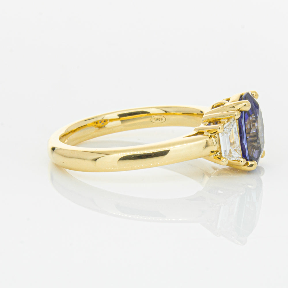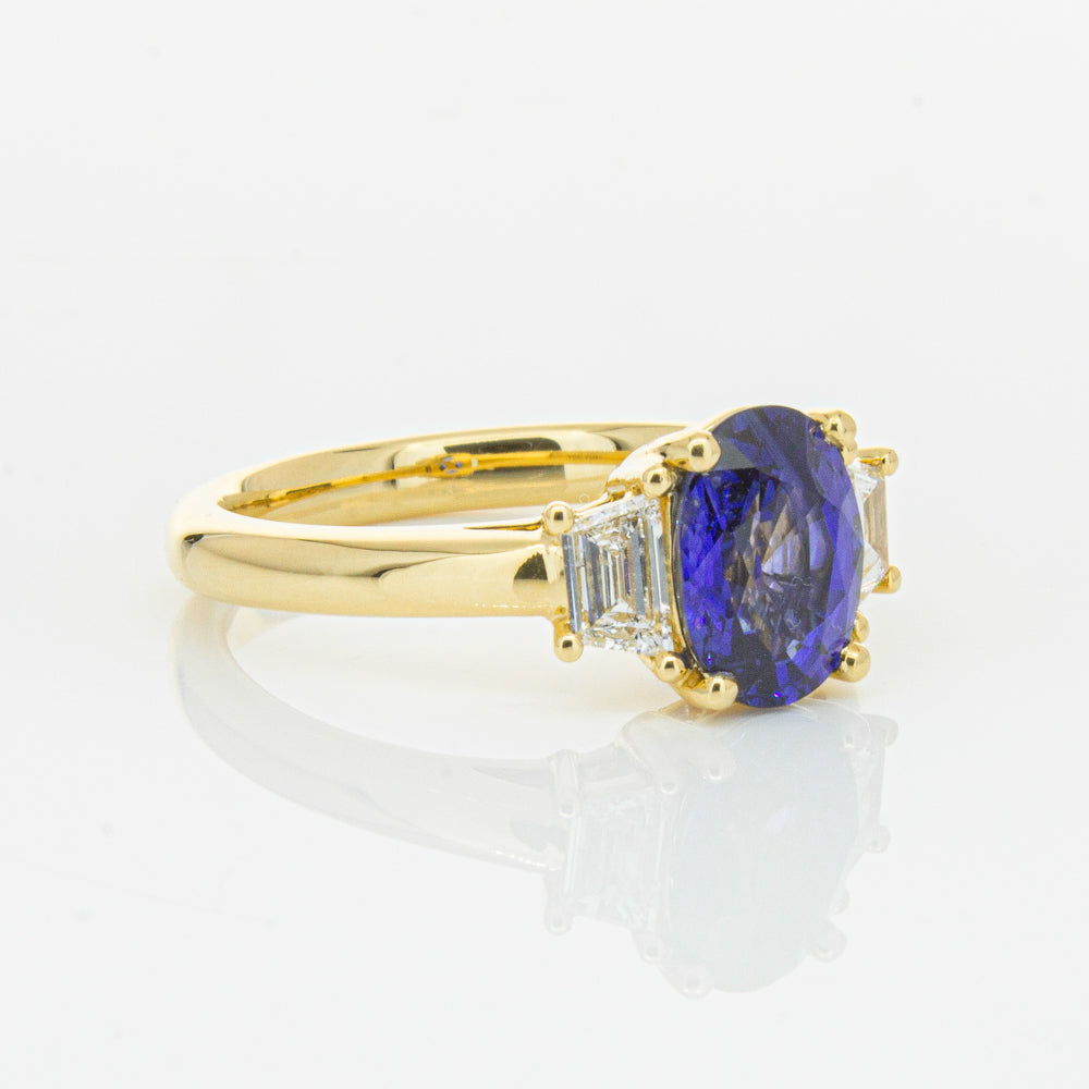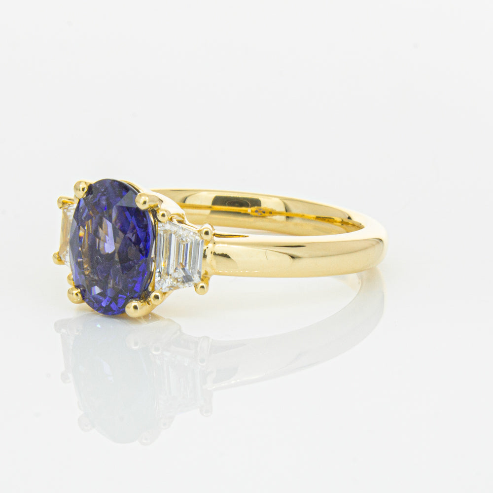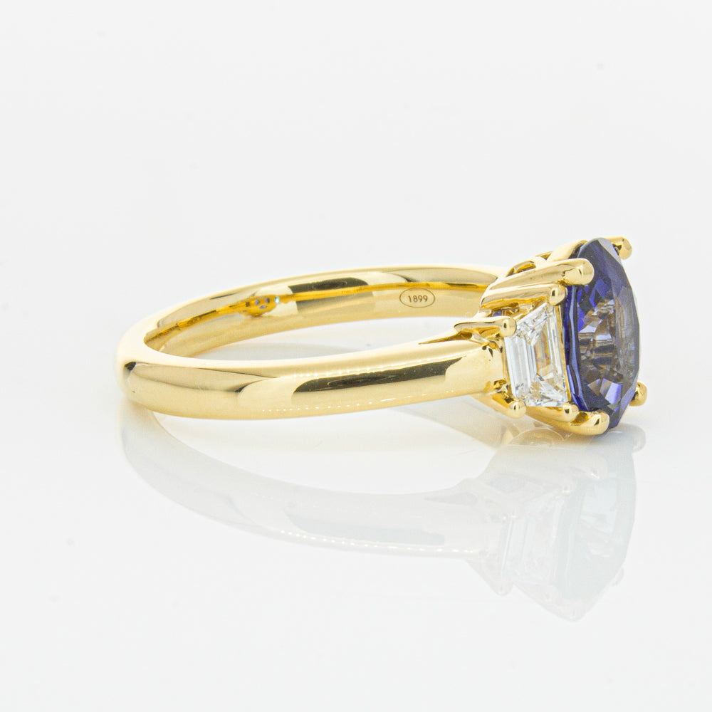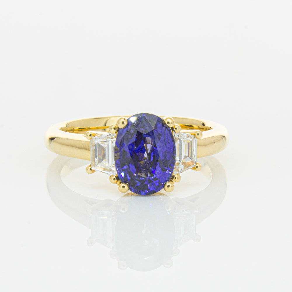 This exquisite ring showcases a stunning sapphire, radiating the desirable royal blue hue. The central sapphire is elegantly complemented by matched trapezoid step-cut diamonds on each side, adding a touch of brilliance and sophistication. The ring is meticulously crafted in solid 18ct yellow gold and exemplifies the harmonious blend of understated design, luxurious materials and expert craftsmanship.