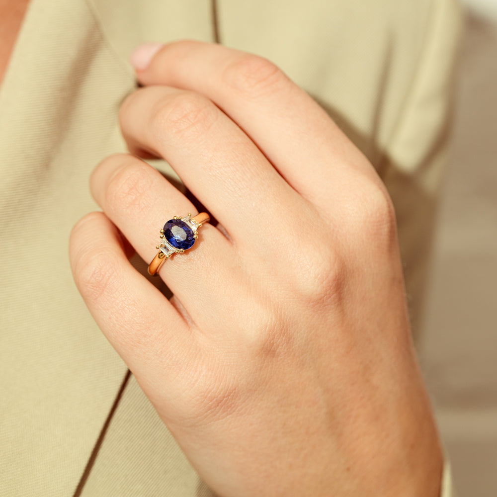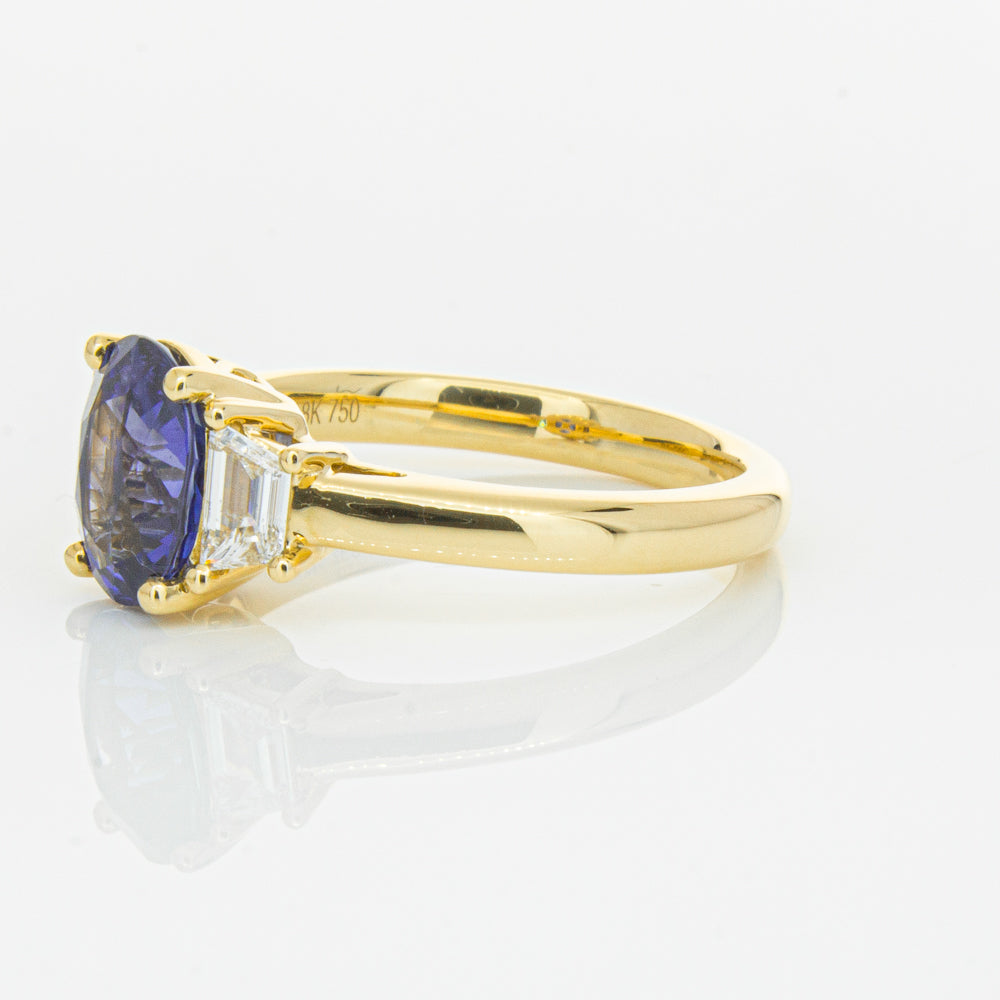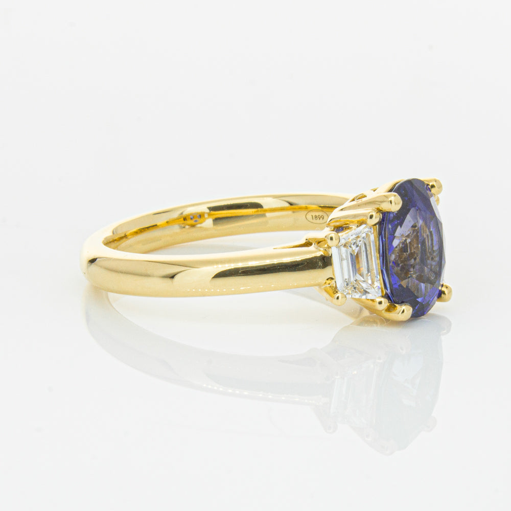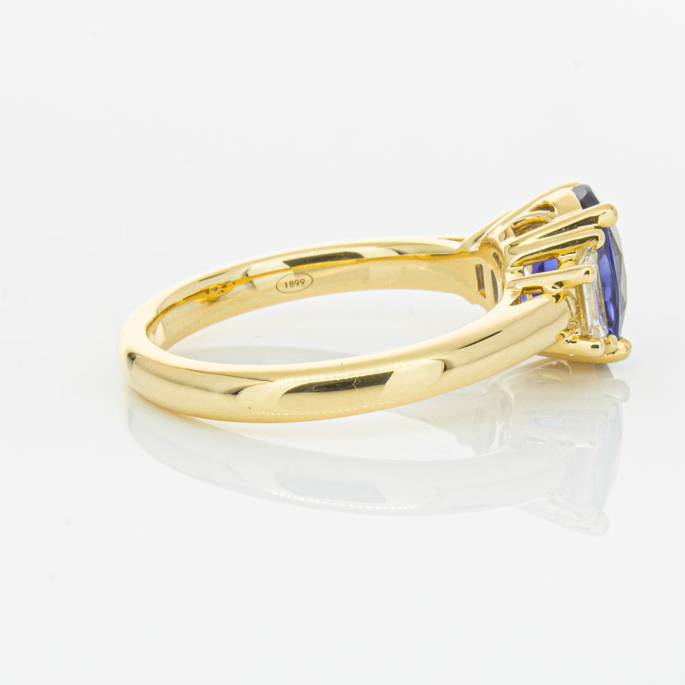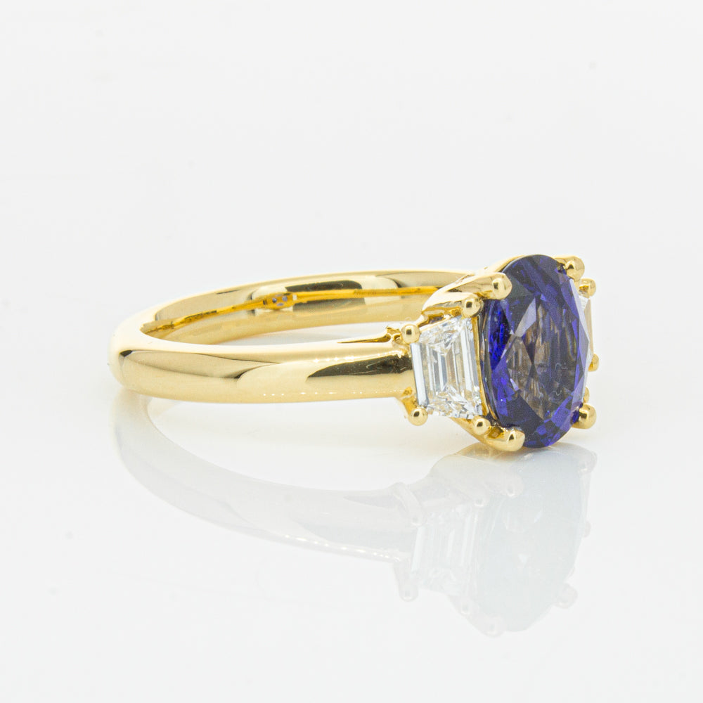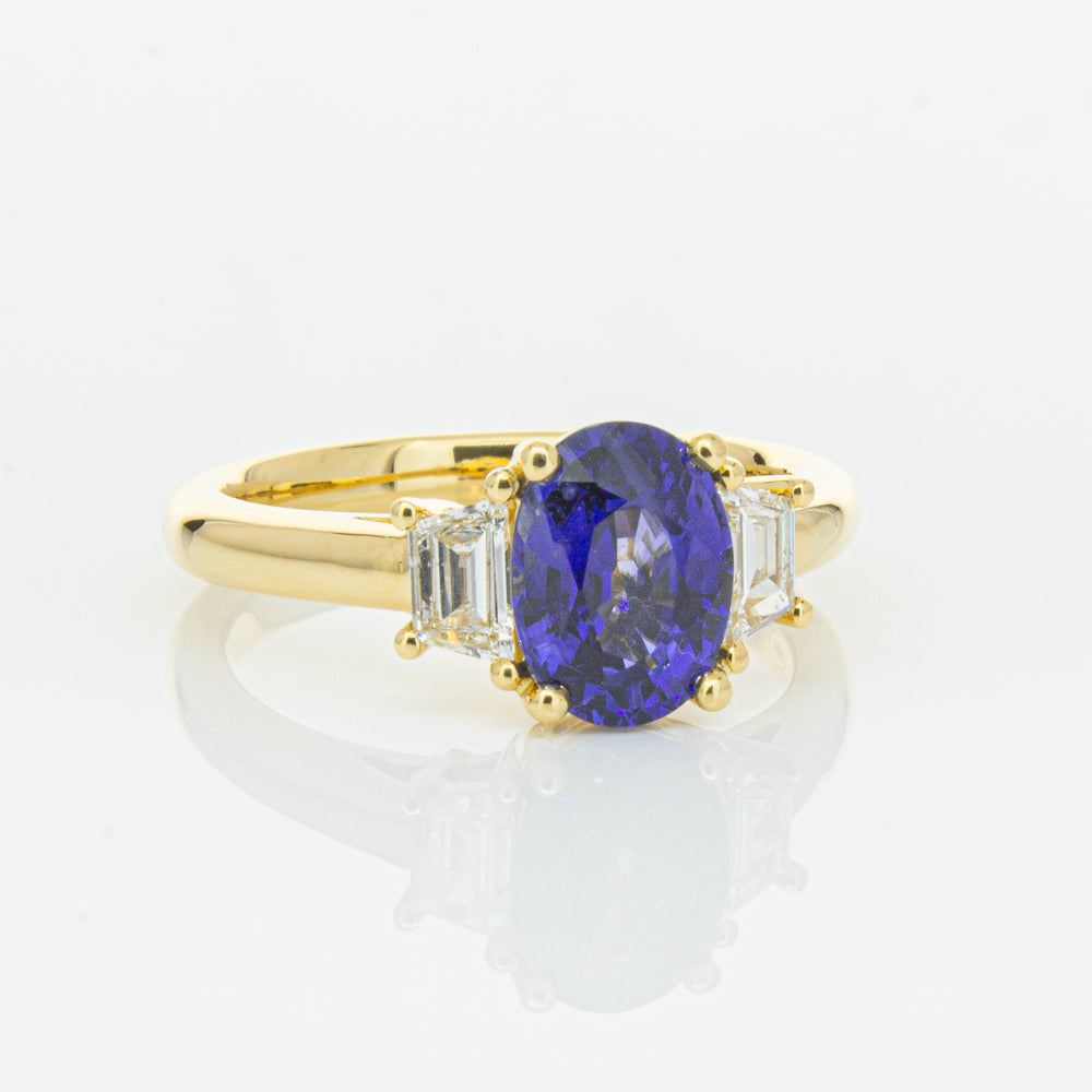 This exquisite ring showcases a stunning sapphire, radiating the desirable royal blue hue. The central sapphire is elegantly complemented by matched trapezoid step-cut diamonds on each side, adding a touch of brilliance and sophistication. The ring is meticulously crafted in solid 18ct yellow gold and exemplifies the harmonious blend of understated design, luxurious materials and expert craftsmanship.