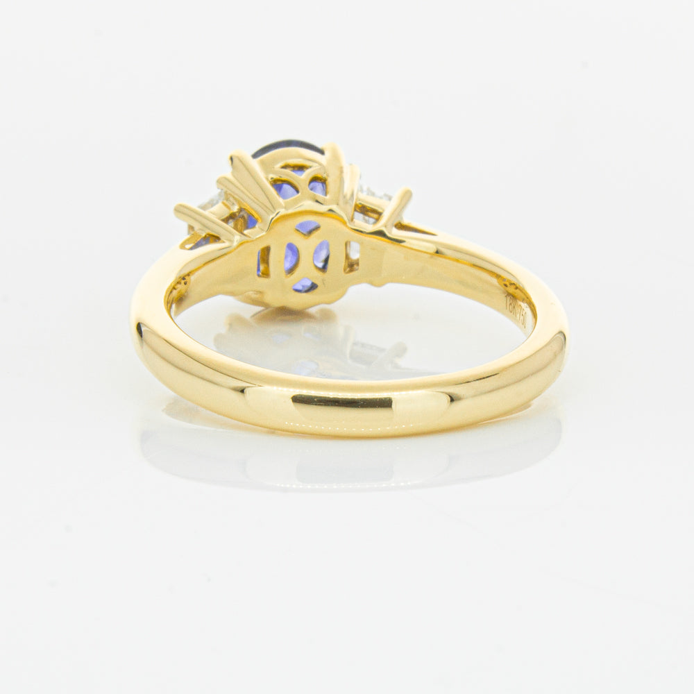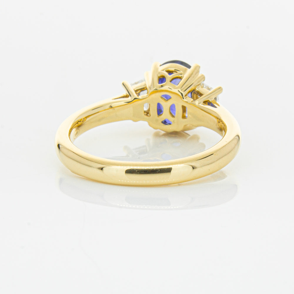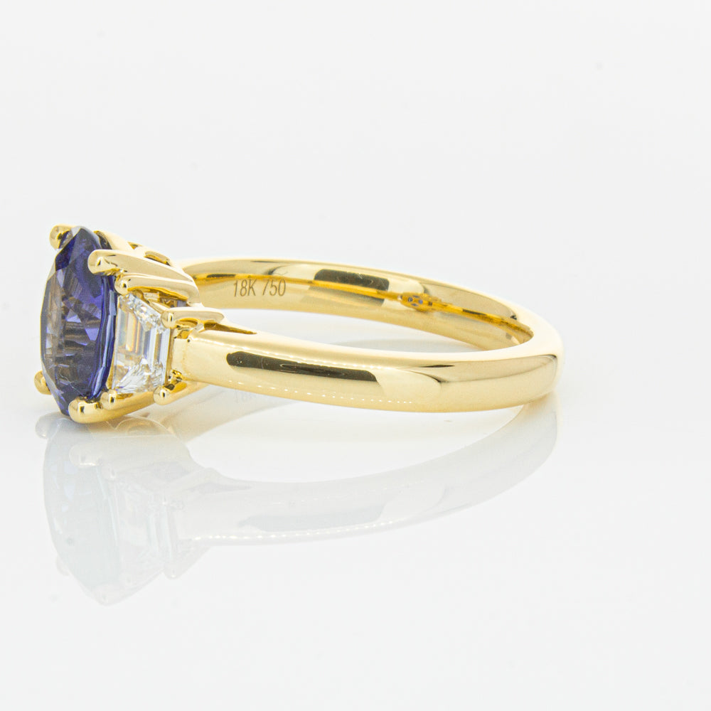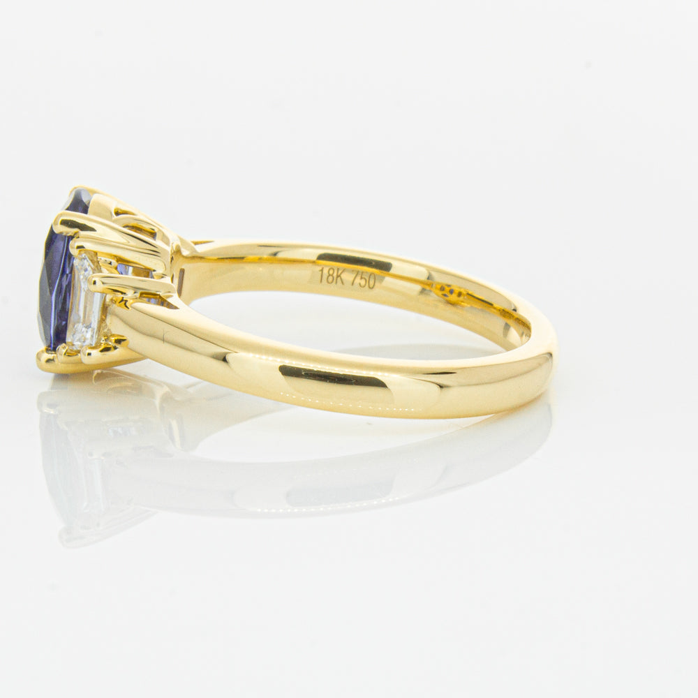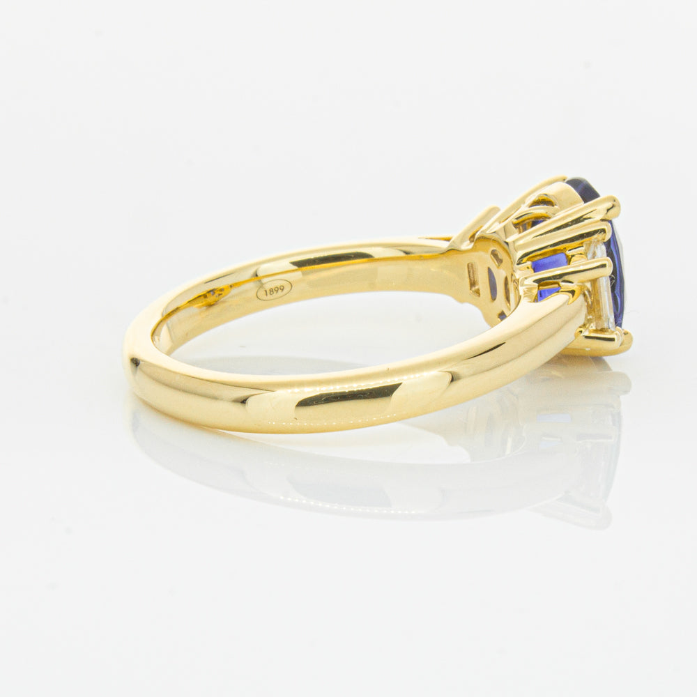 This exquisite ring showcases a stunning sapphire, radiating the desirable royal blue hue. The central sapphire is elegantly complemented by matched trapezoid step-cut diamonds on each side, adding a touch of brilliance and sophistication. The ring is meticulously crafted in solid 18ct yellow gold and exemplifies the harmonious blend of understated design, luxurious materials and expert craftsmanship.