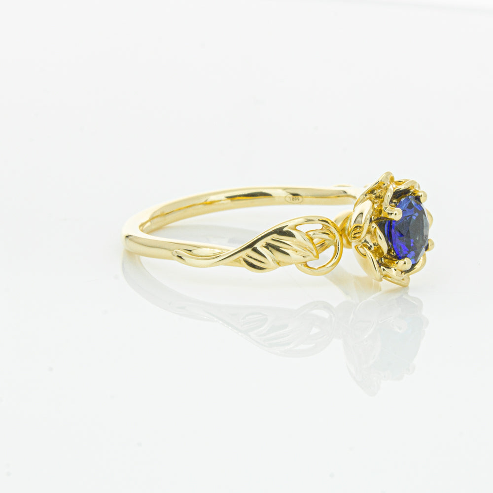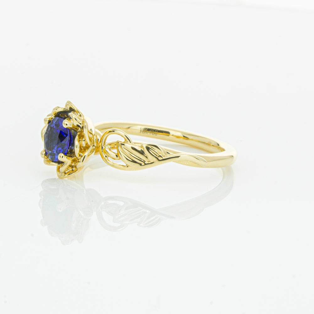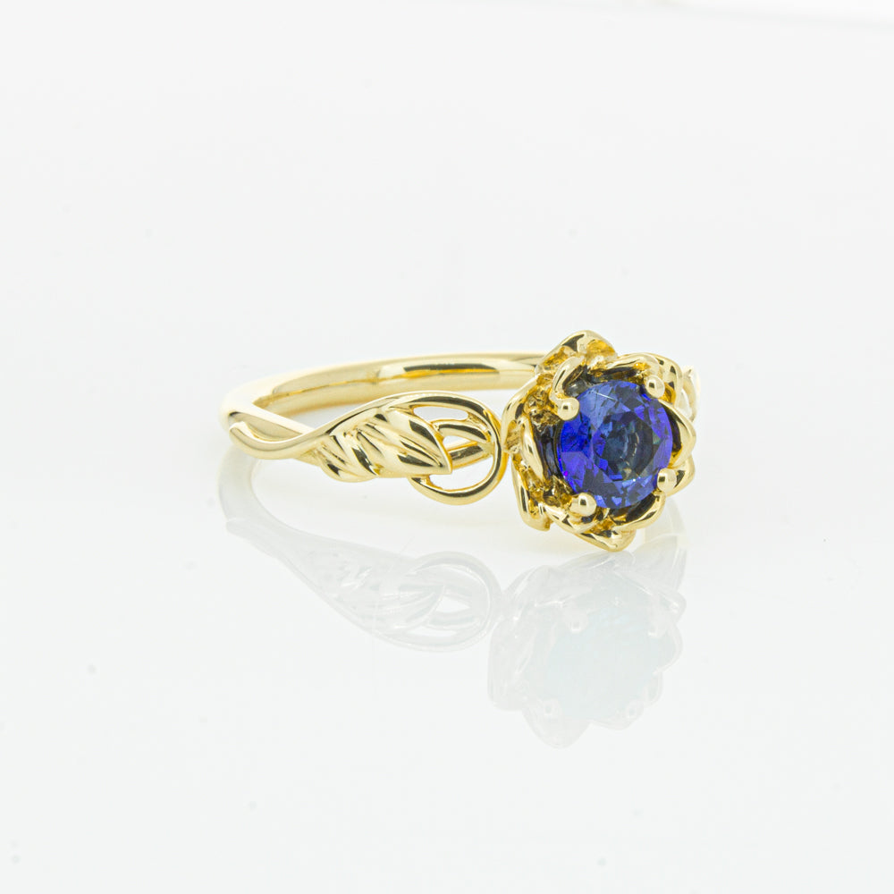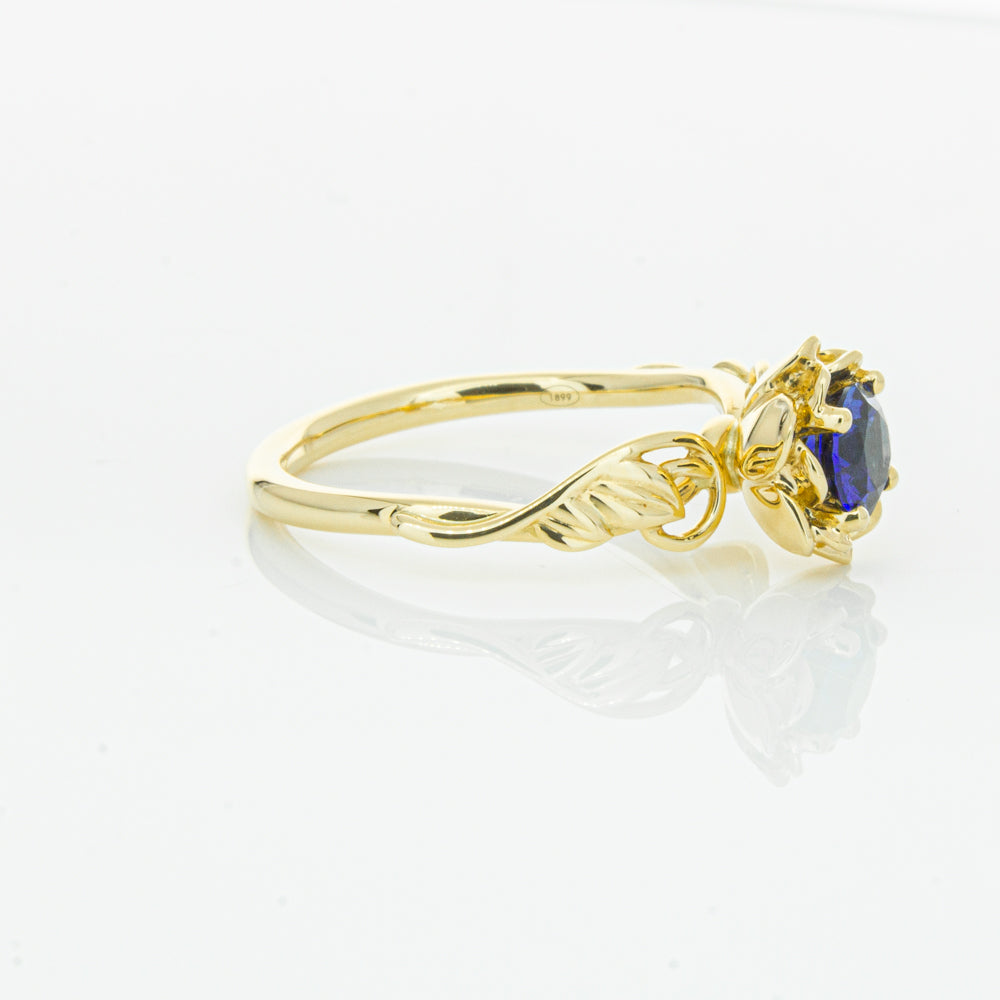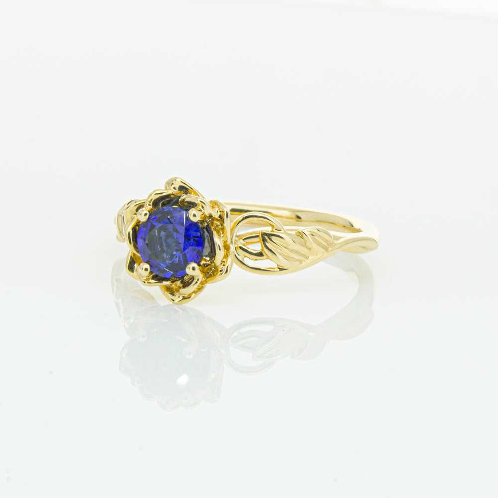 From our Snowflake collection, hand finished in 18ct yellow gold, this stunning ring has a round faceted sapphire on a rounded shank with shoulders decorated with scrolls and leaves.