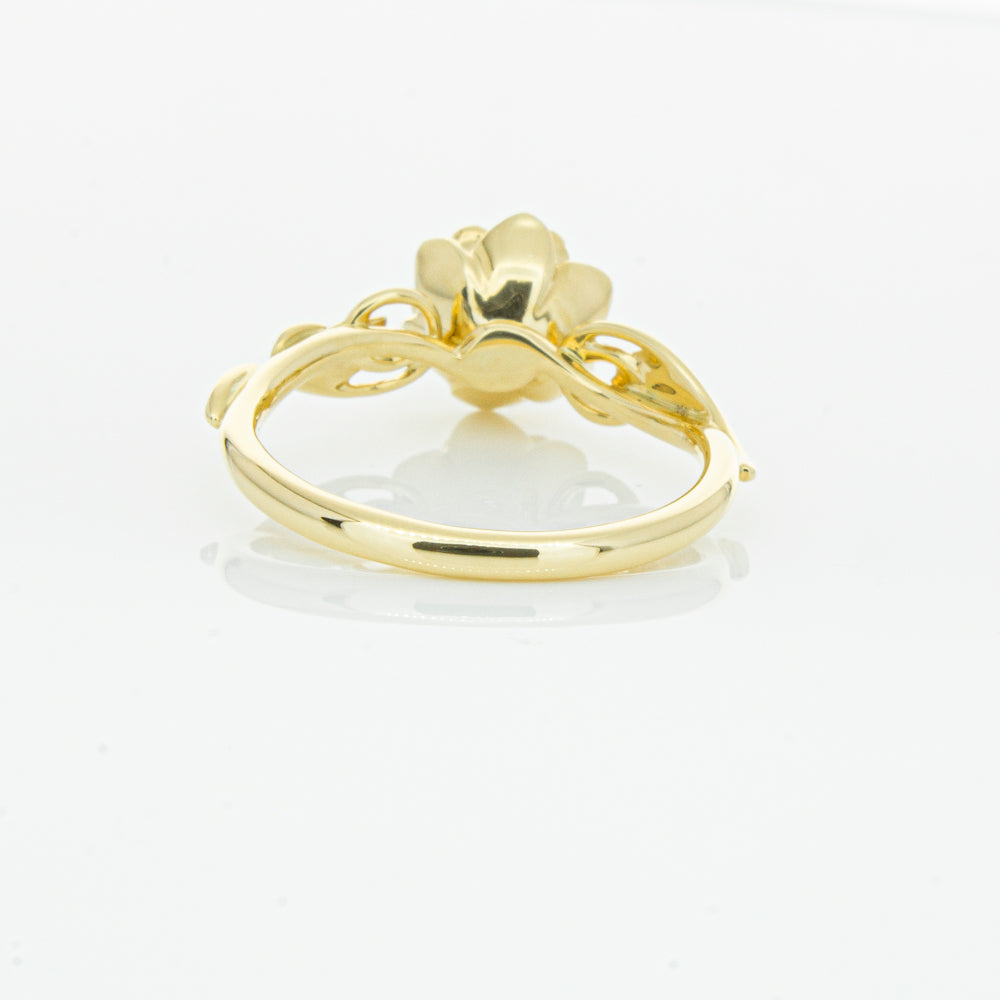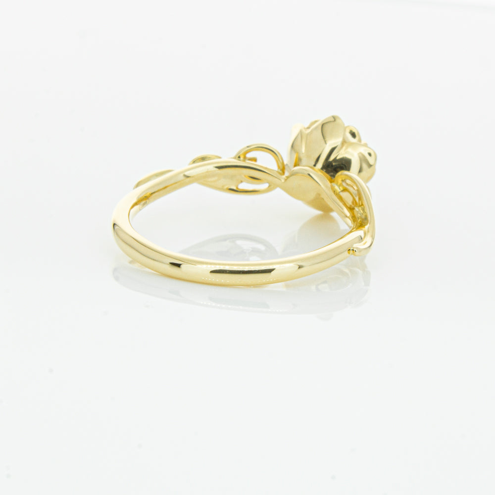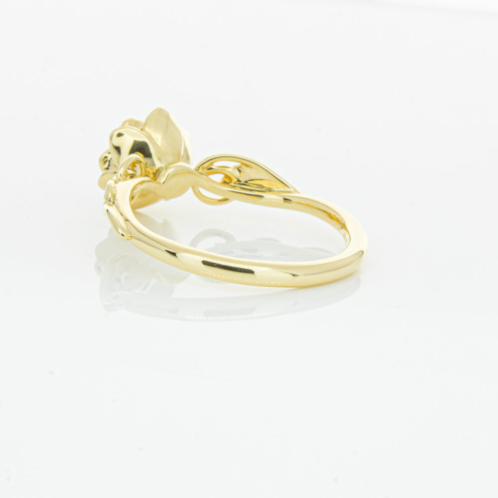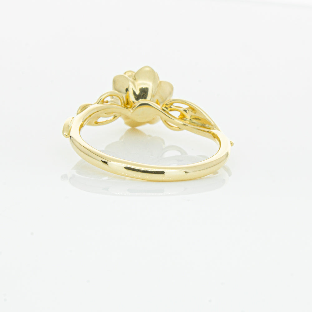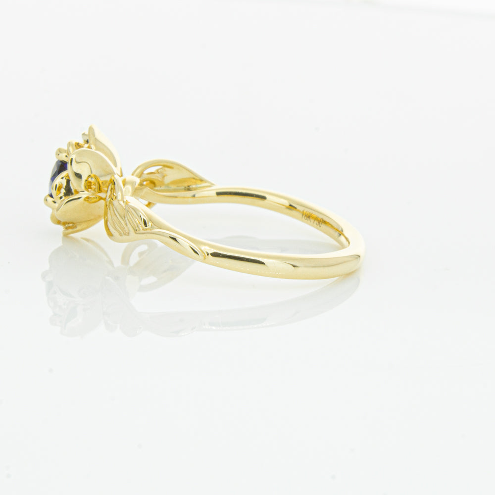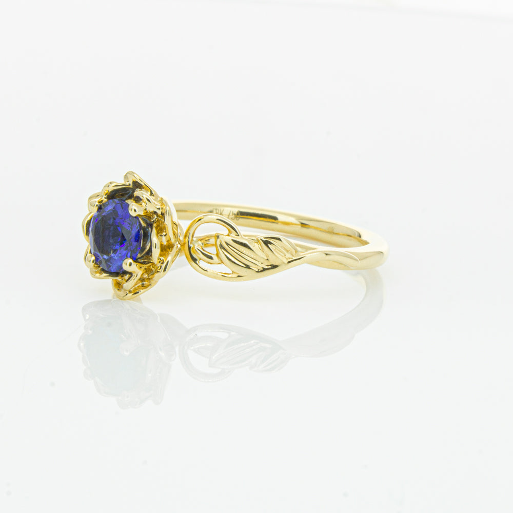 From our Snowflake collection, hand finished in 18ct yellow gold, this stunning ring has a round faceted sapphire on a rounded shank with shoulders decorated with scrolls and leaves.