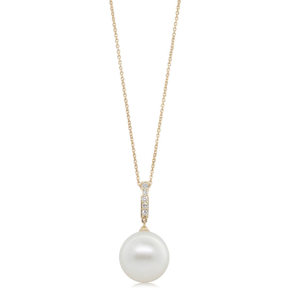 Irresistible elegance, this beautiful pearl pendant will have her glowing! Carefully set in luxurious 18ct yellow gold, this precious piece boasts an array of twinkling diamonds and one luminous drop shaped south sea pearl. Say it simply with this elegant treasure.